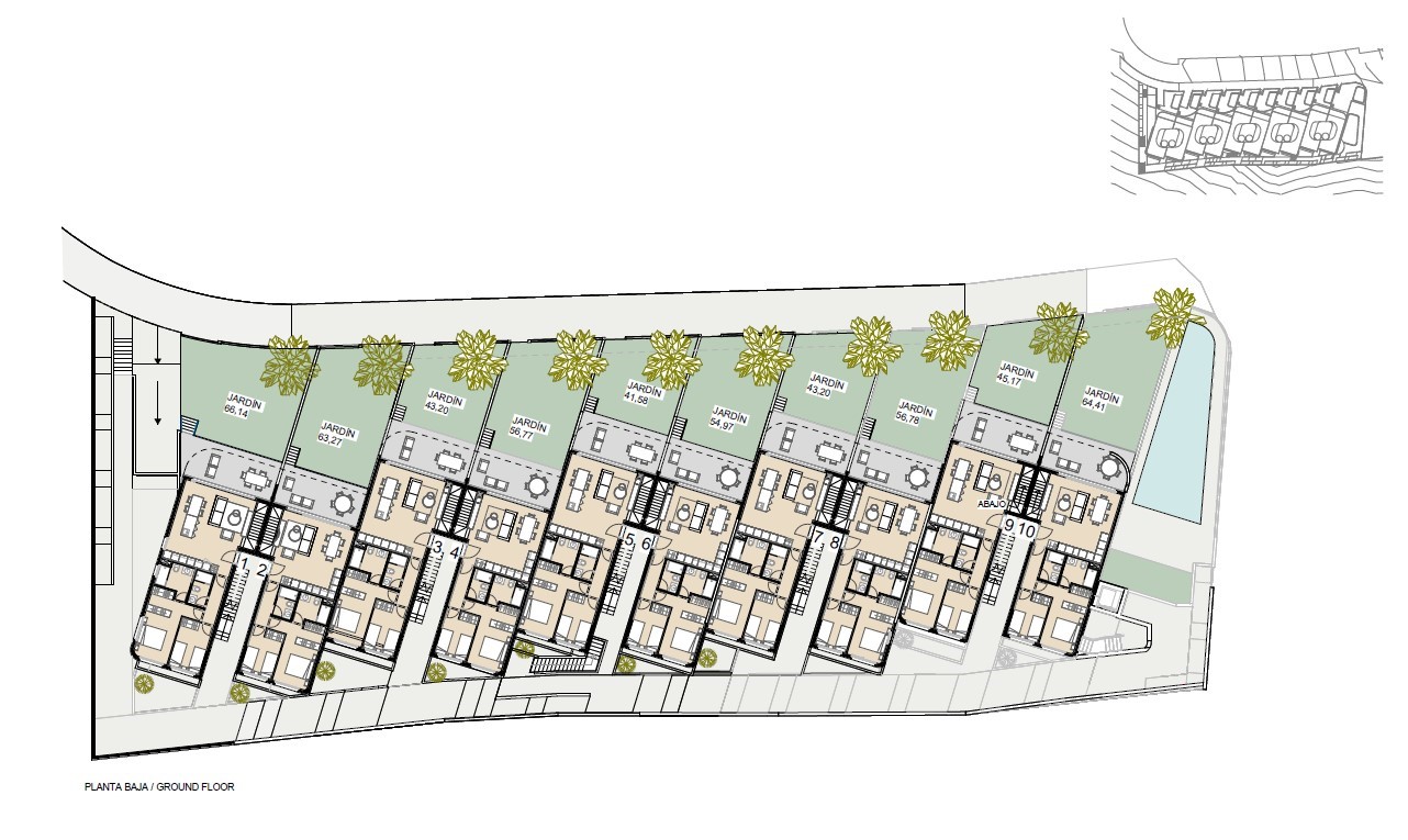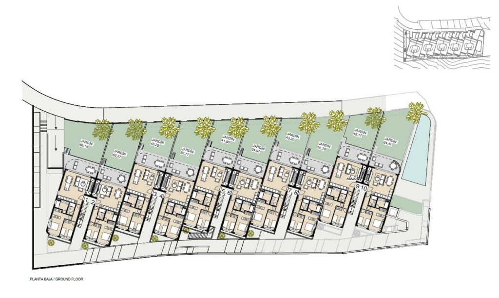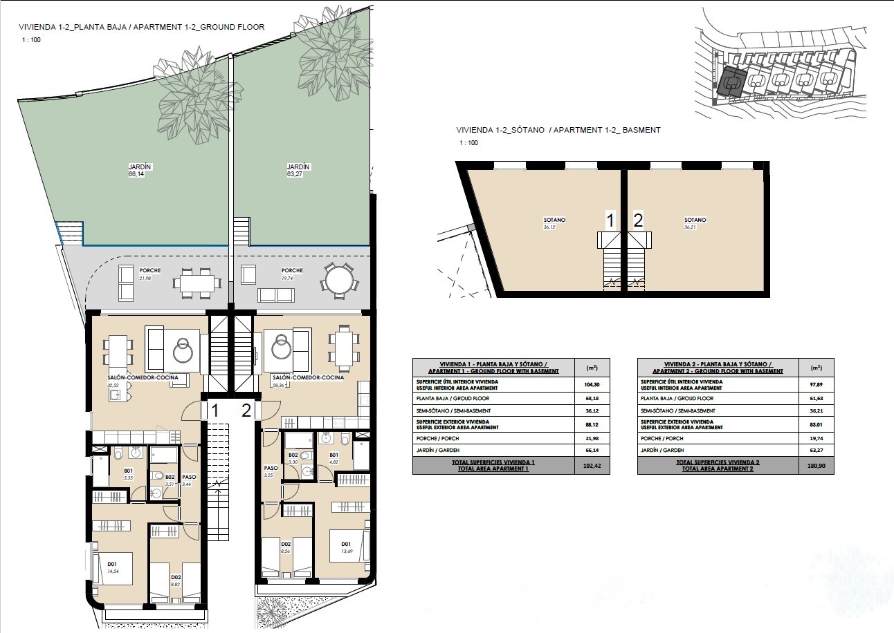 Leilighetene i 1. etasje har en stor hage med havutsikt og god plass til et privat basseng, samt en halvkjeller perfekt for å legge til flere soverom eller oppholdsrom. Alle leiligheter på bakkeplan har halvkjeller med forhåndsinstallasjon for ekstra bad. Man kan lage 2 ekstra soverom, så det kan være en bolig med 4 soverom/3 bad. Hagen har forhåndsinstallasjon for svømmebasseng eller jacuzzi. Det er nesten et hus, men med en nabo ovenpå.