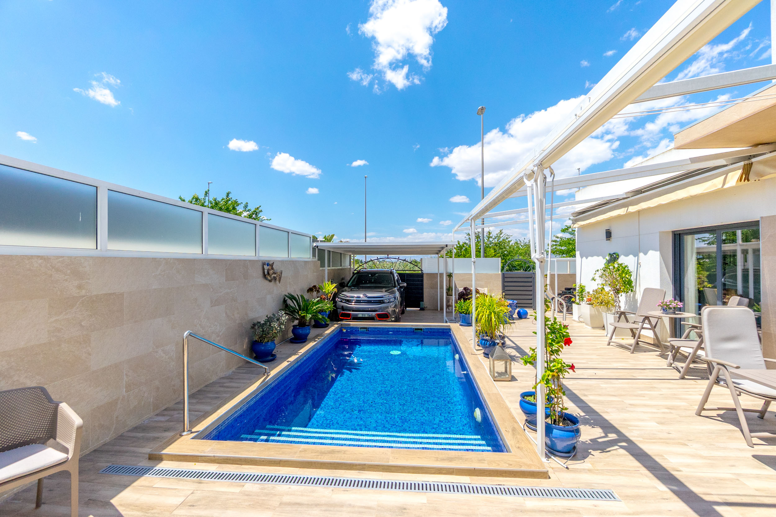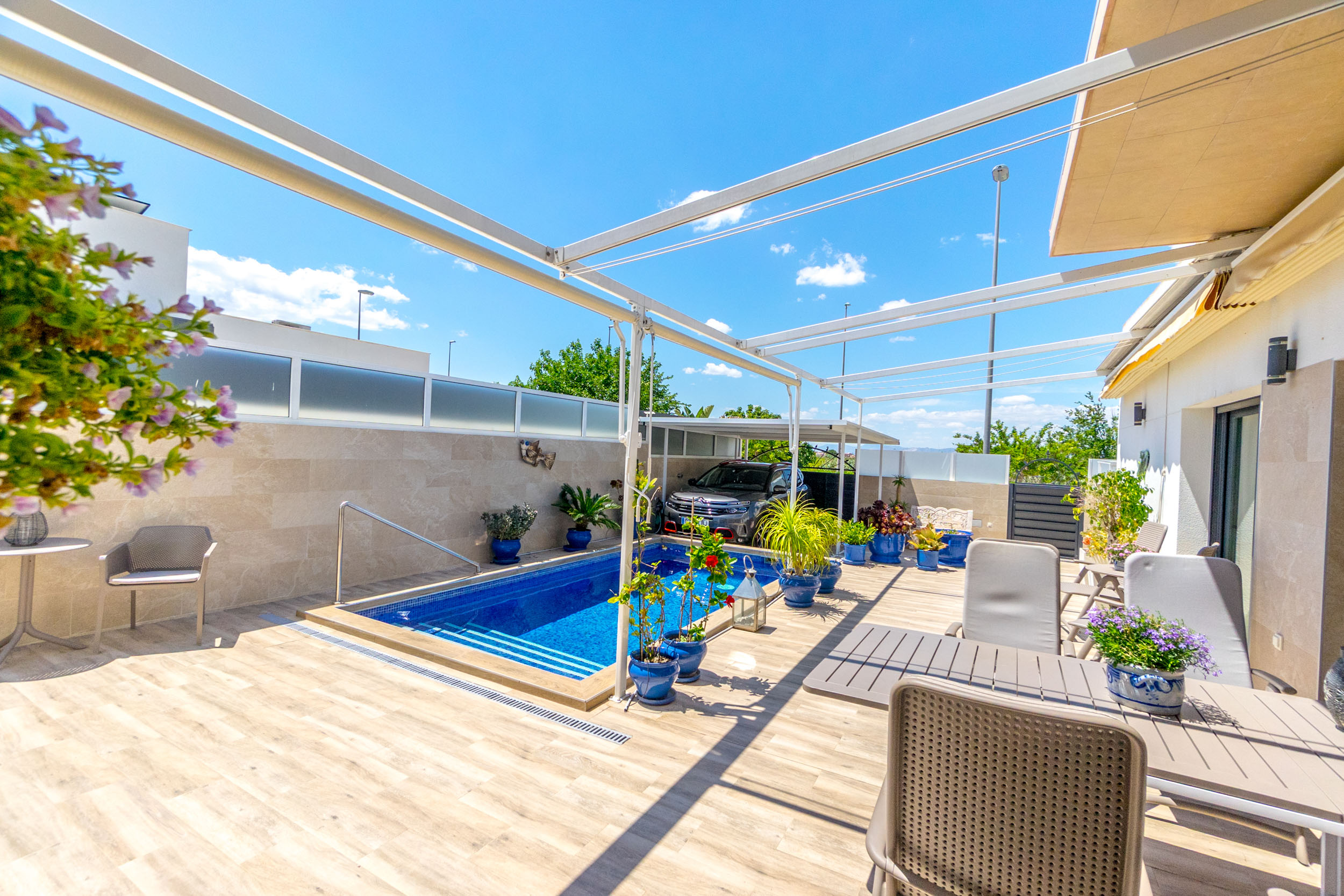 Hagen er flislagt og det er montert markiser. Det er også en carport og en bod.