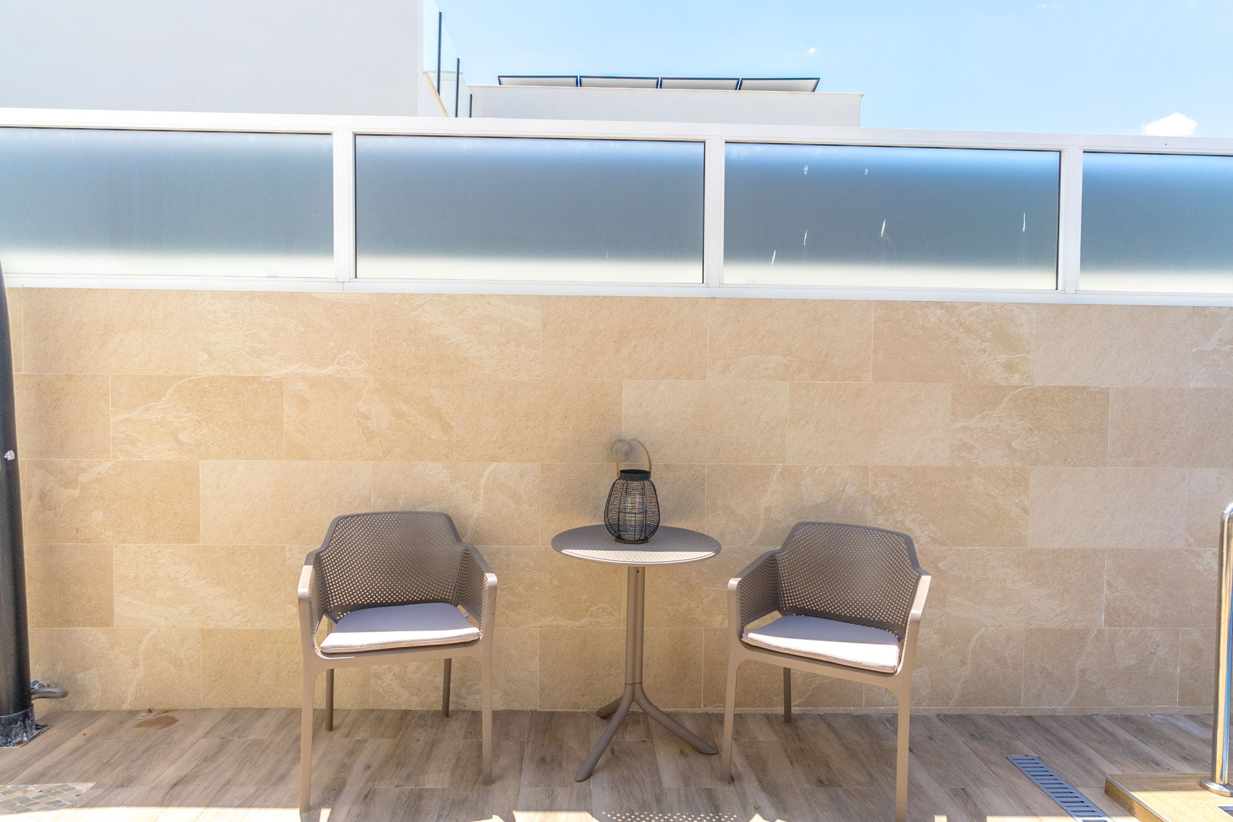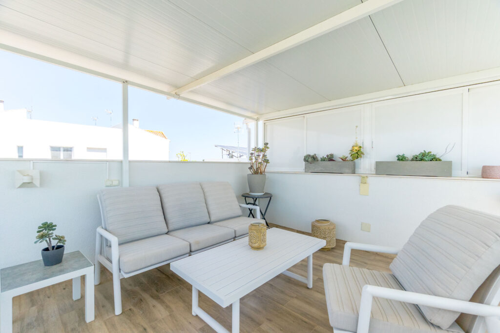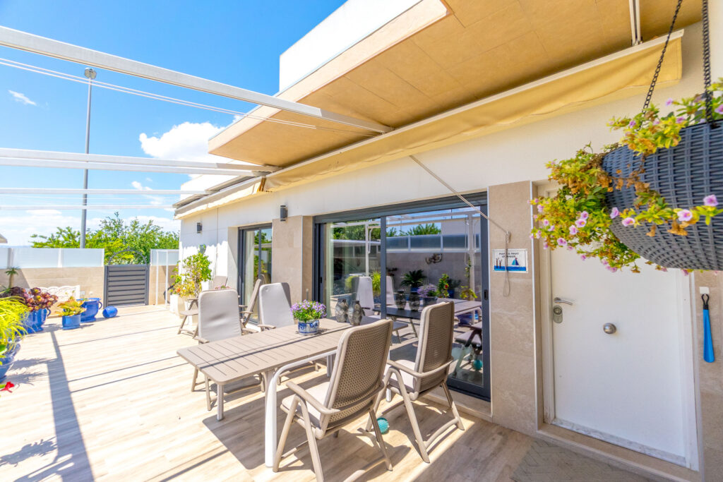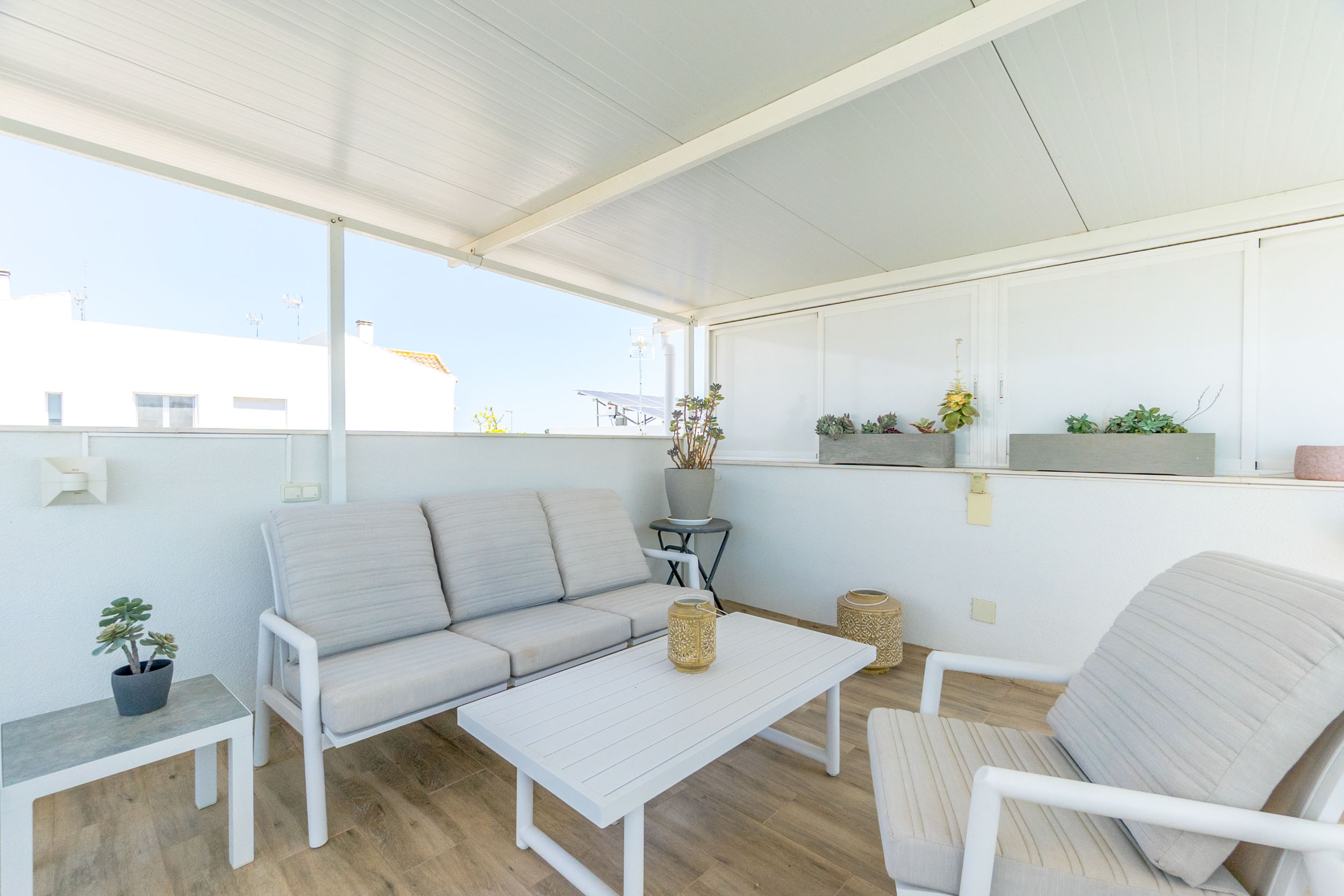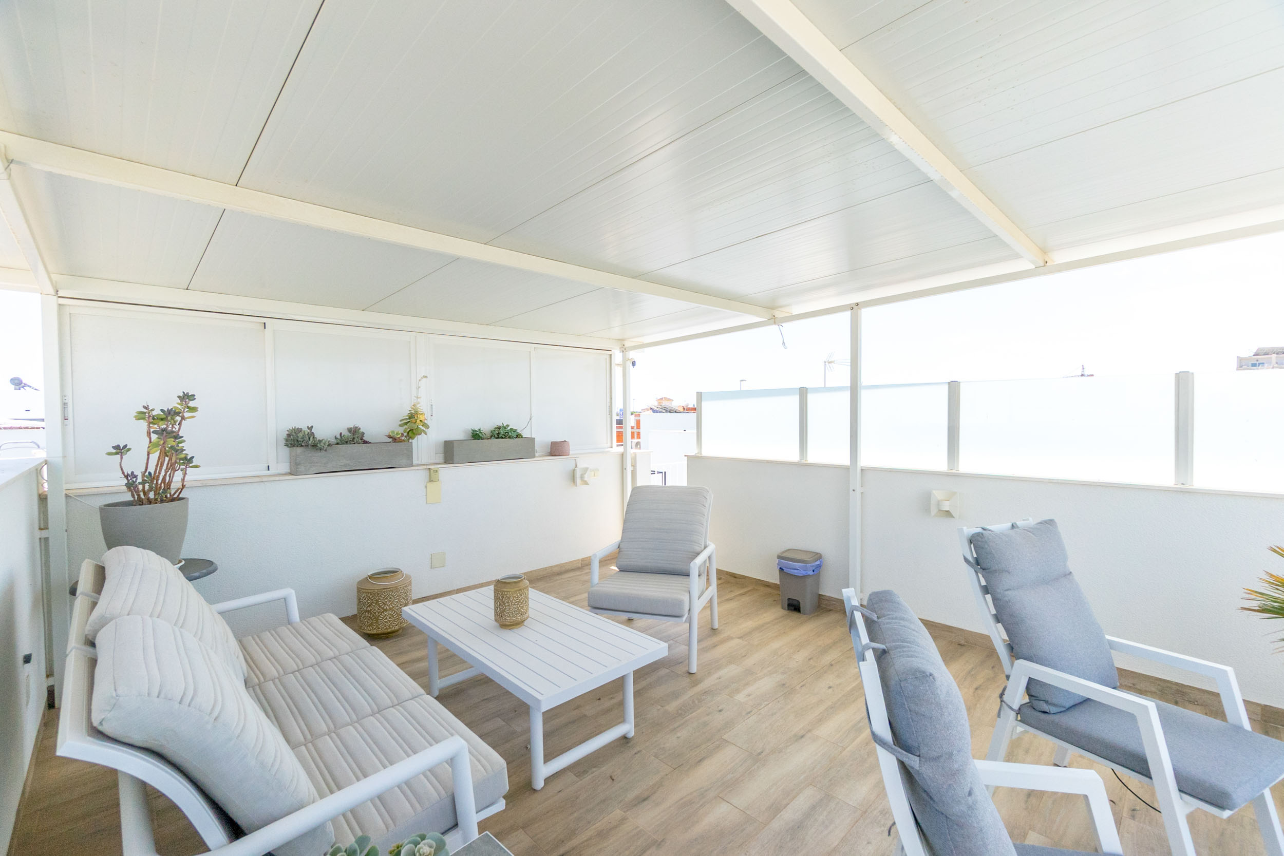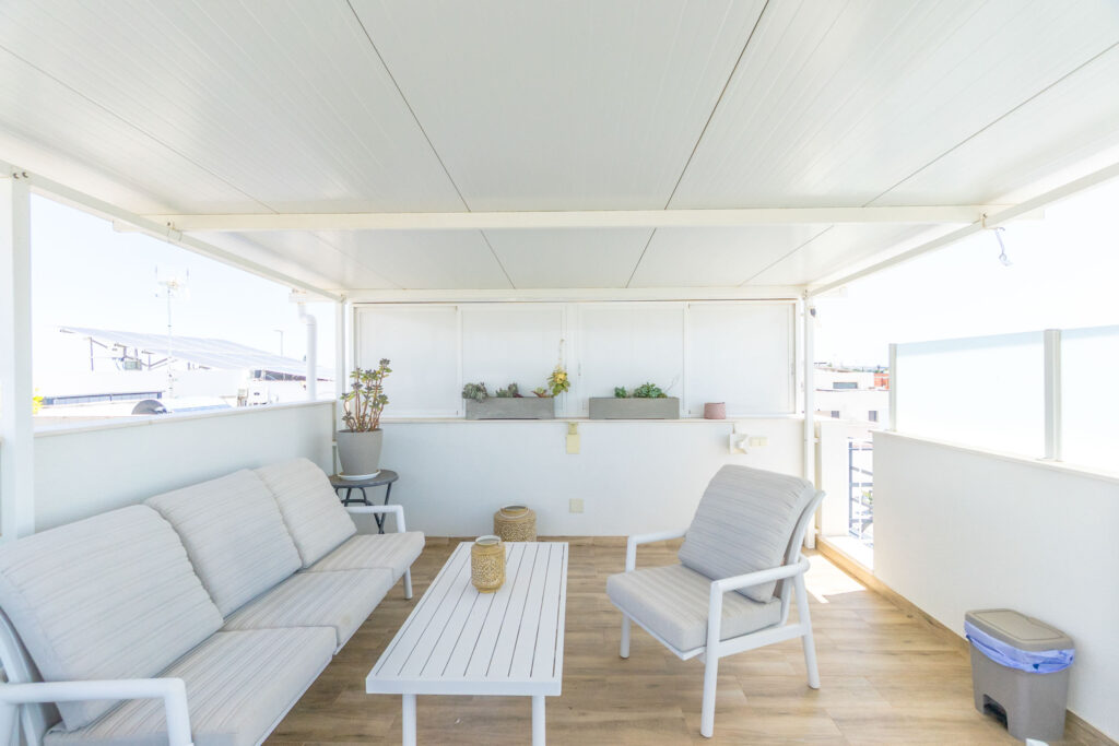 Det er en stor takterrasse med tak og flott utsikt.