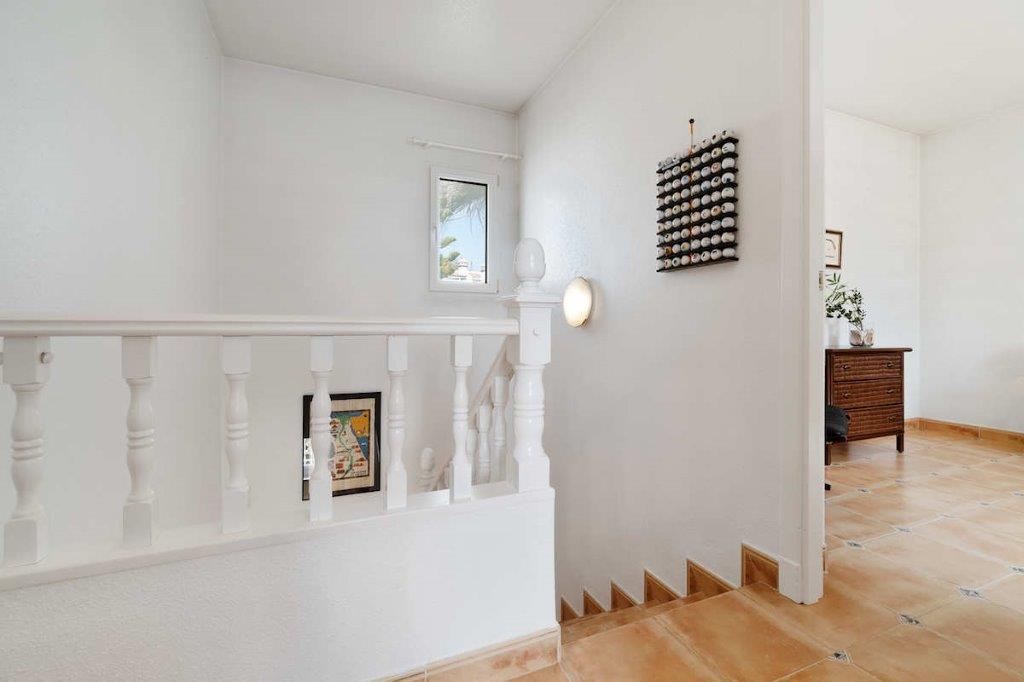 Den indre trappen forbinder det nedre nivået med det øvre nivået, hvor det er ytterligere to soverom, et bad og en terrasse.