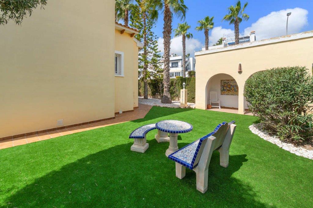 Eneboligen står på en tomt på 500 m2 og har et privat basseng og en lukket garasje som kan tjene både som parkeringsplass og som lagringsplass. Den private hagen er veldig pent designet og har lite vedlikehold.