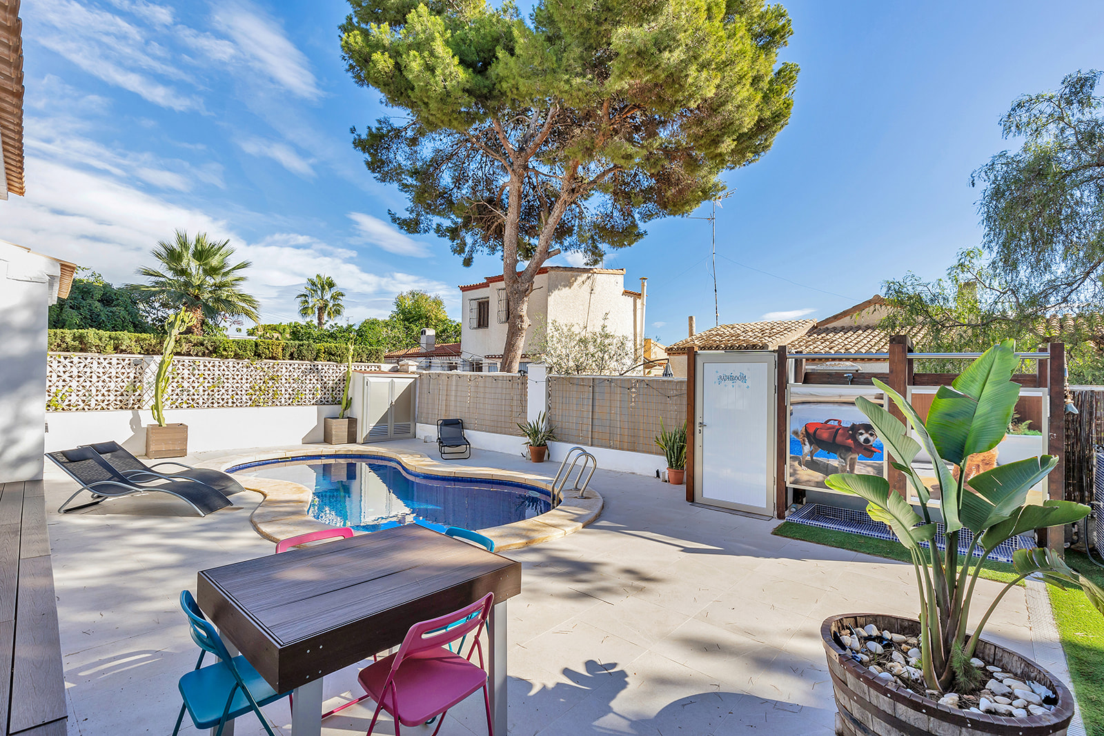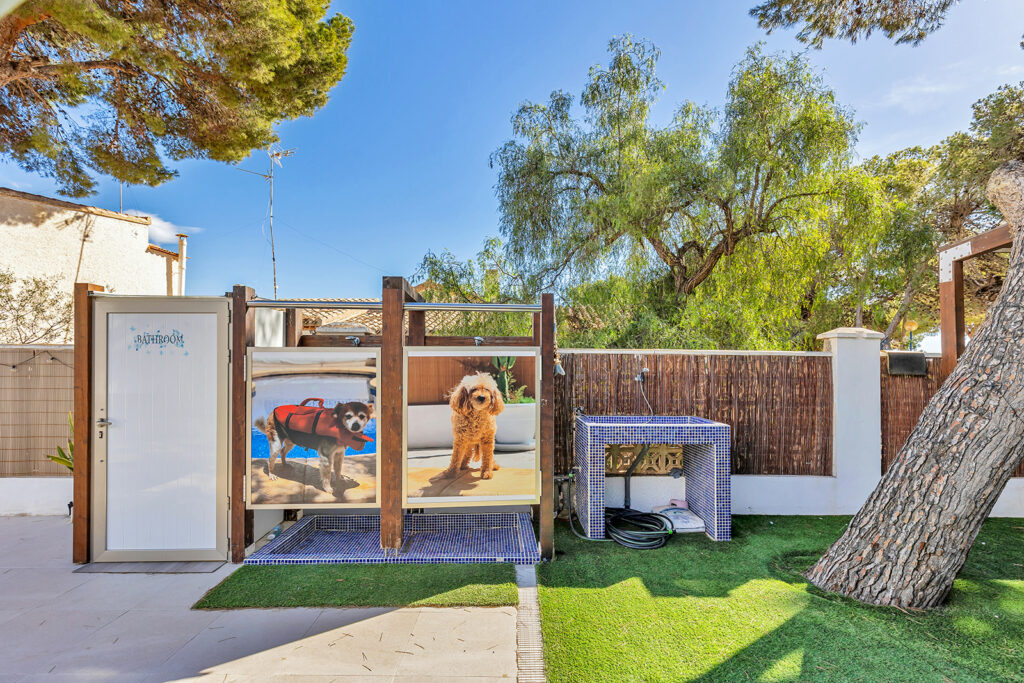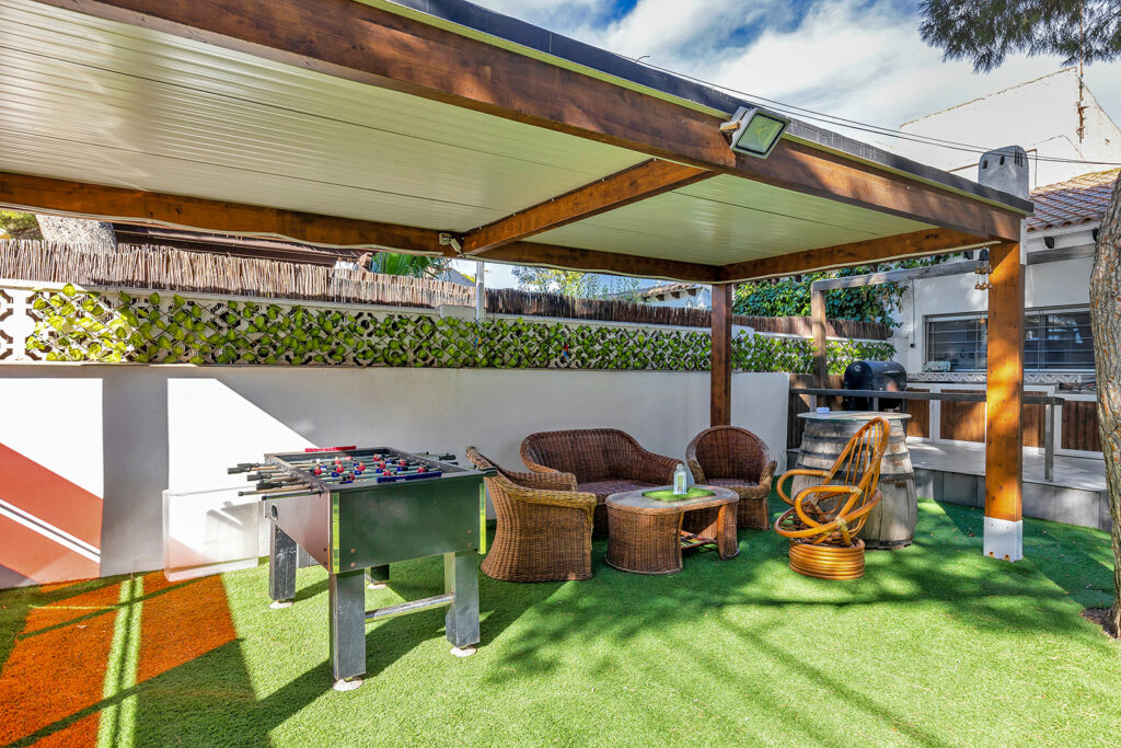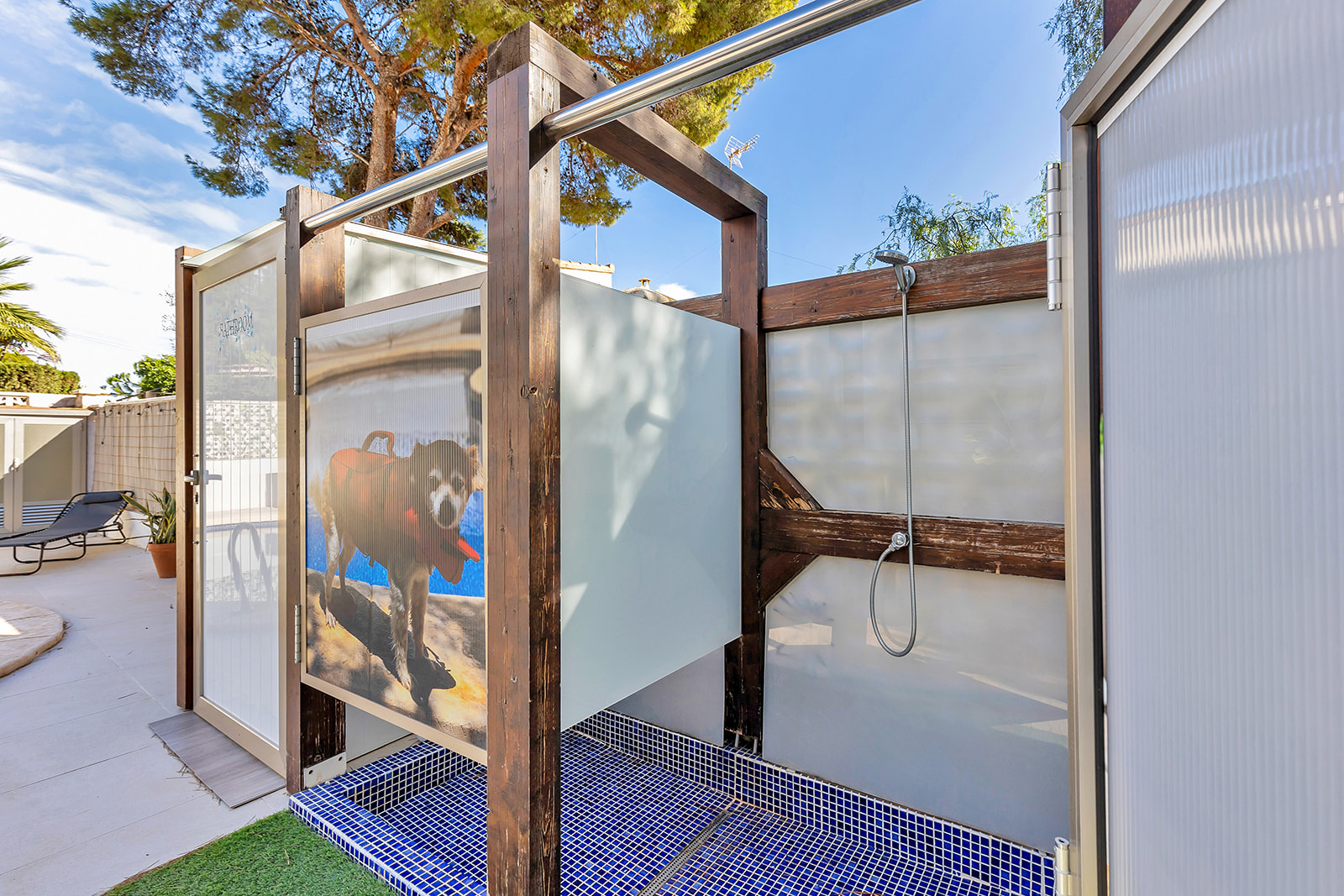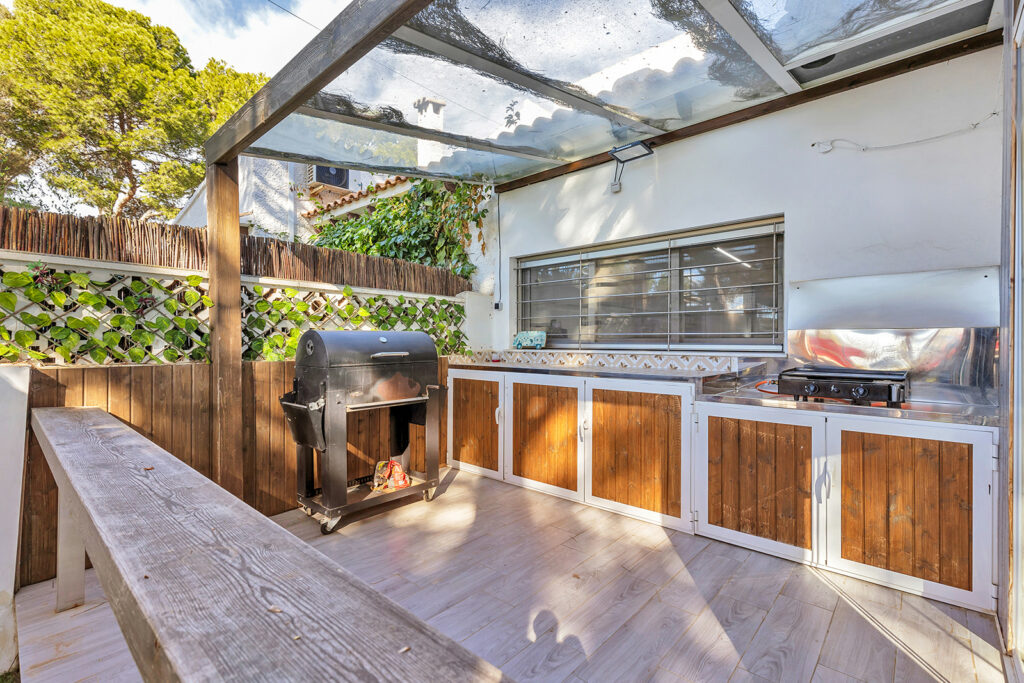 Tomten er på 450 m2 og hagen er vakker med privat basseng, utedusj, toalett, utekjøkken og flere pergolaer og sitteplasser.