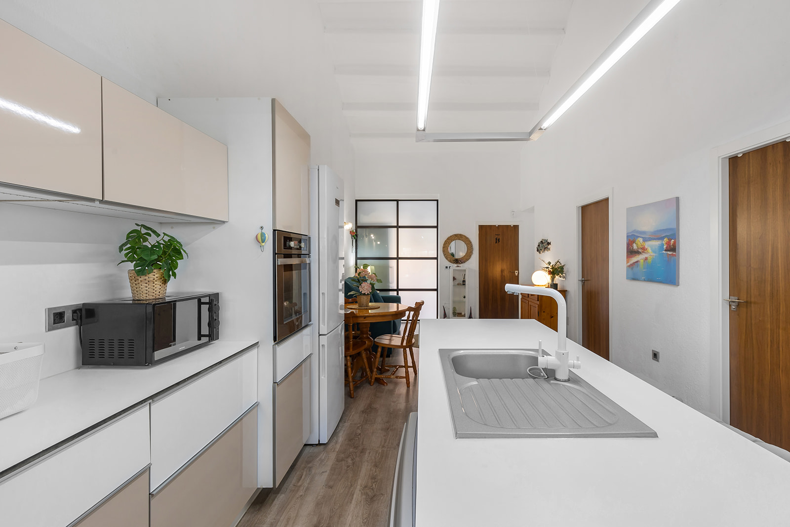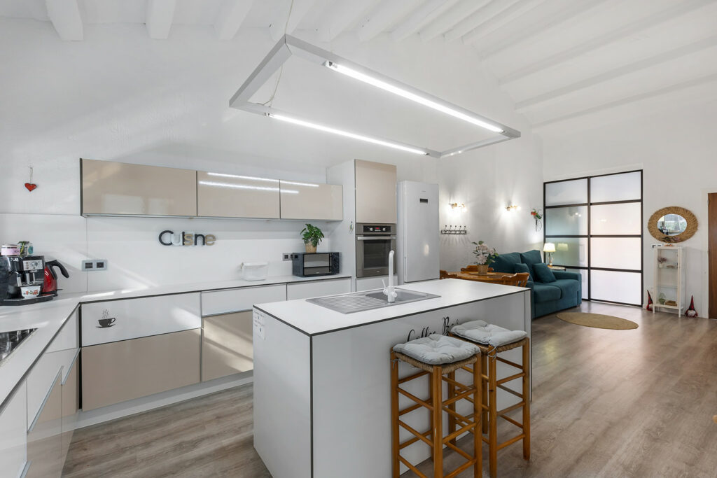 Det er fire soverom, 2 moderne bad, vaskerom, kjøkken med øy og spiseplass samt en stor stue/spisestue med peis, store vinduer og høyt under taket.