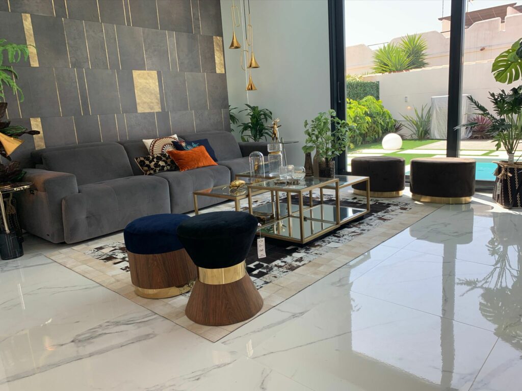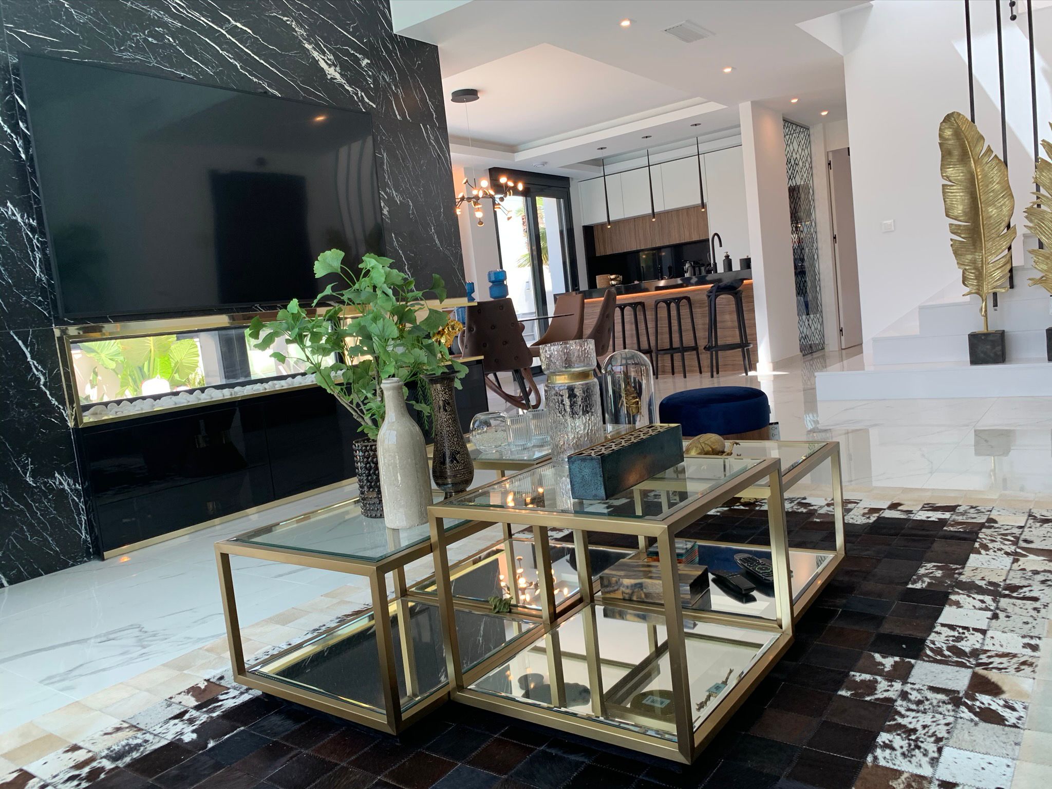 Romslig stue med åpen designerkjøkkenløsning