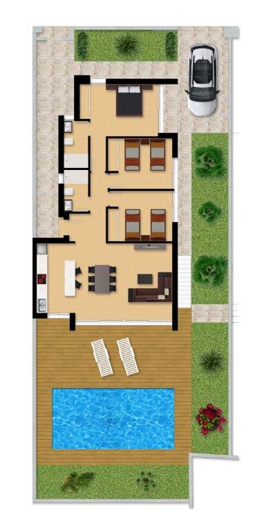 I Aguas Nuevas/ Torrejon ligger Residencial La Luna Fase II som består av 5 Villaer, hvorav 4 av disse er modell Telis. Dette er moderne boliger med 3 eller 4 soverom og 2 eller 3 bad. Husene er på 158 m2 og tomten er på 301 m2. Boligene er på et plan + «kjeller» og stor takterrasse. Det vil være kjøkken med åpen løsning mot stuen.Fra stuen er det utgang til terrassen, hagen og bassenget. Det er plass til å parkere bilen inne på tomten.
