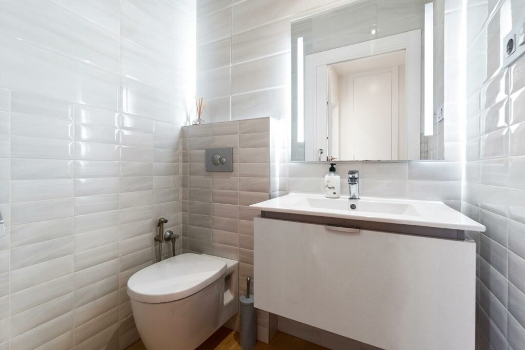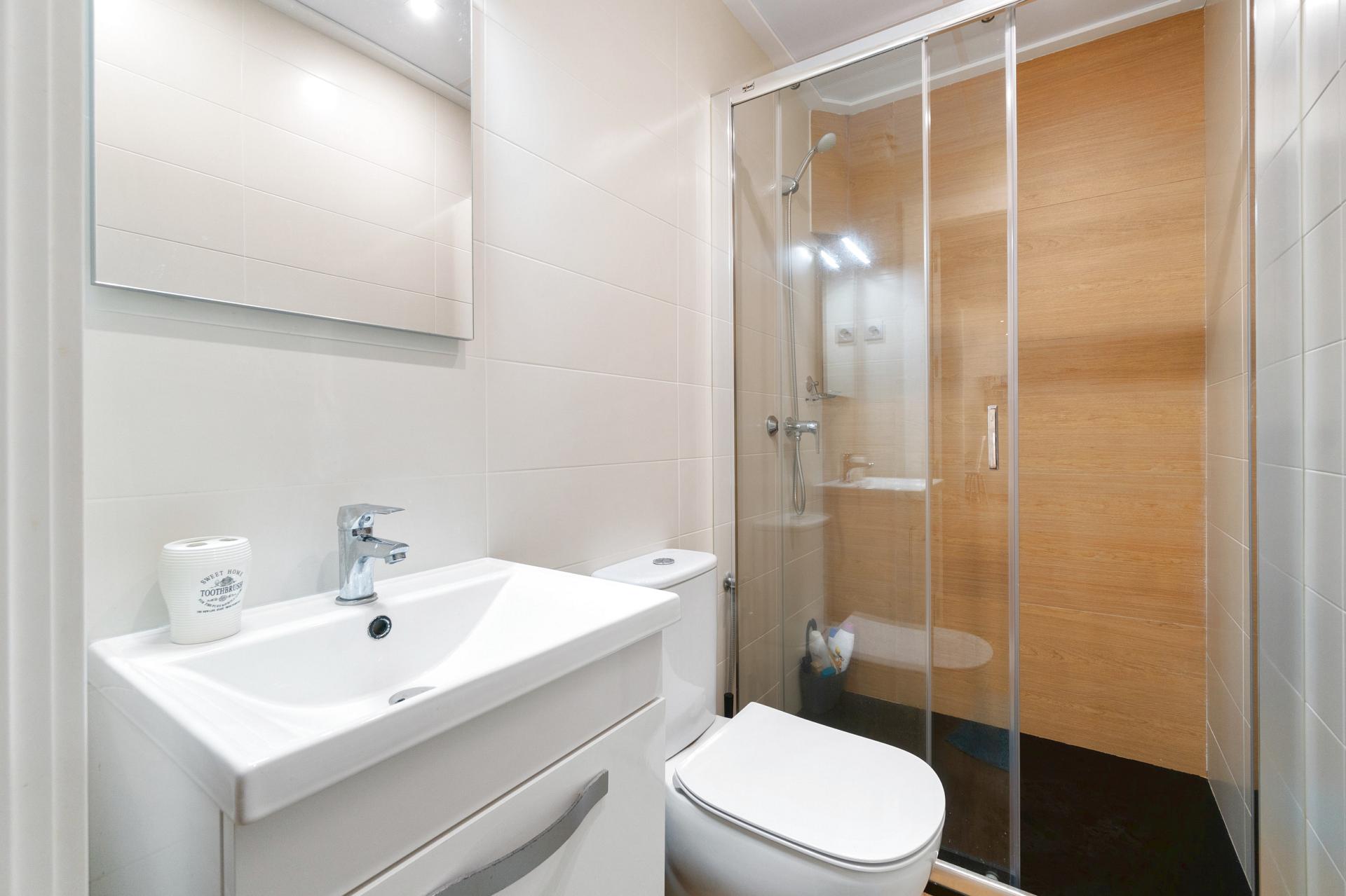 I første etasje er det en stor stue med åpen kjøkkenløsning og direkte utgang til hagen, et soverom, et bad og et toalett.