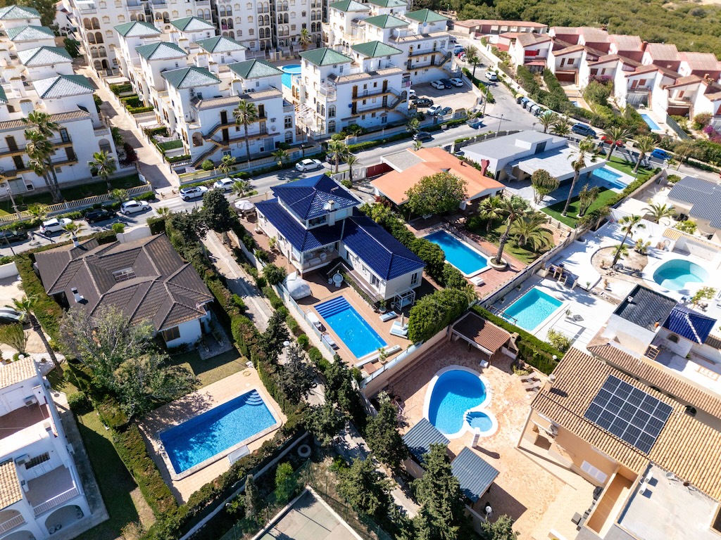 Vi presenterer denne spektakulære luksusvillaen som ligger i et av de mest eksklusive områdene i Torrevieja: Molino Blanco, bare 350 meter fra La Mata-stranden. Omgitt av elegante eneboliger i fredelige omgivelser, kombinerer denne eiendommen design, komfort og en privilegert beliggenhet på en perfekt måte.