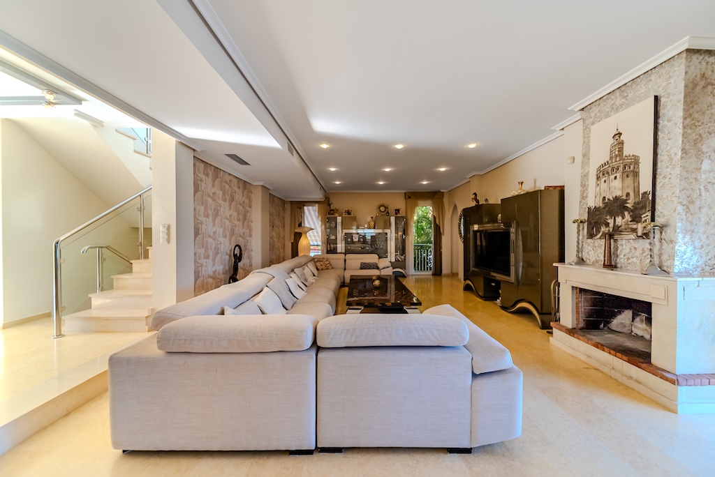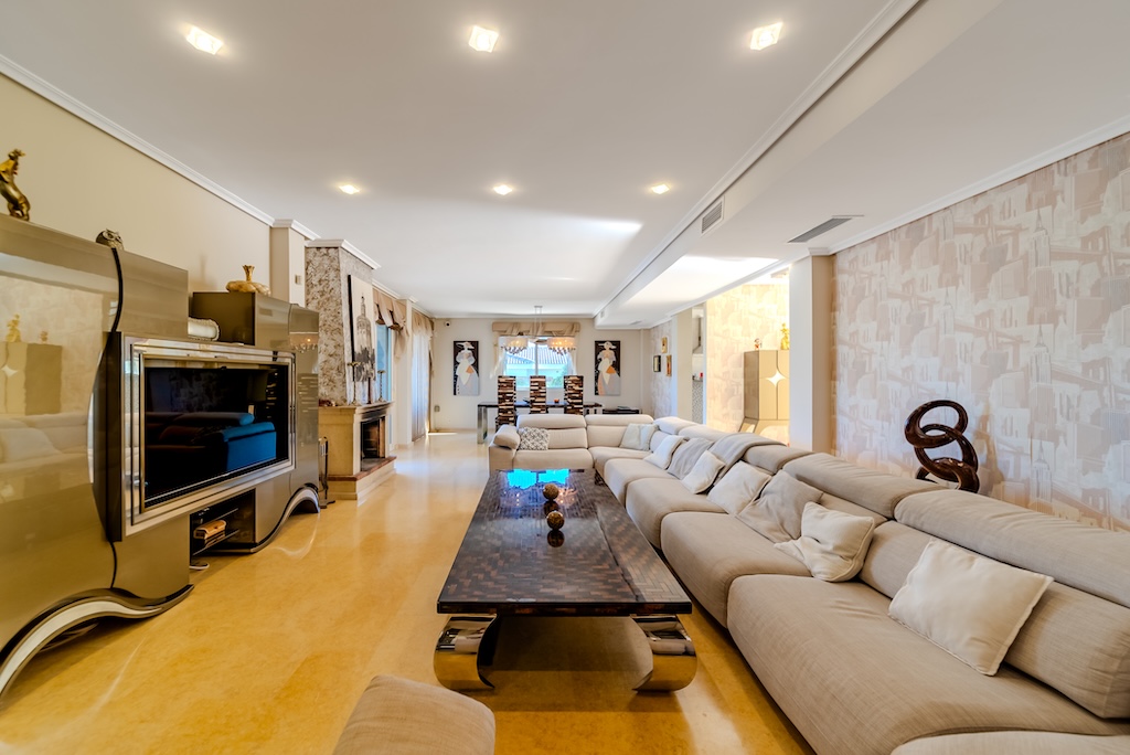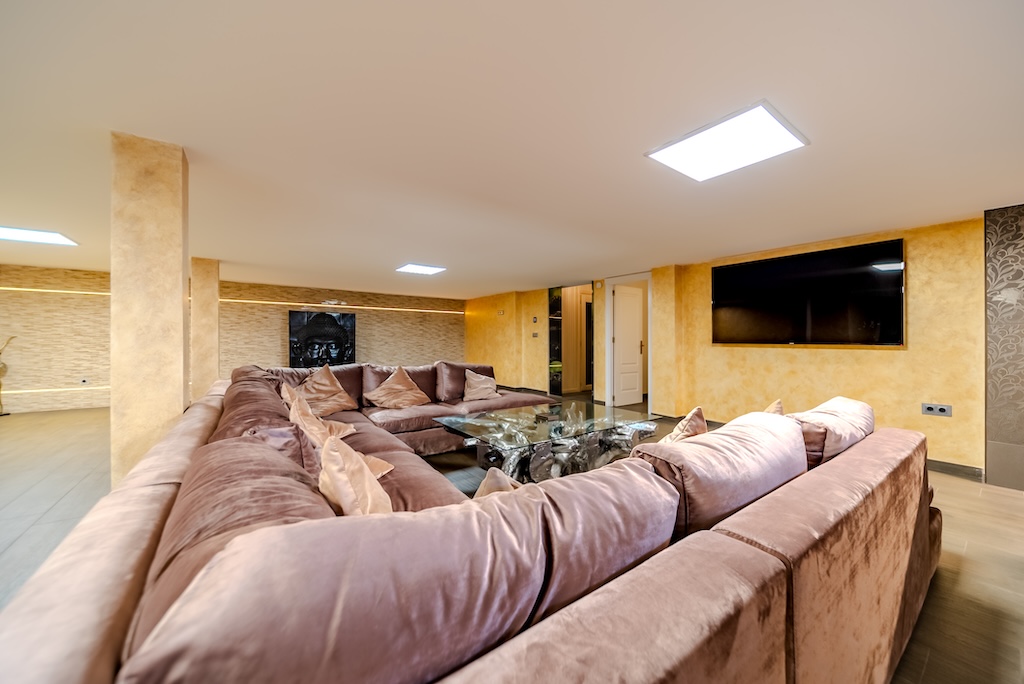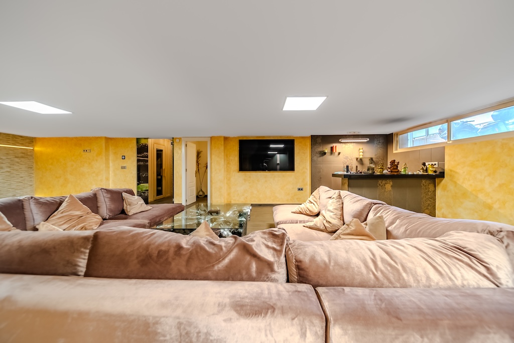 Den romslige stuen/spisestuen samt et fullt utstyrt kjøkken er i hovedetasjen. I kjelleren, i tillegg til en andre stue som er ideell for feiringer eller familietid, er det et moderne kinorom og et spaområde med finsk badstue og tyrkisk bad. Gulvvarme er også tilgjengelig i denne etasjen.