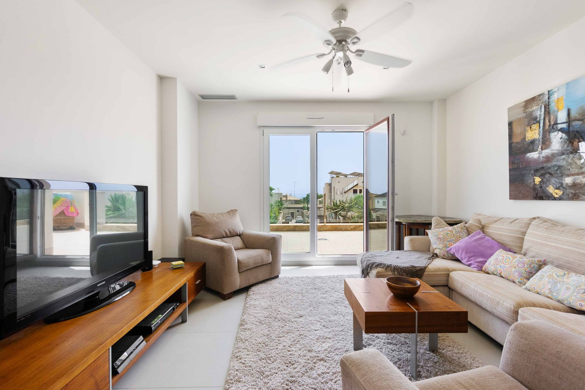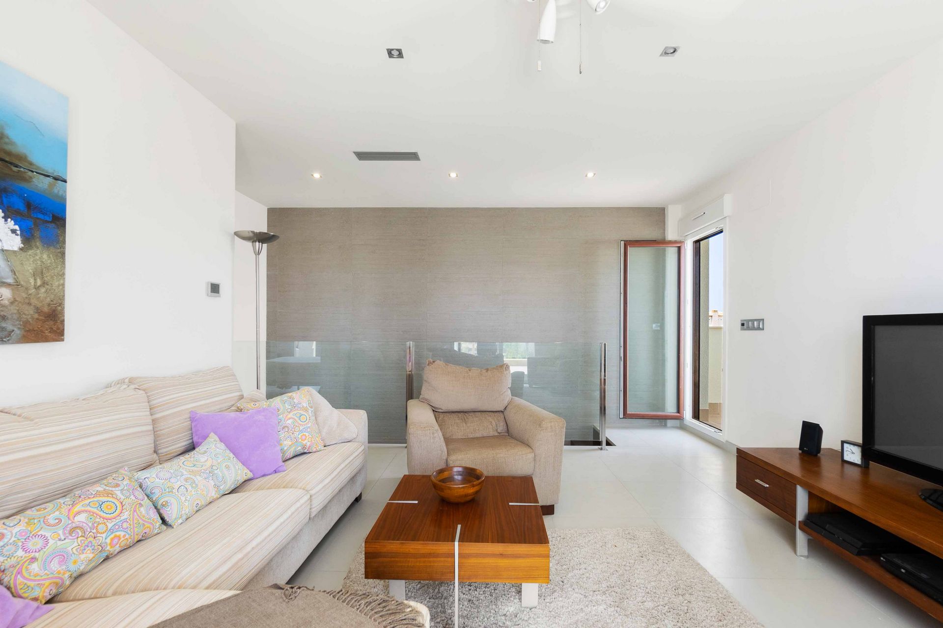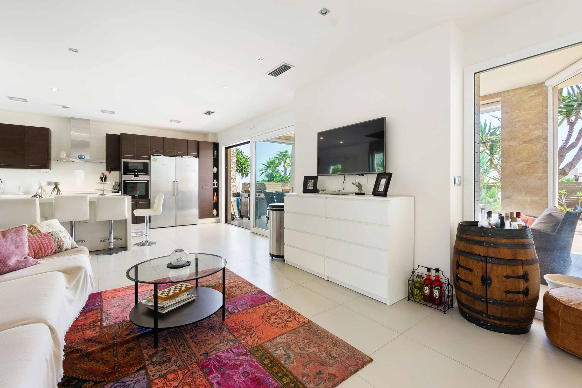 Fra stuen har du tilgang til en stor terrasse med sittegruppe og solsenger.