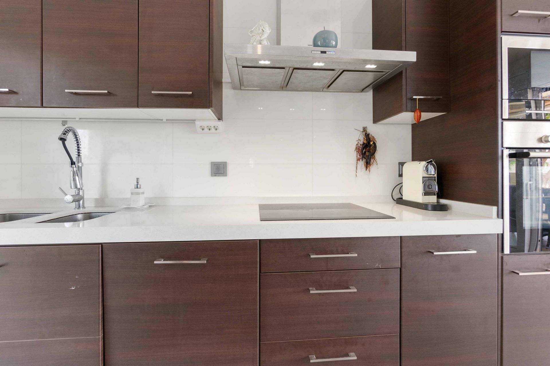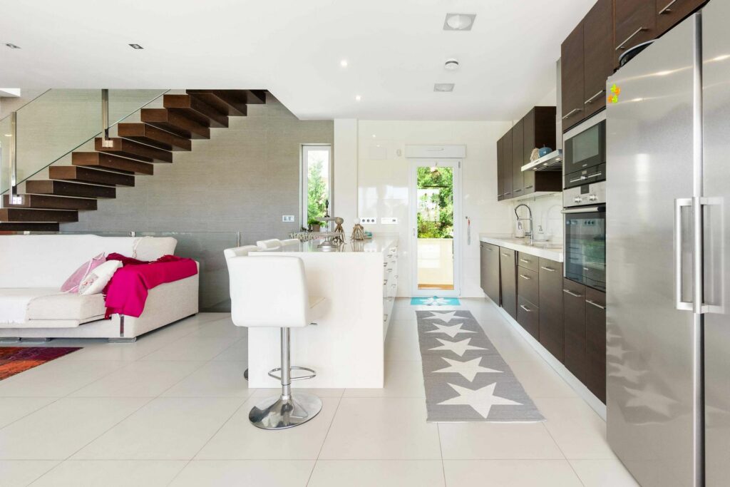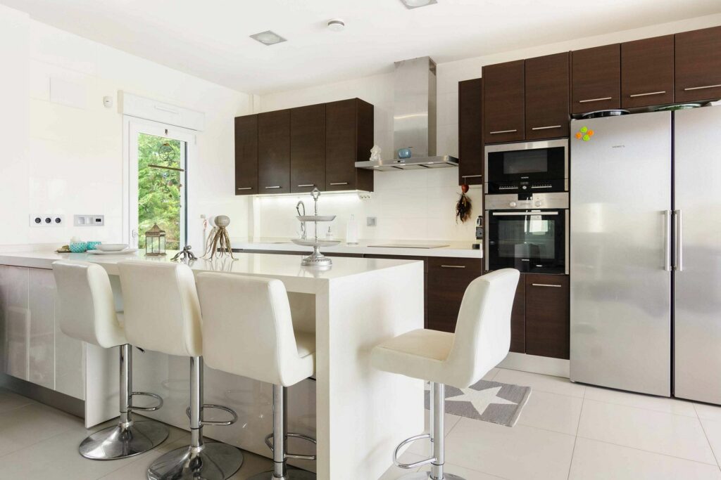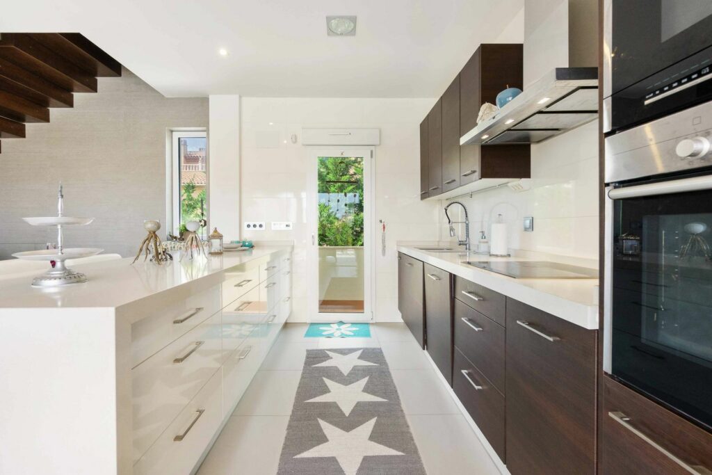 Moderne kjøkken med integrerte hvitevarer og god plass til matlaging.