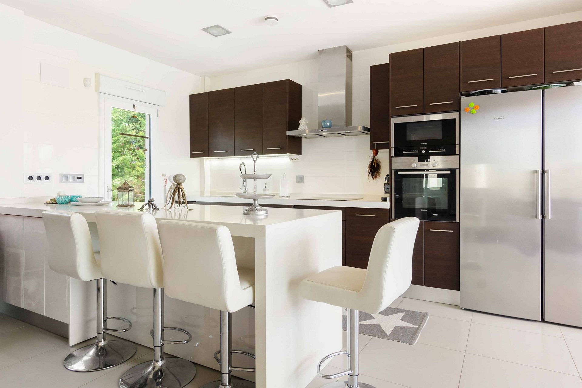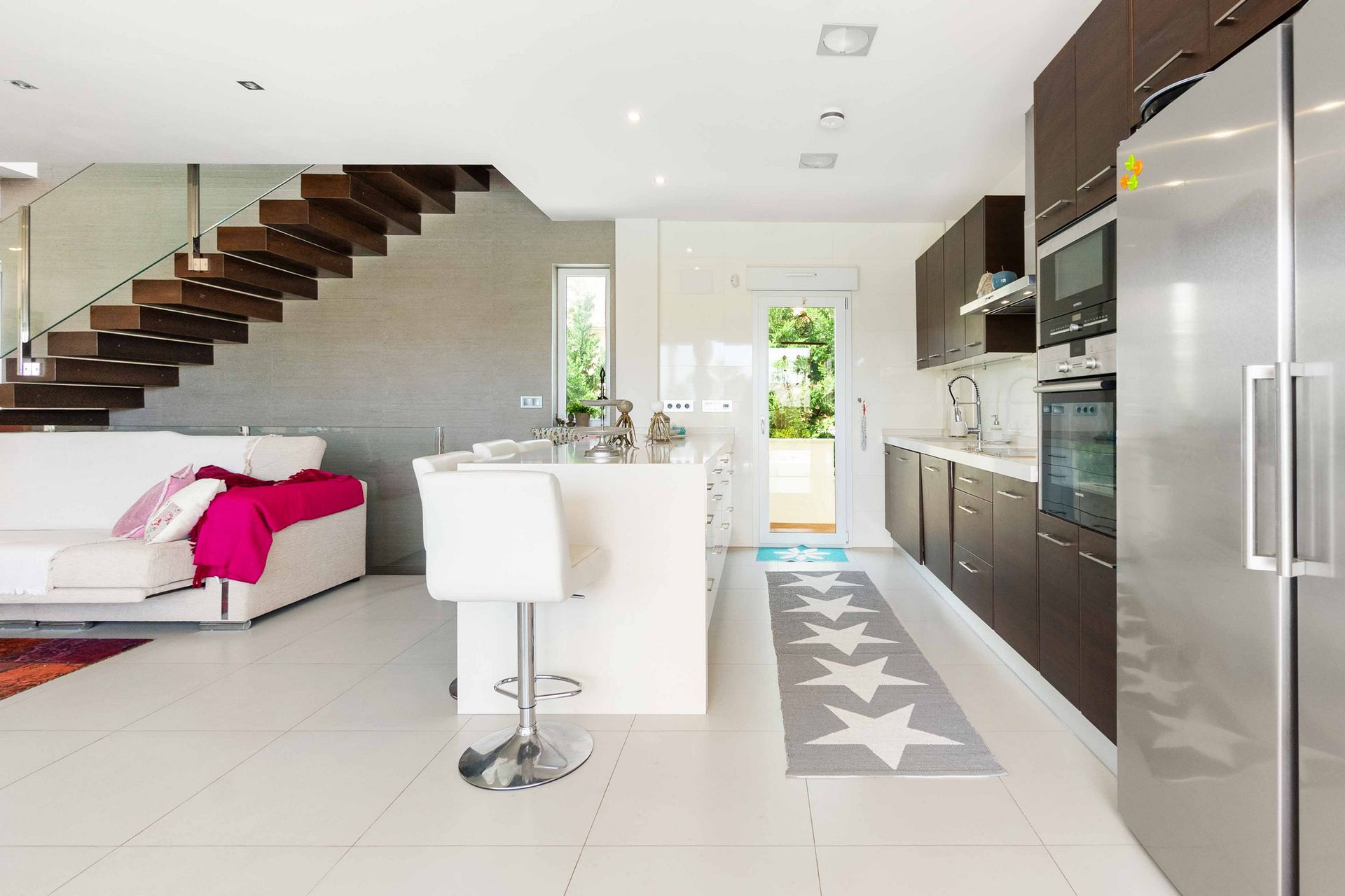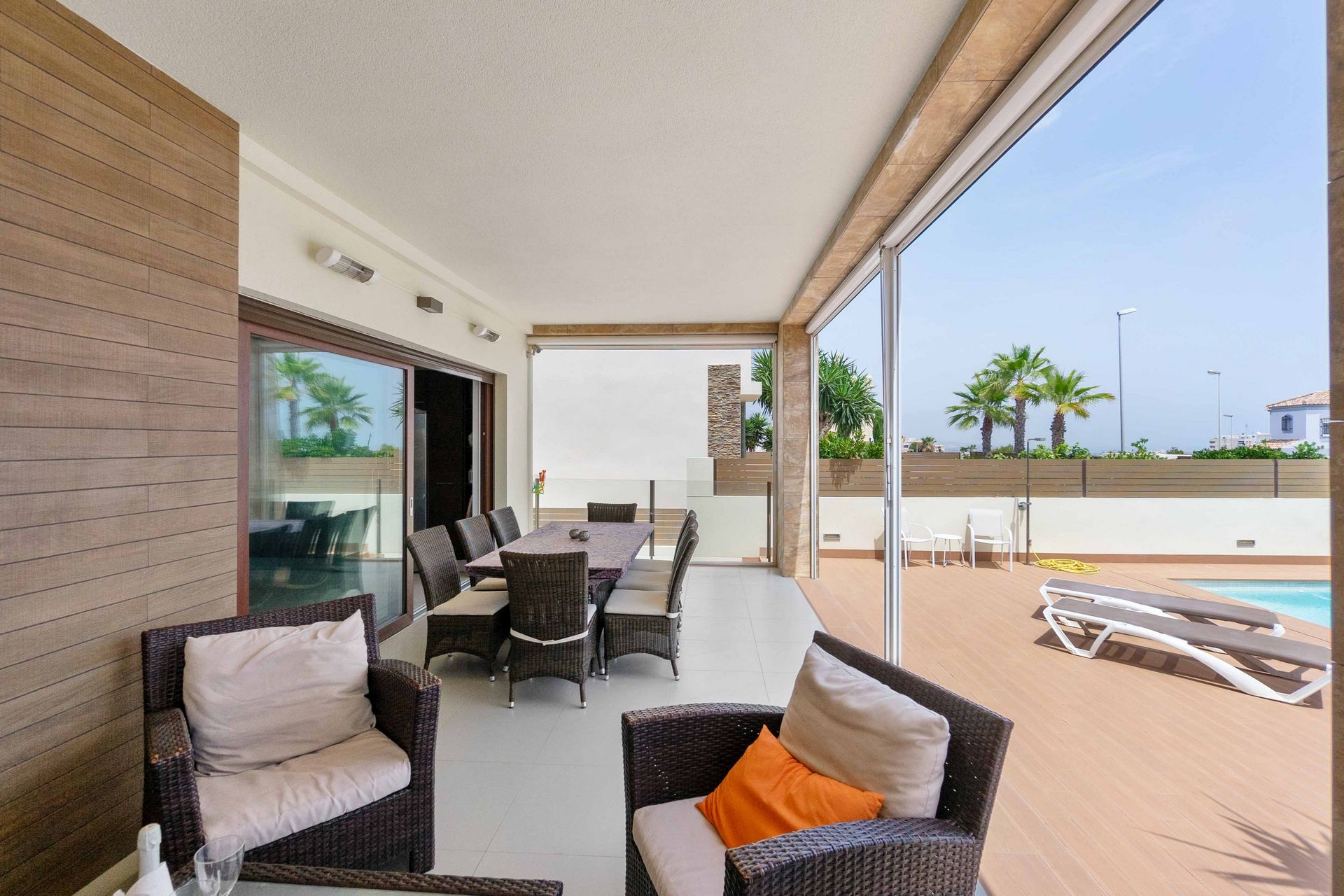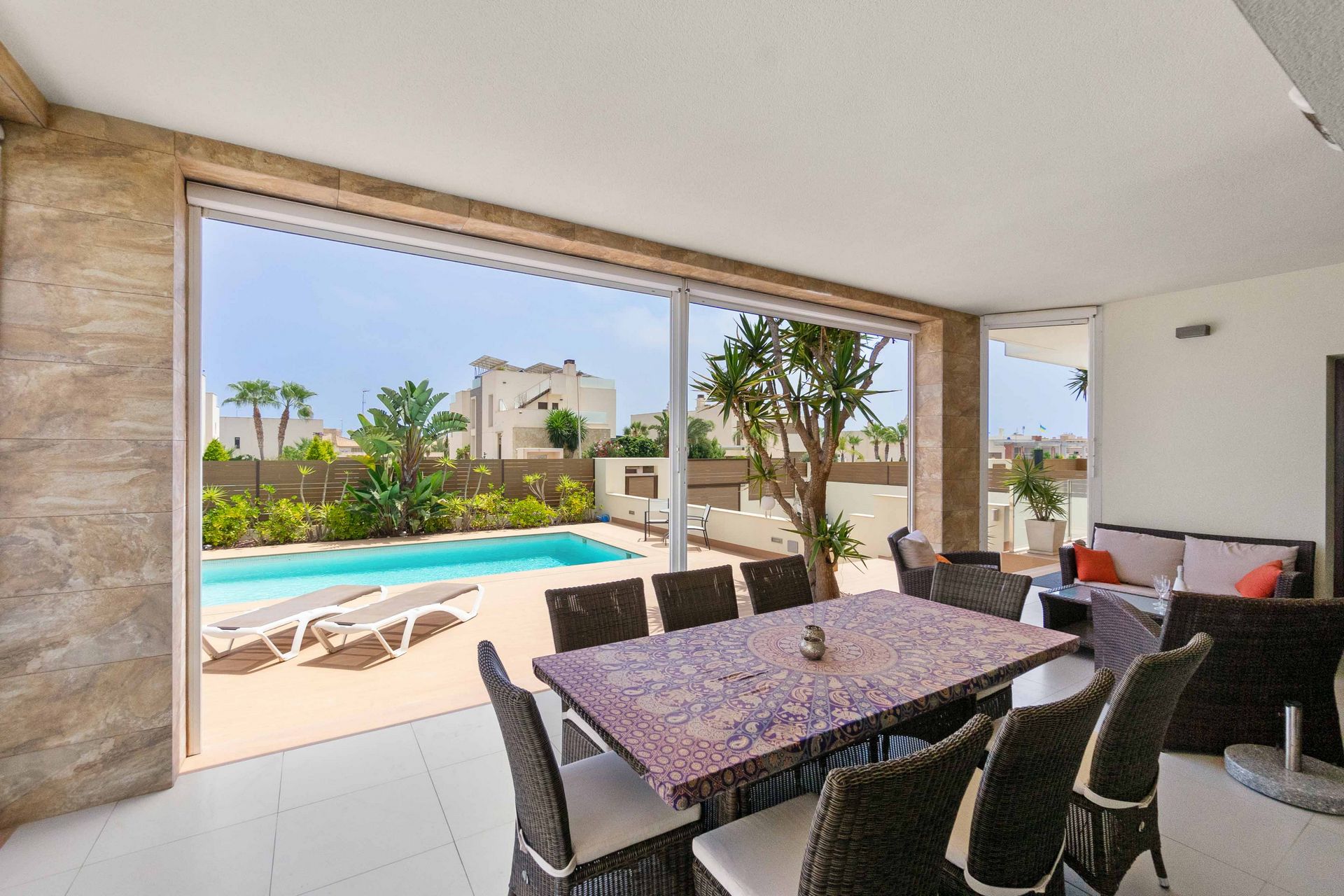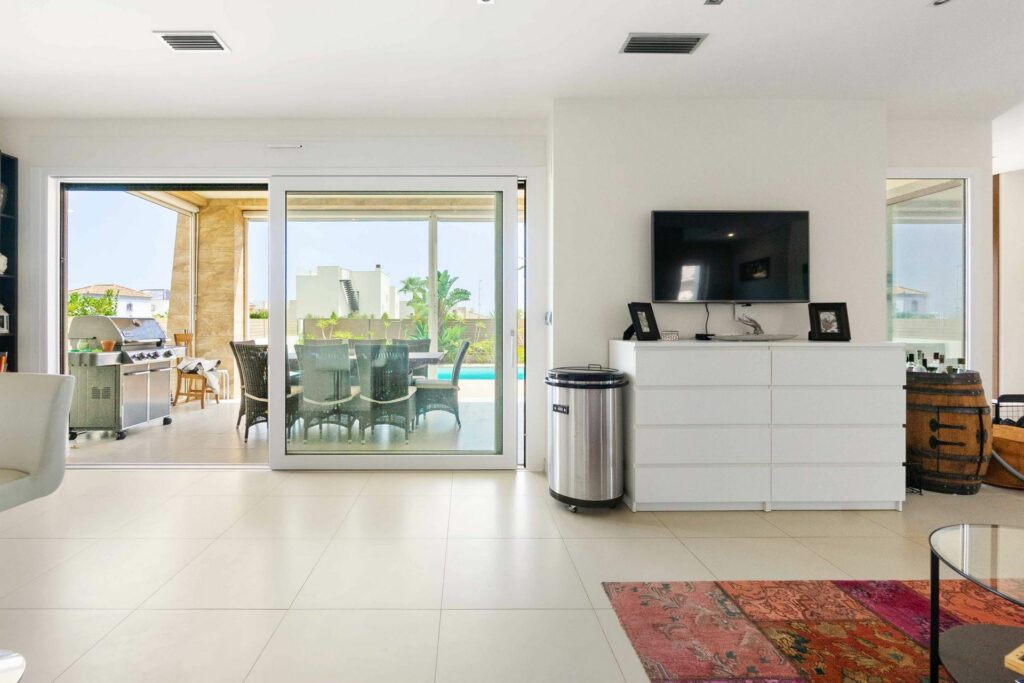 Stuen er lys og romslig, med store vinduer som gir utsikt over bassenget og hagen.