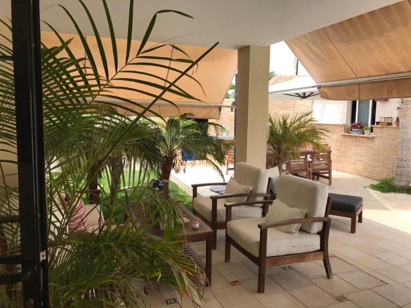 Boligen ligger på en hjørnetomt og har derfor veldig gode solforhold. I hagen er det plass til flere sittegrupper både i solen og under tak, samt utekjøkken og basseng.
