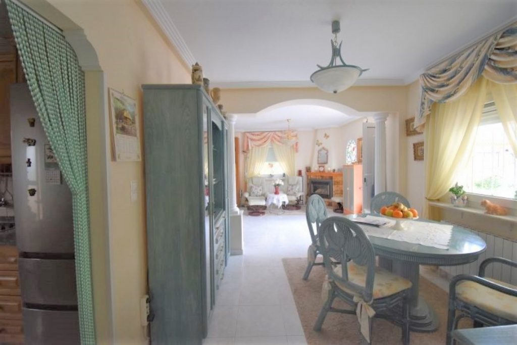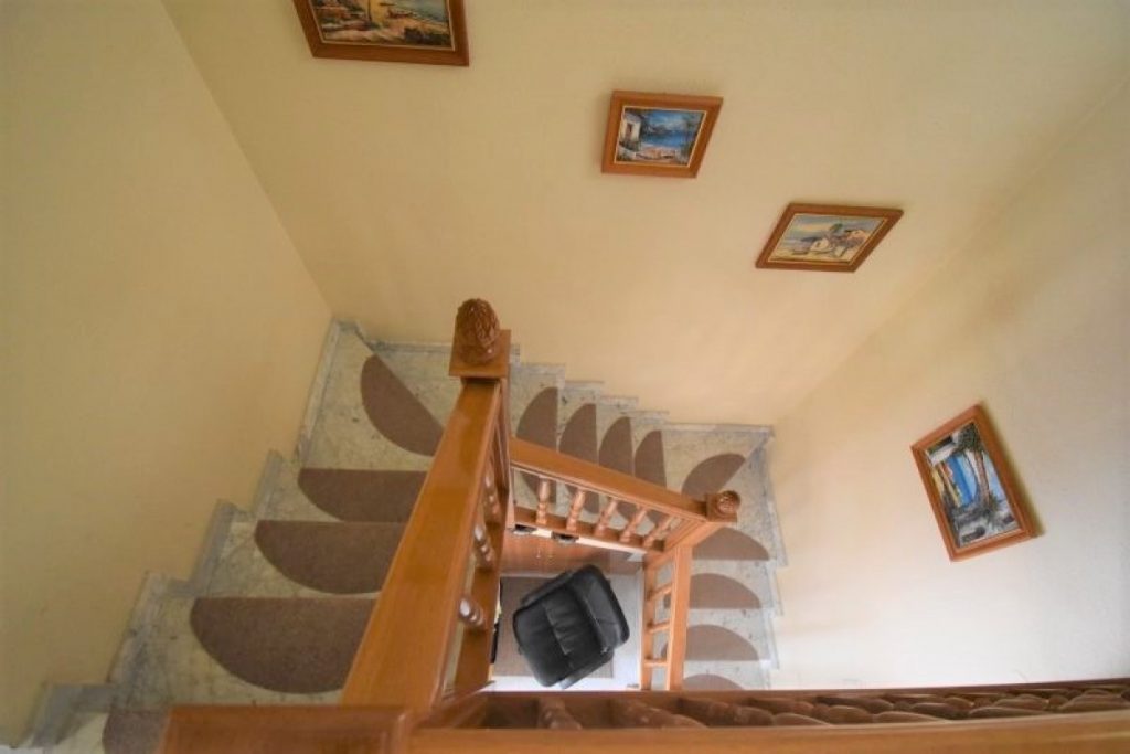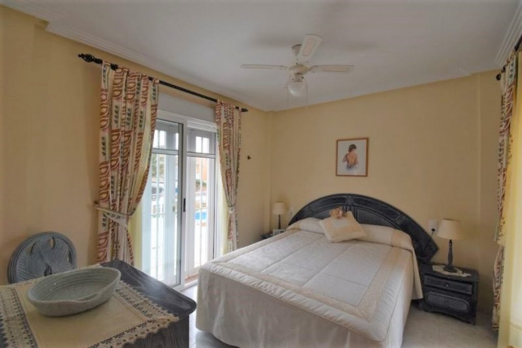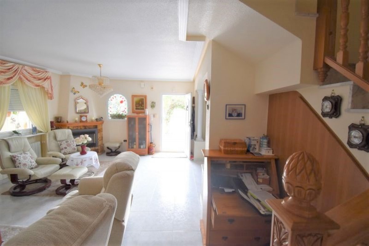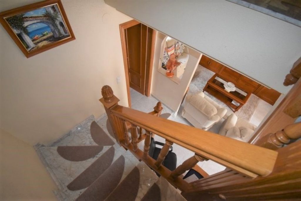 I første etasje finner du en romslig stue med peis og god plass til både sofagruppe og spisestue. Et hyggelig kjøkken med utgang til patio, bad med dusj og et soverom. I andre etasje er der 3 soverom (ett med utgang til terrasse), et bad med badekar og en takterrasse med utsikt over bassengområdet.