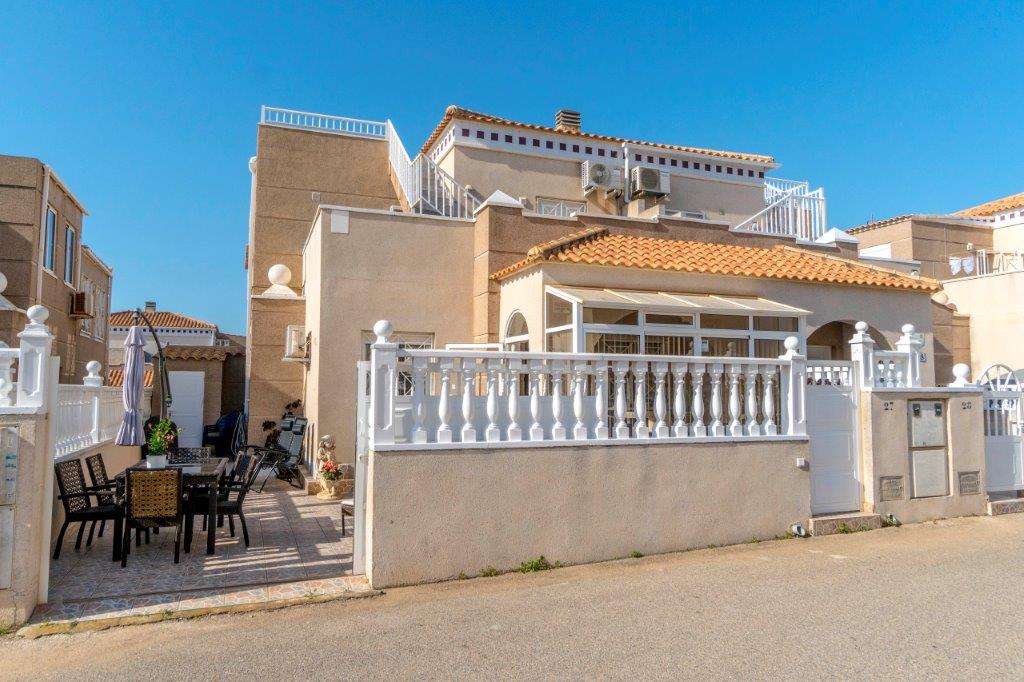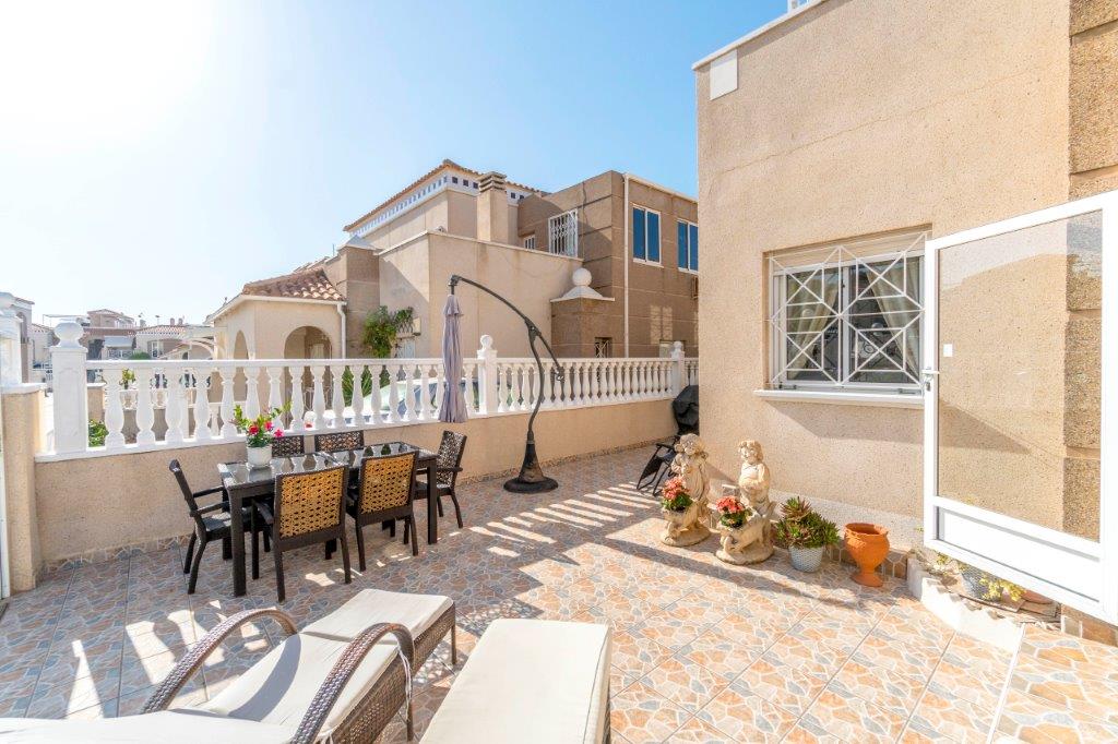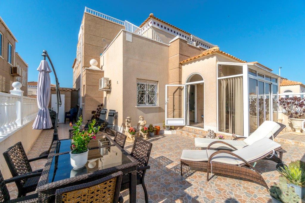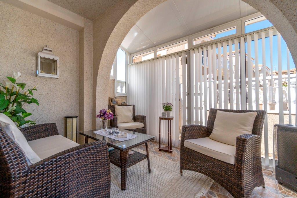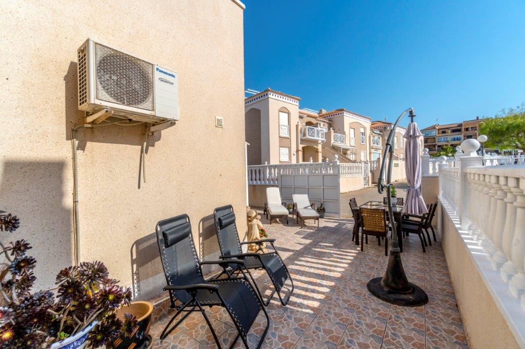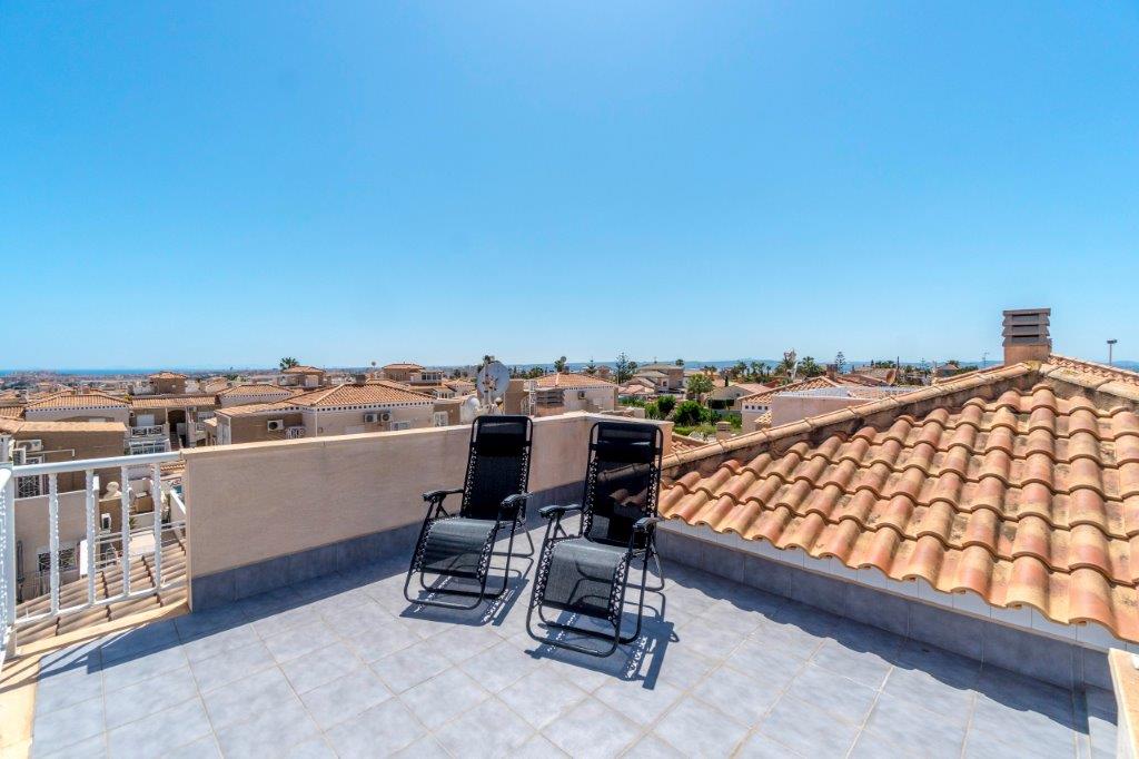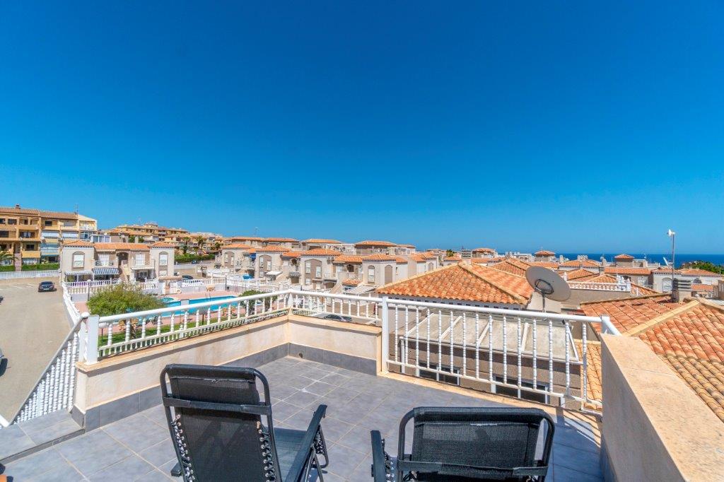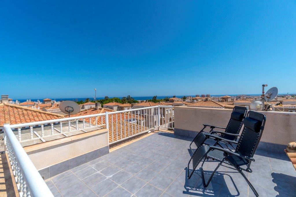 Denne fine firemannsboligen har 3 soverom, 2 bad, stor stue med åpen løsning mot kjøkkenet og en patio. Det er en fin innglasset terrasse utenfor stuen og på toppen er det en herlig takterrasse med nydelig havutsikt.