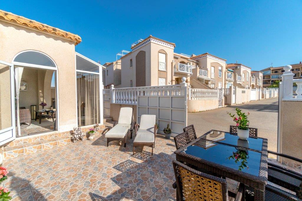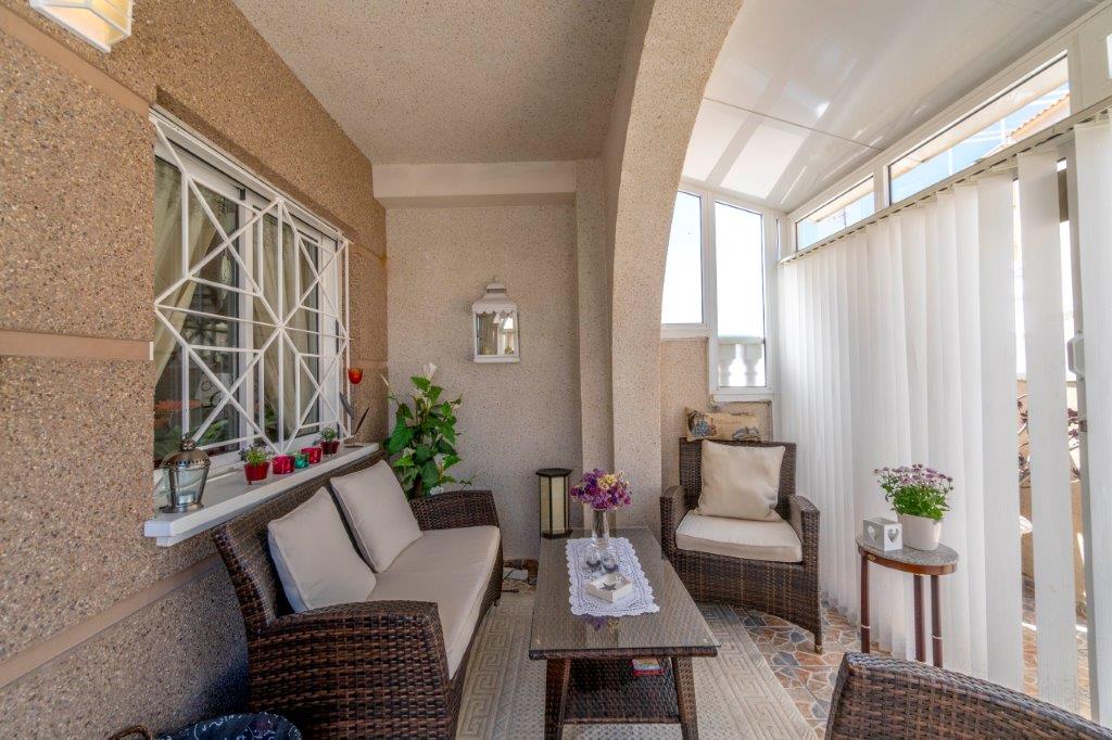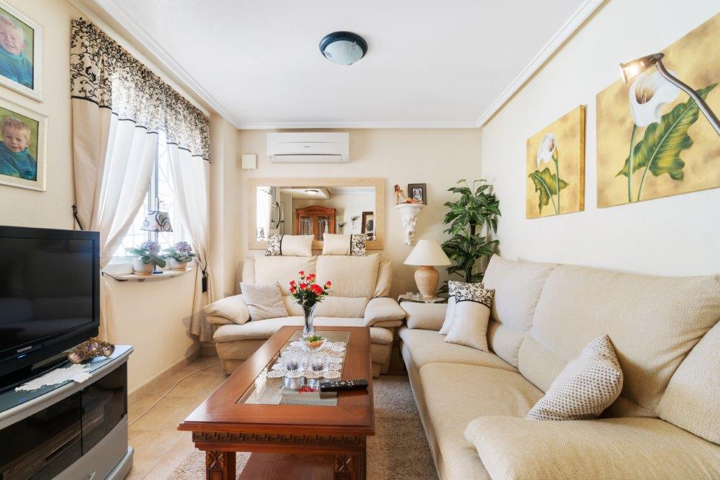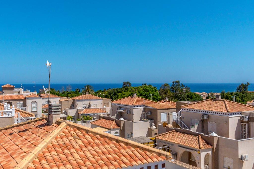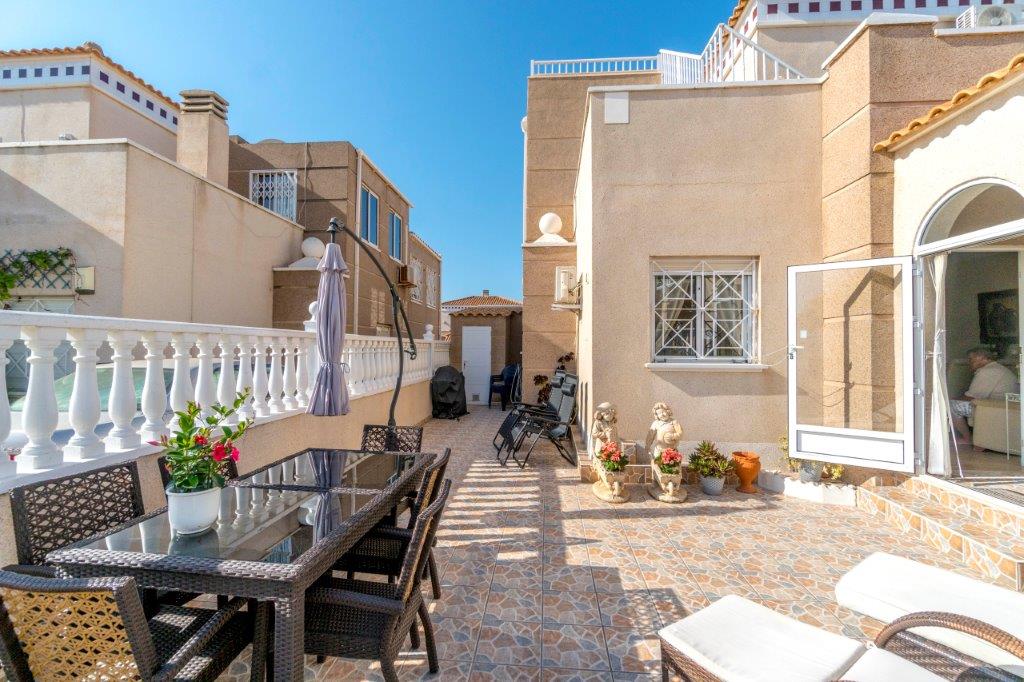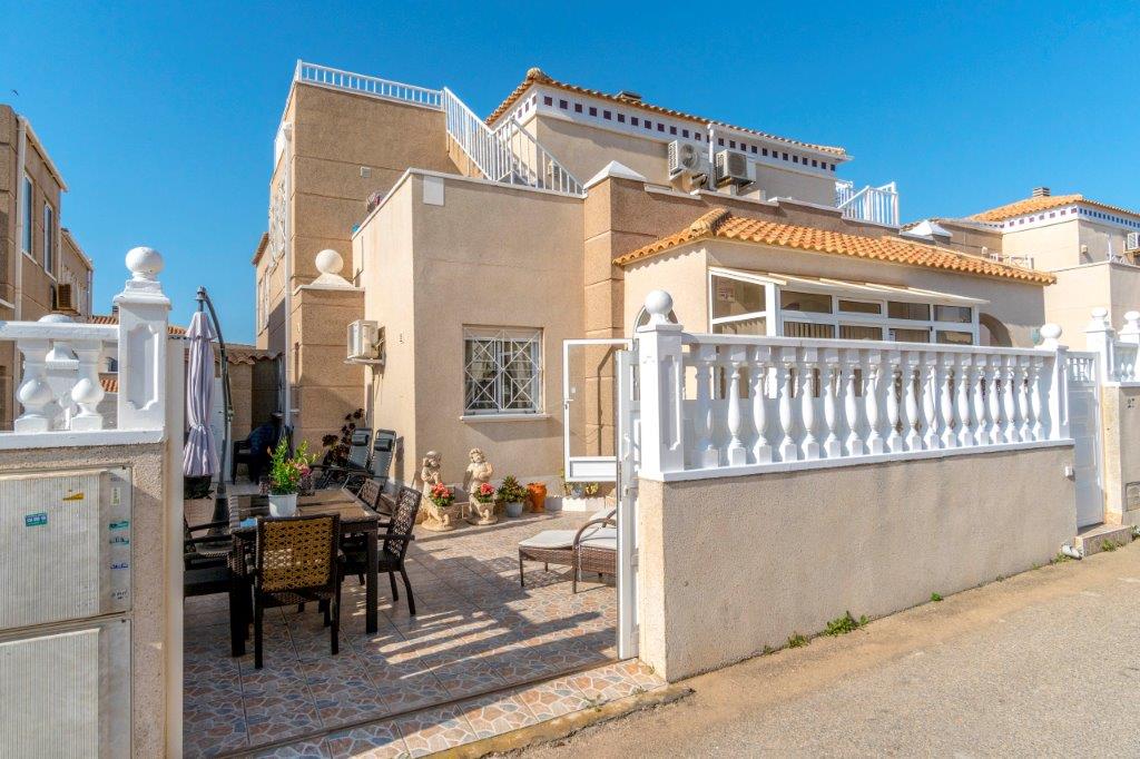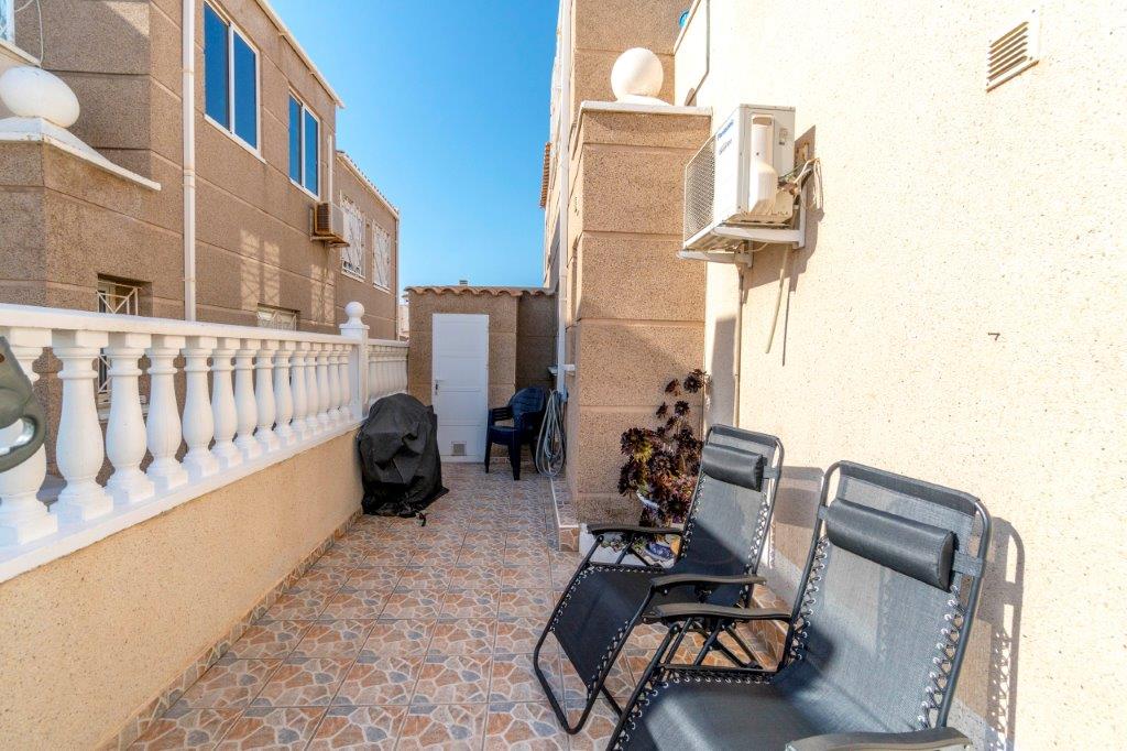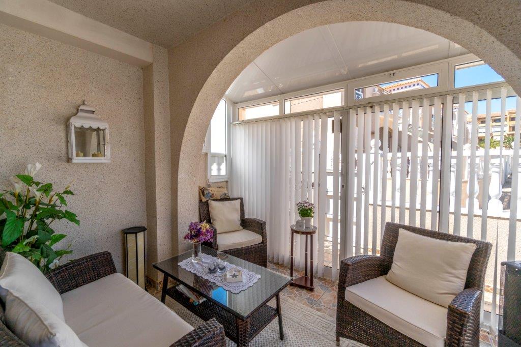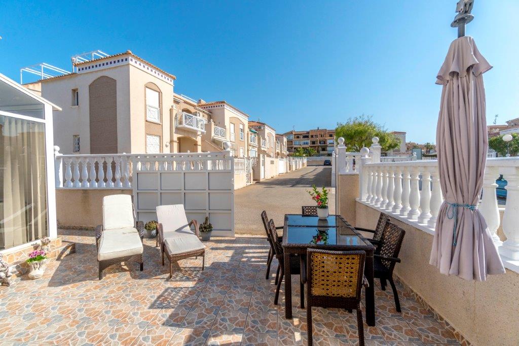 Denne fine firemannsboligen har 3 soverom, 2 bad, stor stue med åpen løsning mot kjøkkenet og en patio. Det er en fin innglasset terrasse utenfor stuen og på toppen er det en herlig takterrasse med nydelig havutsikt.
