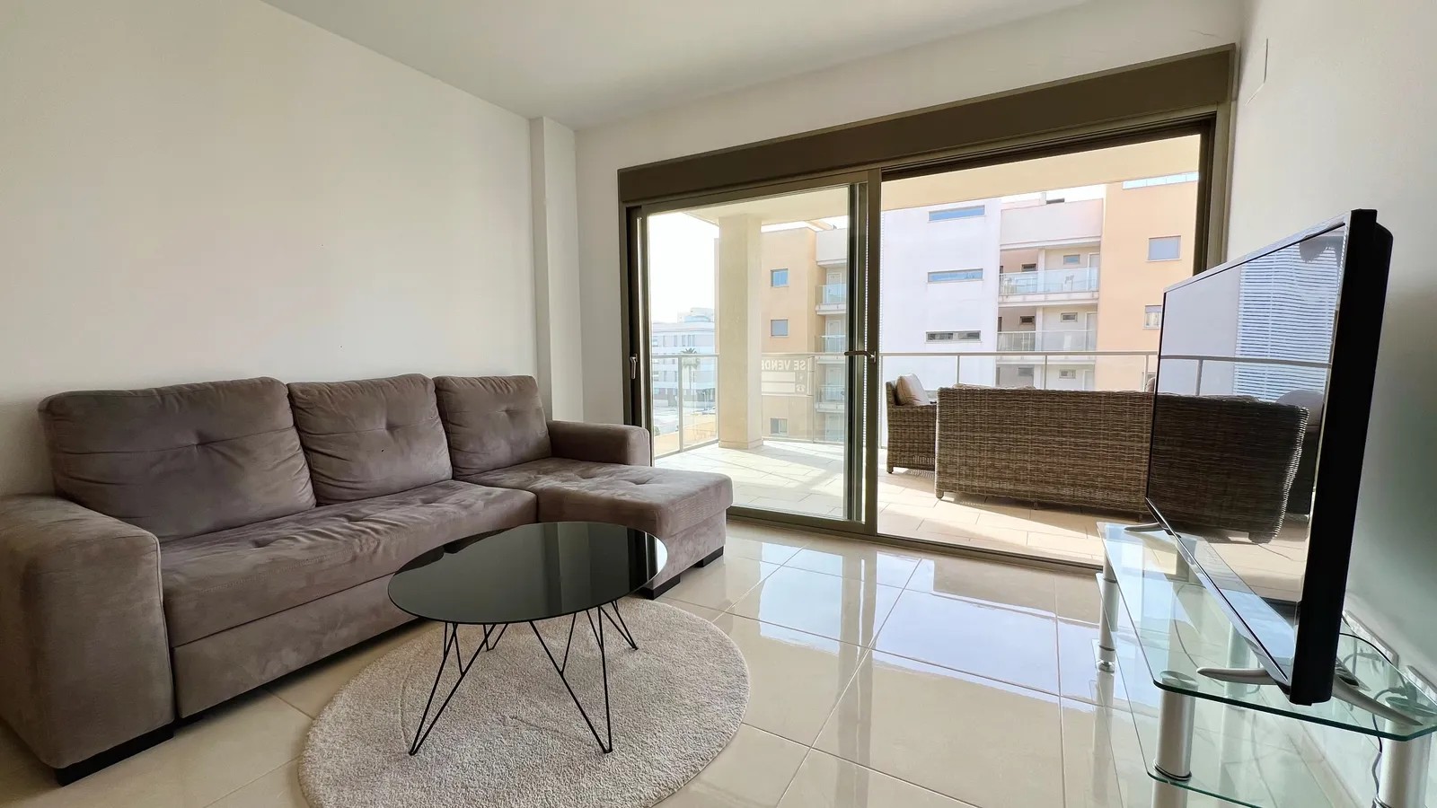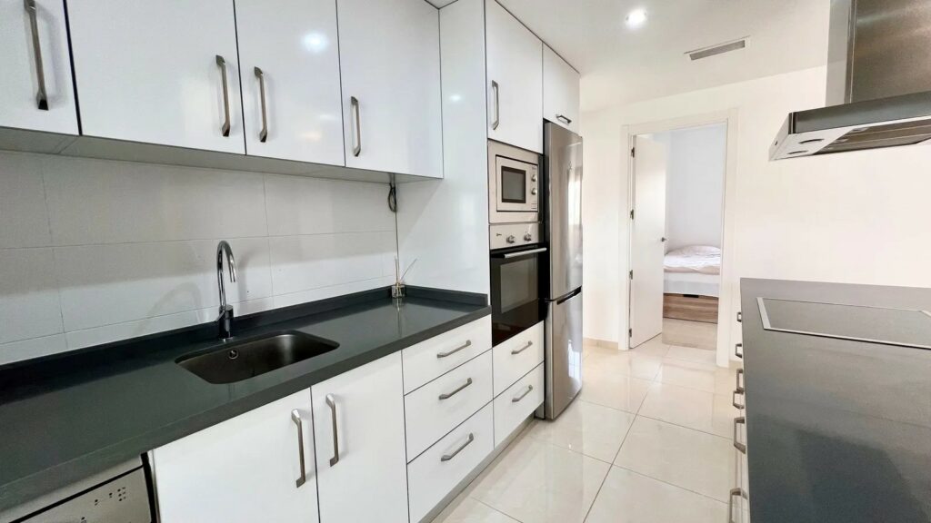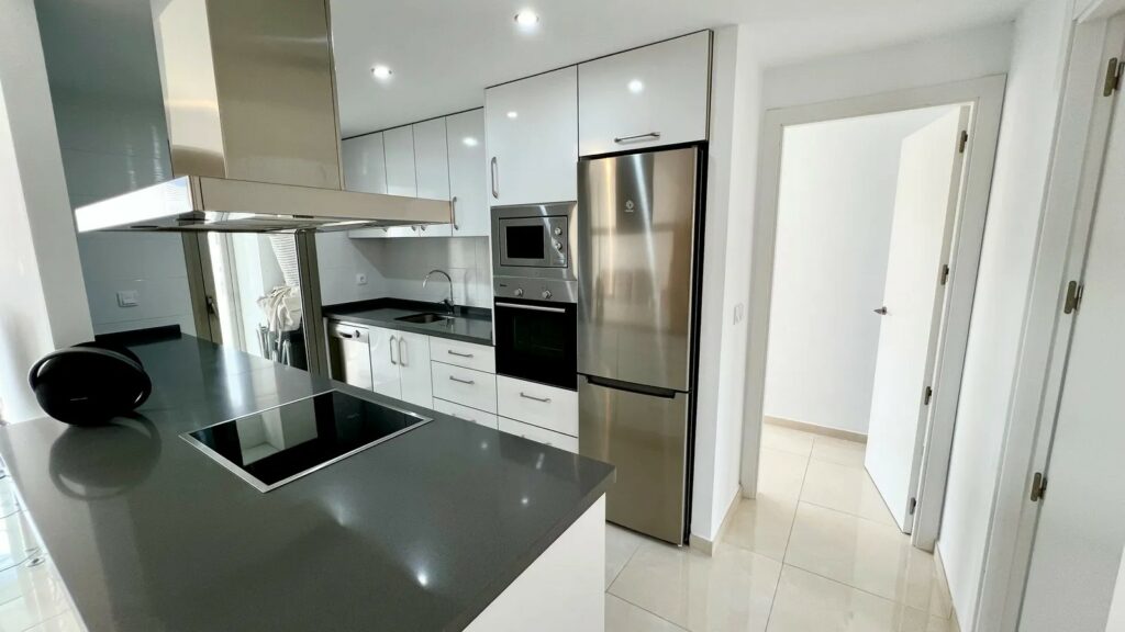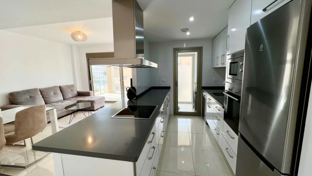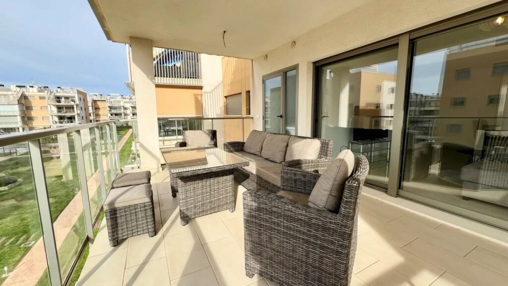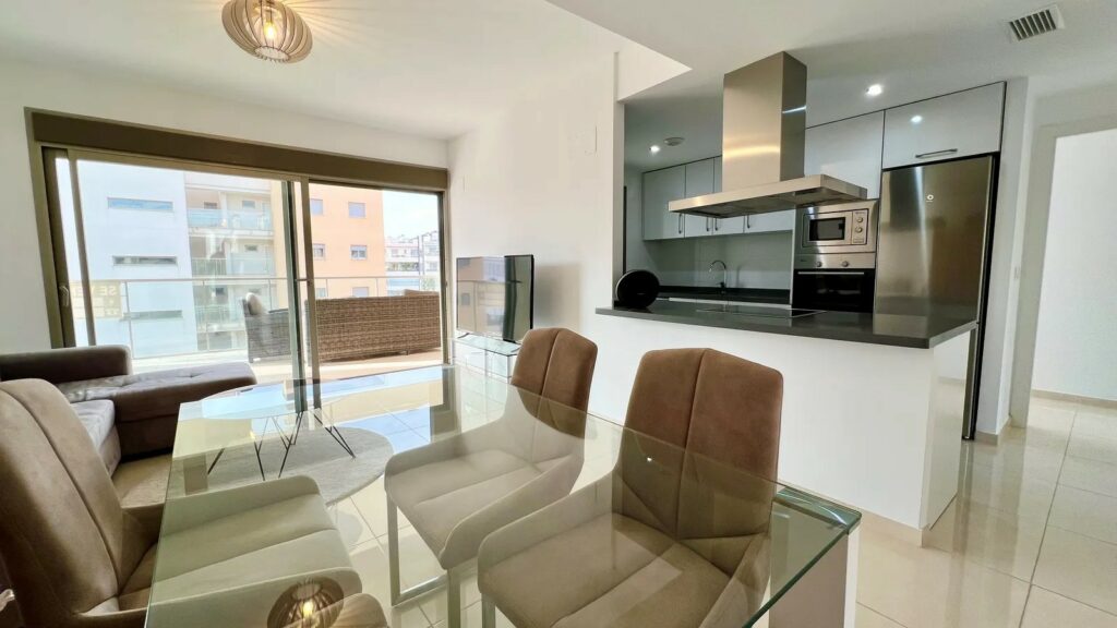 Denne luksuriøse leiligheten er utstyrt med alt du trenger, og alt i meget høy standard. Leiligheten har et fint kjøkken med vaskerom og åpen løsning mot den lyse fine stuen med plass til sofagruppe og spisebord. Herfra har du utgang til den store sør-vestvendte terrassen med utsikt over fellesområdene med basseng, petancabaner og fin beplantning.