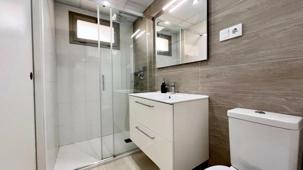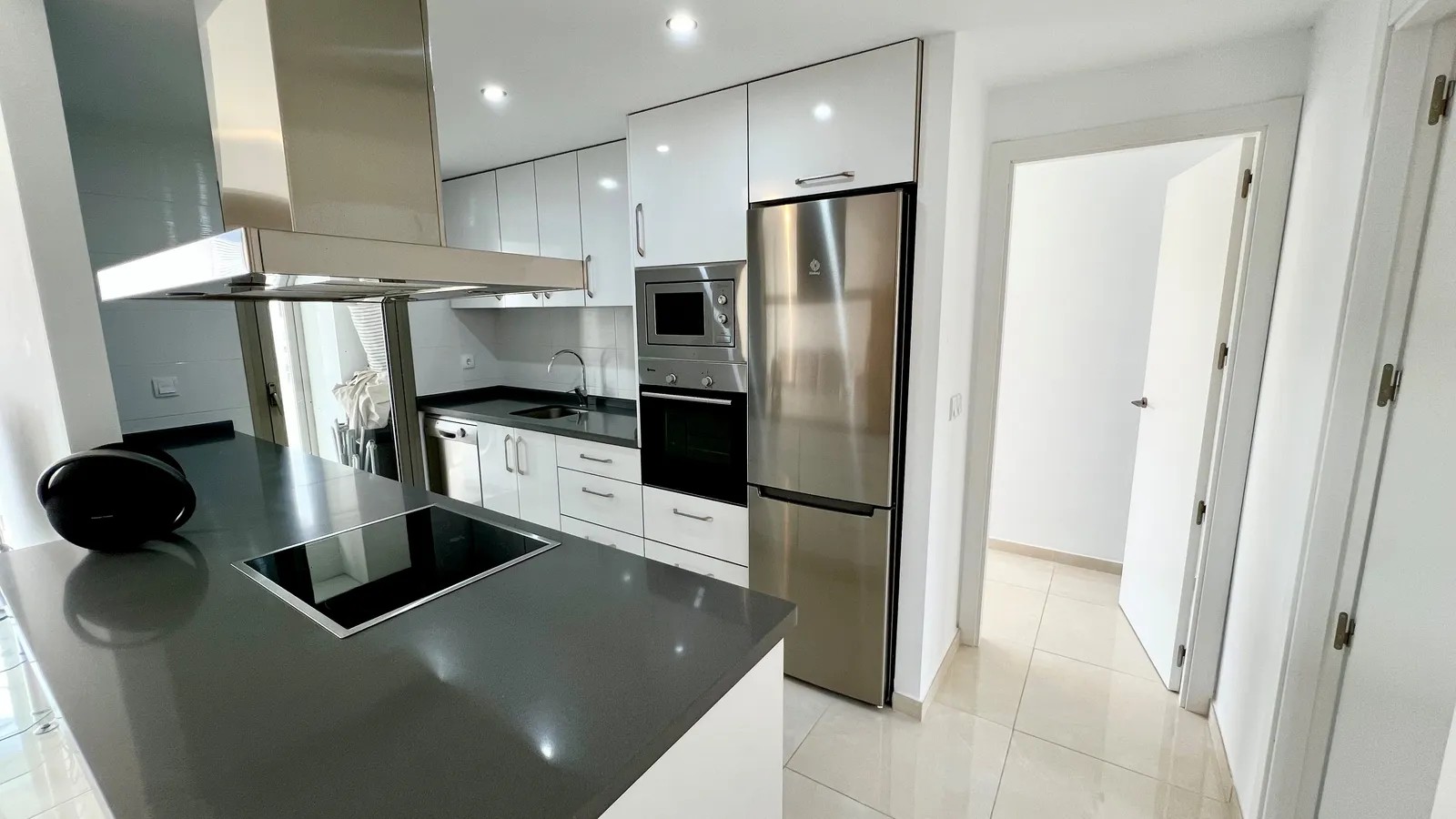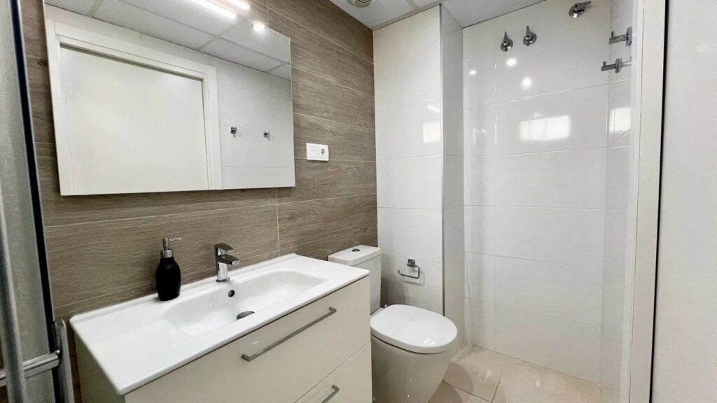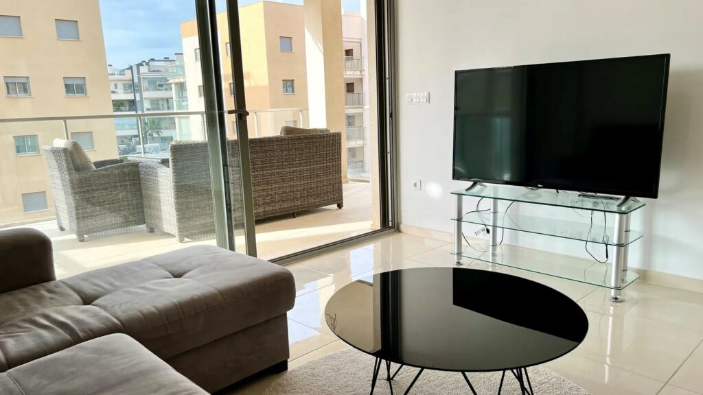 Denne luksuriøse leiligheten er utstyrt med alt du trenger, og alt i meget høy standard. Leiligheten har et fint kjøkken med vaskerom og åpen løsning mot den lyse fine stuen med plass til sofagruppe og spisebord. Herfra har du utgang til den store sør-vestvendte terrassen med utsikt over fellesområdene med basseng, petancabaner og fin beplantning.
