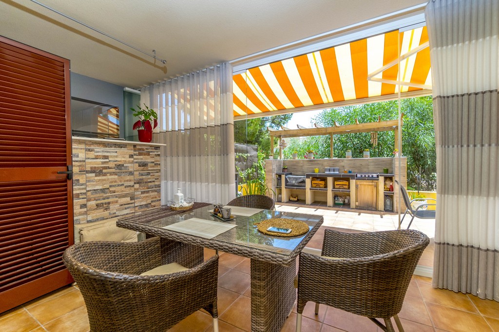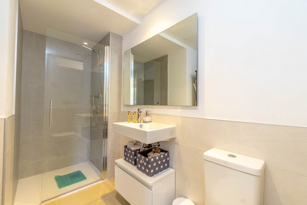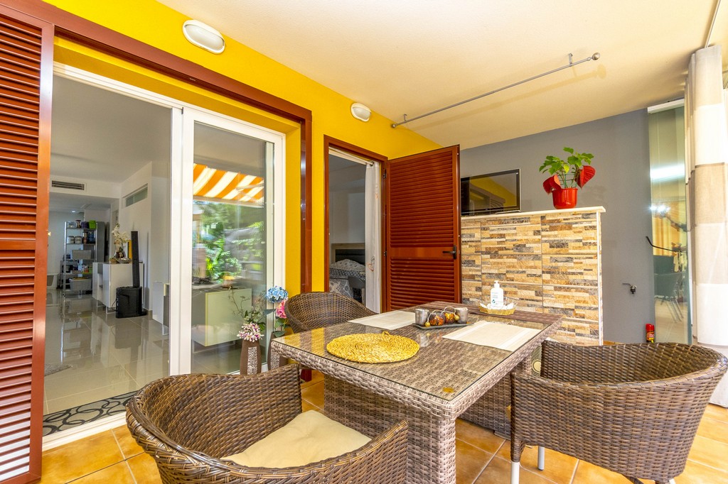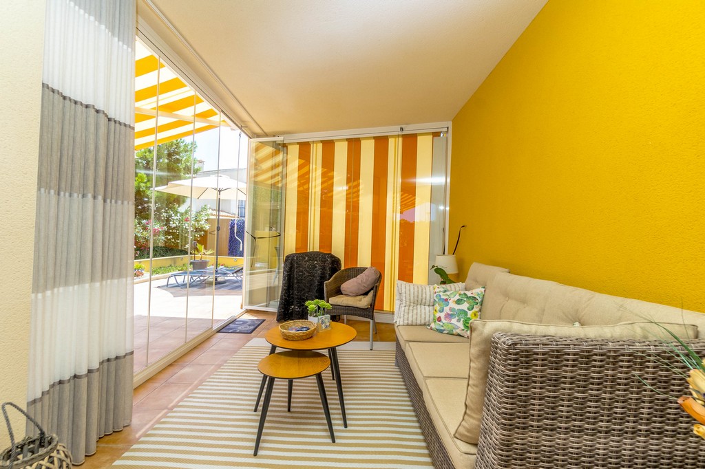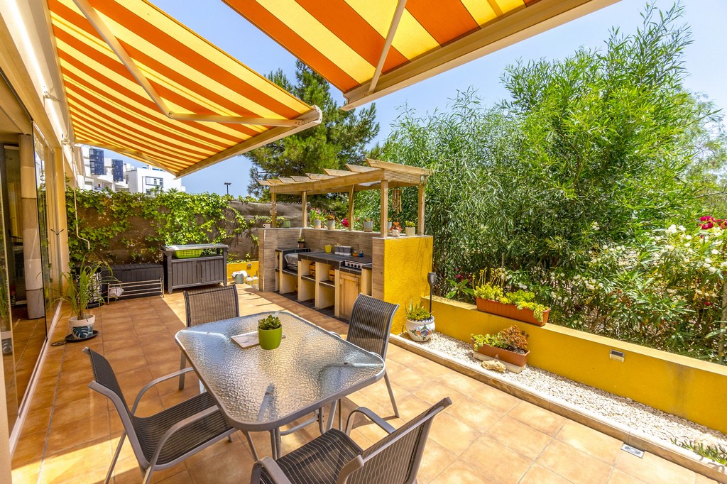 Moderne sydvendt leilighet på bakkeplan. Med et areal på 73 m2 har den 2 soverom, 2 bad, stue, fullt utstyrt åpent kjøkken, overbygd og innglasset terrasse på 23 m2, og en stor hage på 128 m2. Sentralisert klimaanlegg. gjennomgående kanal. Gulvvarme på bad. Selges delvis møblert.