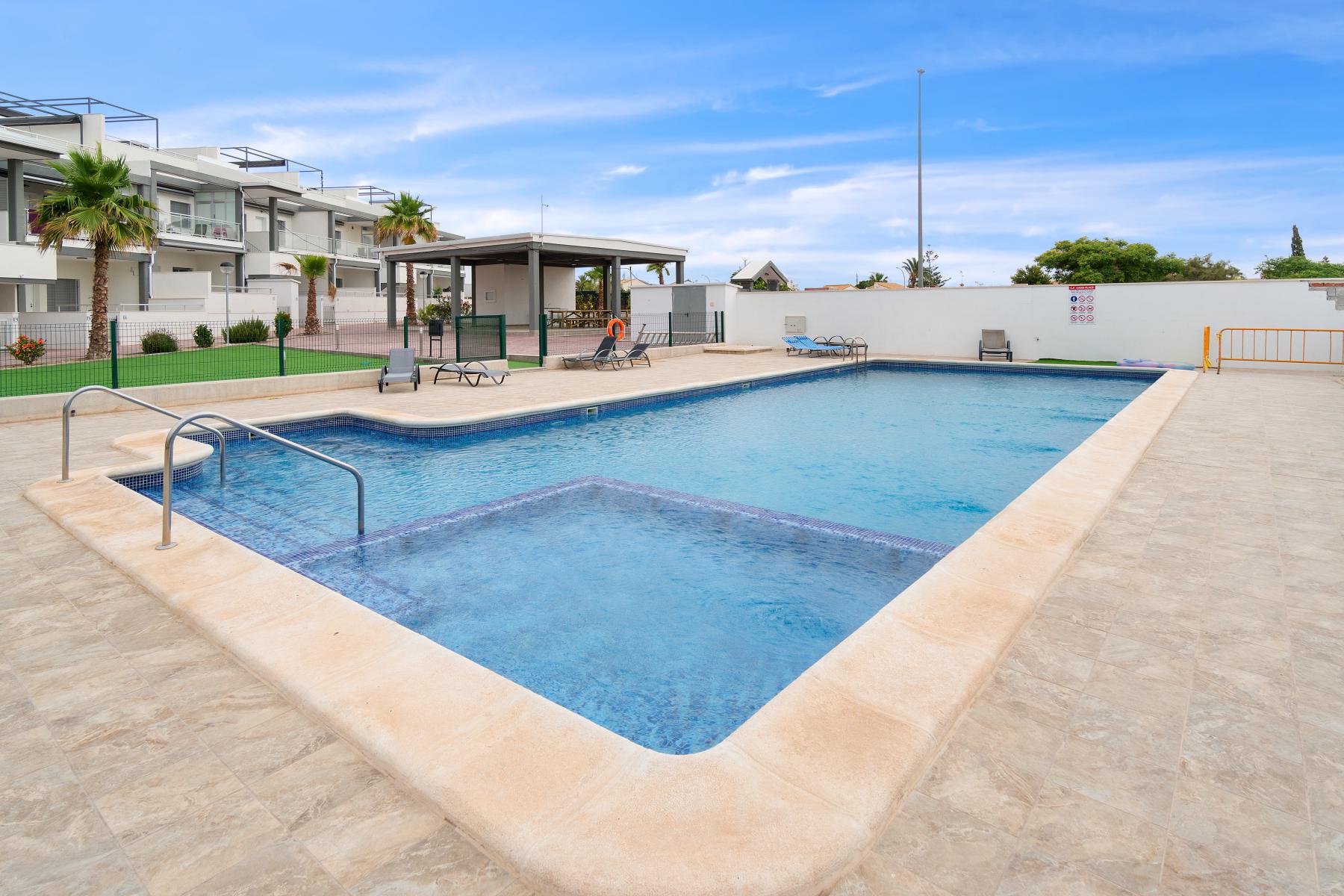 Det er kun 3 kilometer til sjøen og flotte badestrender. Til Torrevieja sentrum er det omtrent 6 km. Her finnes alt du måtte trenge av fasiliteter i gangavstand fra boligen. Det finnes også minigolf, go-cart, flotte turområder, gater med palmer og hyggelige torg, så her finnes det noe for enhver smak. Det er 6 golfbaner innenfor 15 minutter kjørsel.
