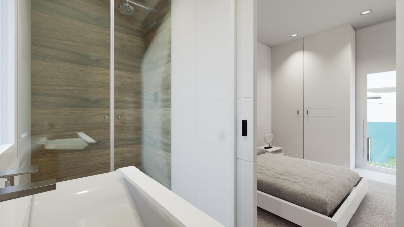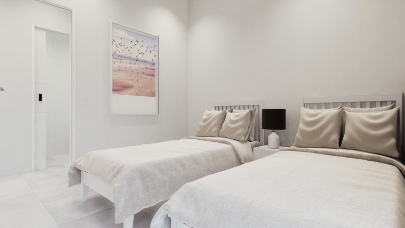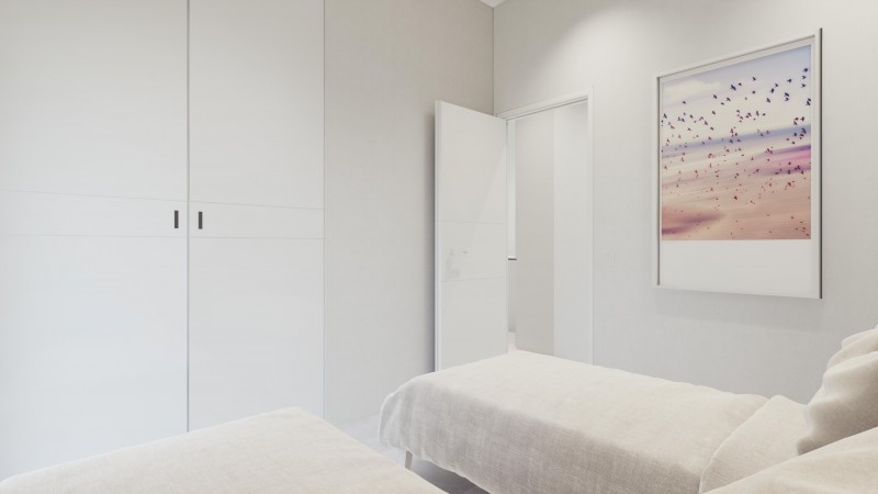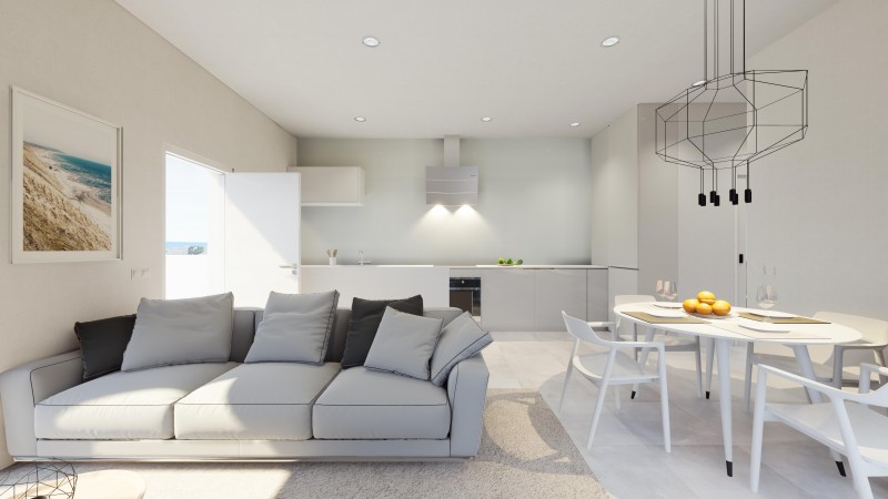 Leilighetene har åpen kjøkkenløsning ut mot stuen, 2 soverom, 2 bad og en terrasse som varierer i størrelse fra 8 m2 til 29 m2 med utsikt over bassengområdet.