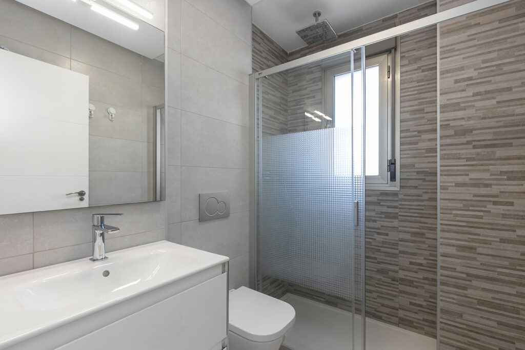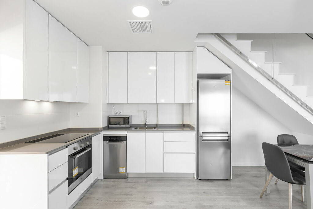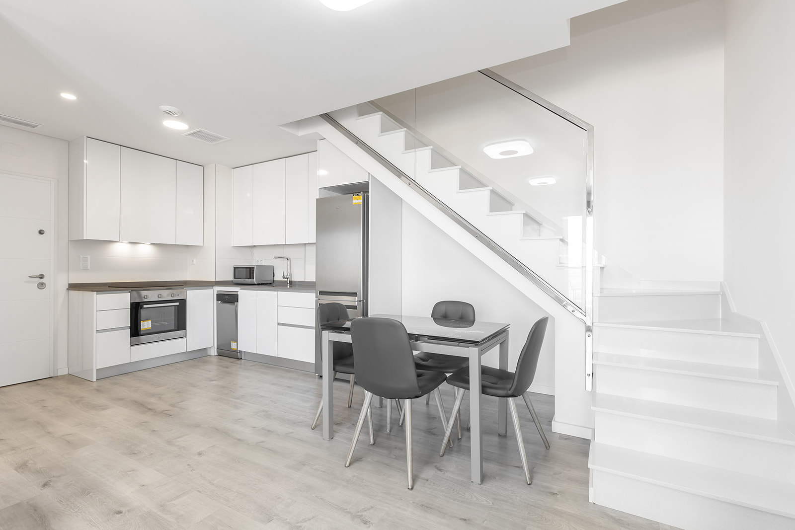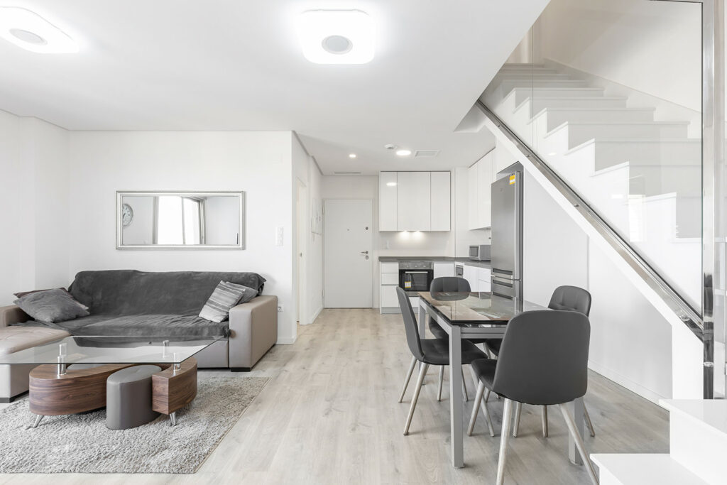 Denne flotte leiligheten har 3 soverom med garderobeskap, 2 moderne bad og spisestue/stue med åpen løsning mot kjøkkenet med hvitevarer.