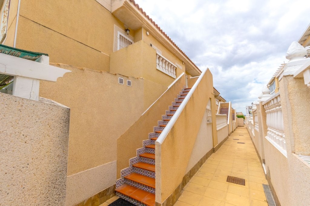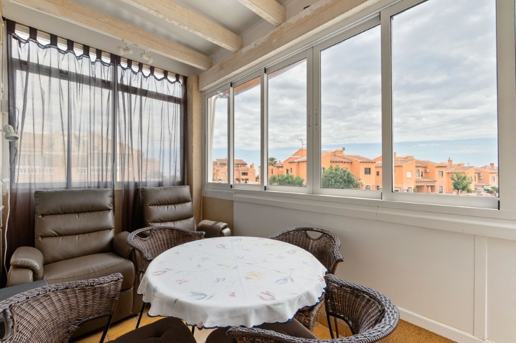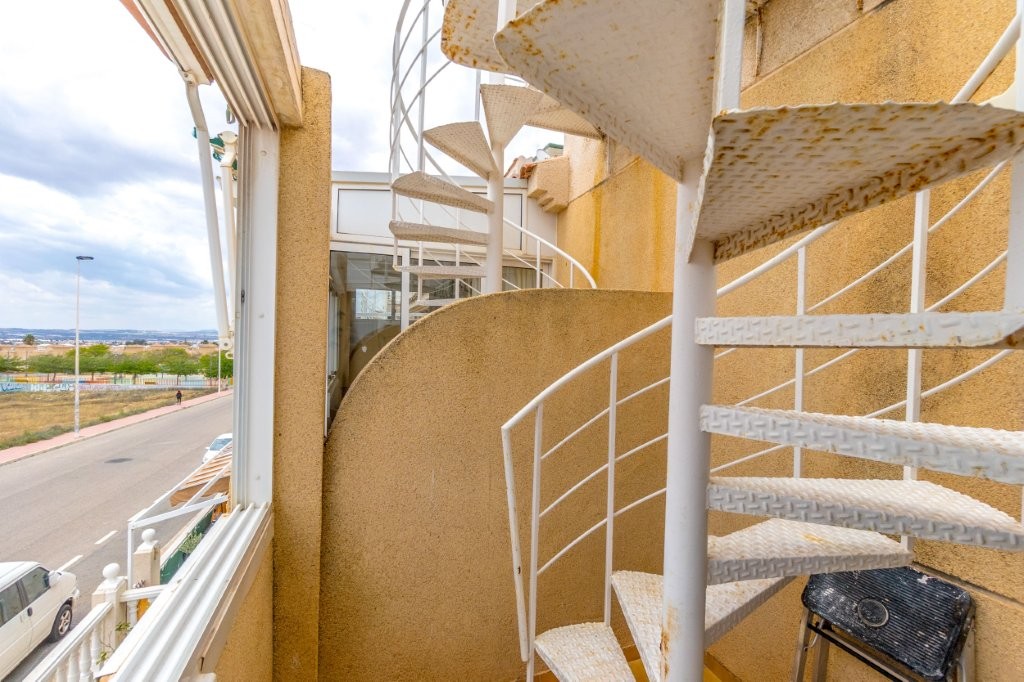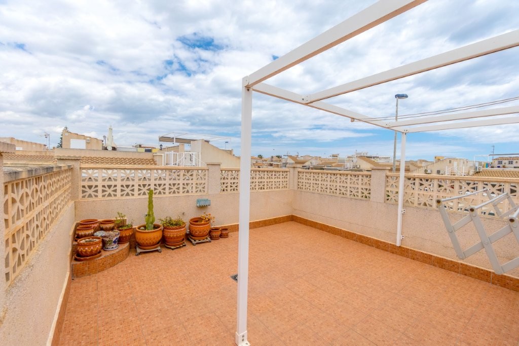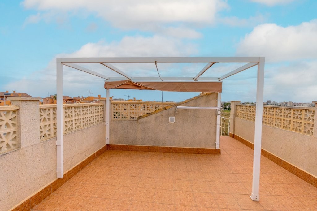Utenfor stuen er det en terrasse glassgardiner som kan åpnes helt. Herfra er det en trapp opp til den private takterrassen hvor det er en praktisk bod. Her kan du nyte solen og den fantastiske utsikten mot Torrevieja sentrum, saltsjøen, og du kan se Middelhavet