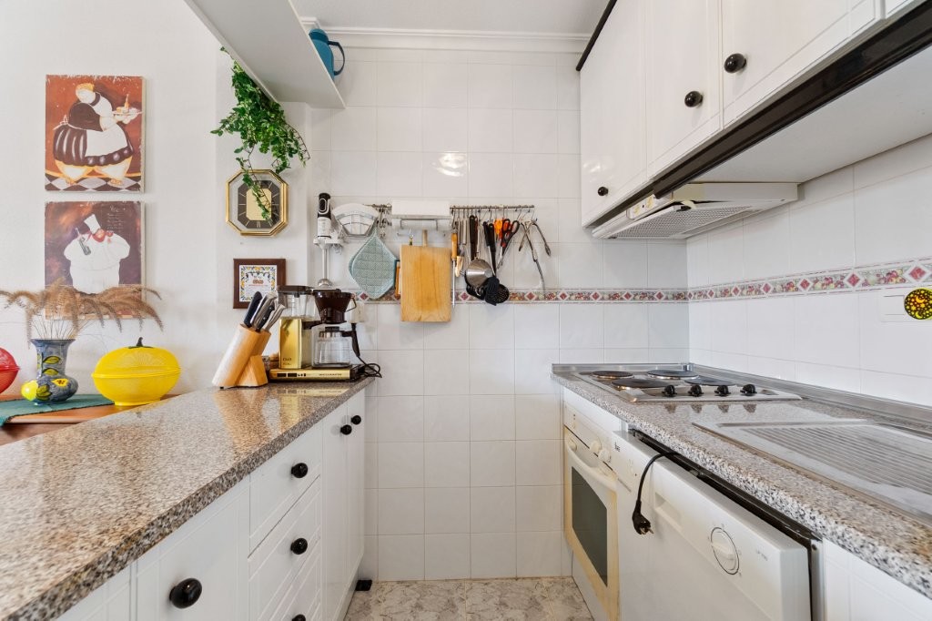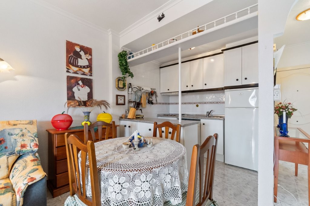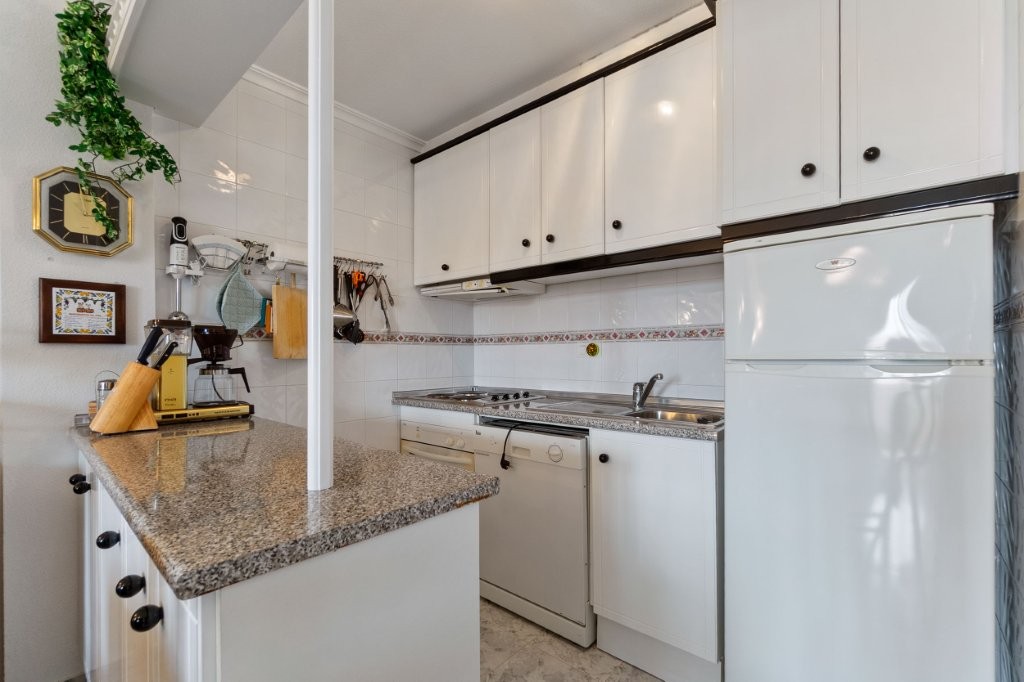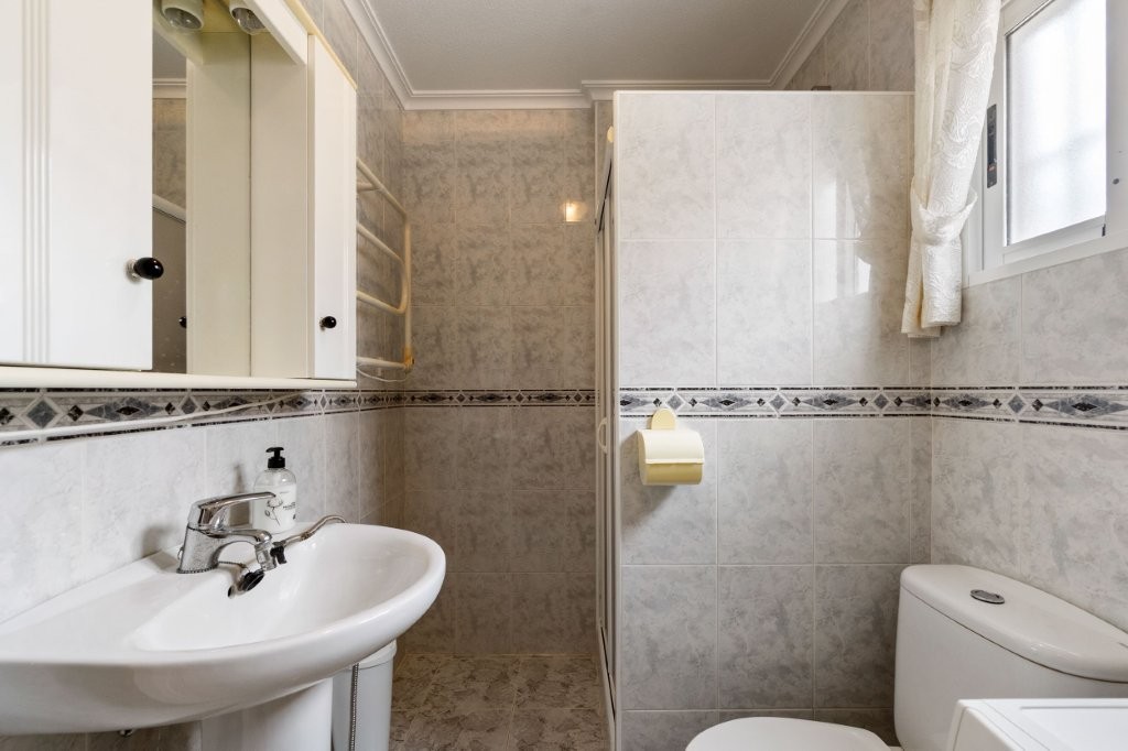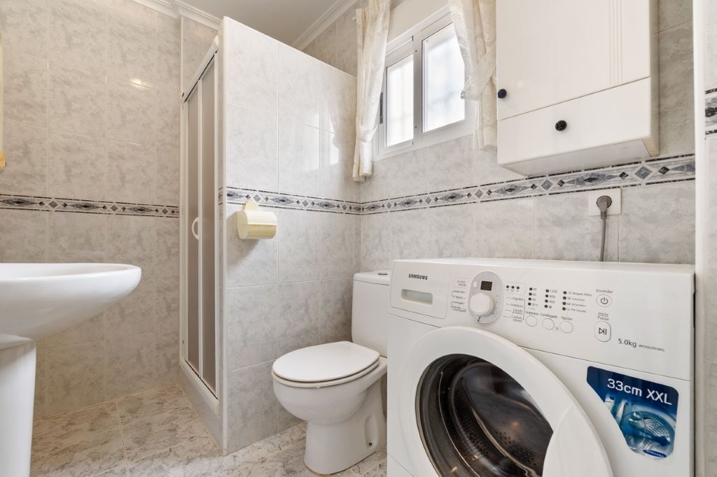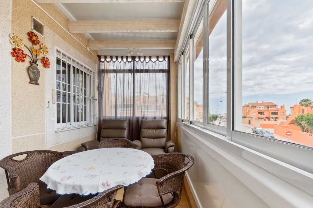 Utenfor stuen er det en terrasse glassgardiner som kan åpnes helt. Herfra er det en trapp opp til den private takterrassen hvor det er en praktisk bod. Her kan du nyte solen og den fantastiske utsikten mot Torrevieja sentrum, saltsjøen, og du kan se Middelhavet
