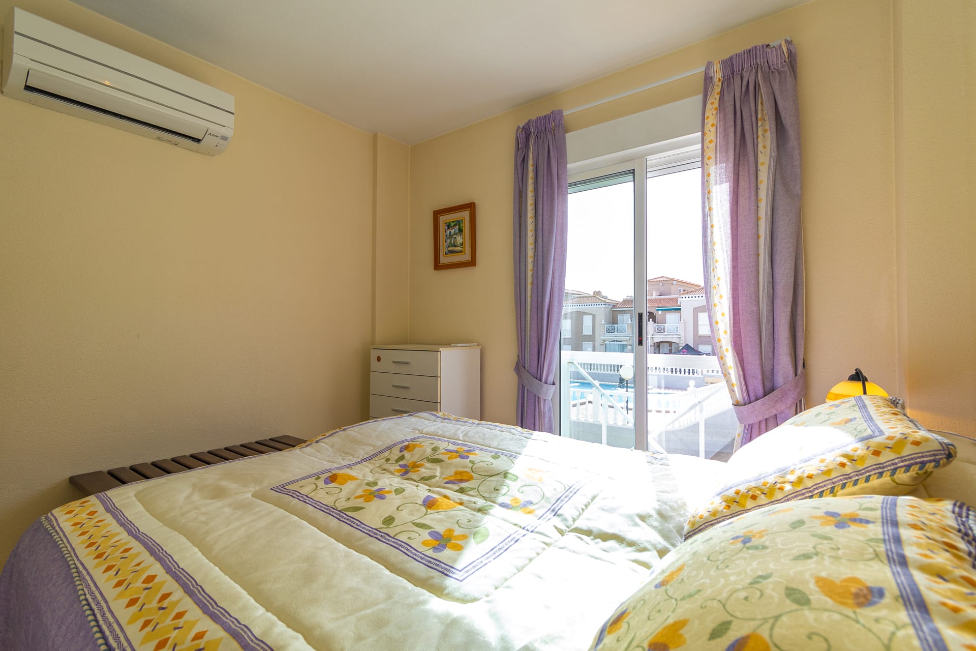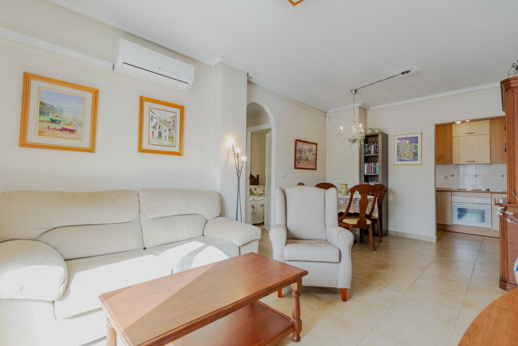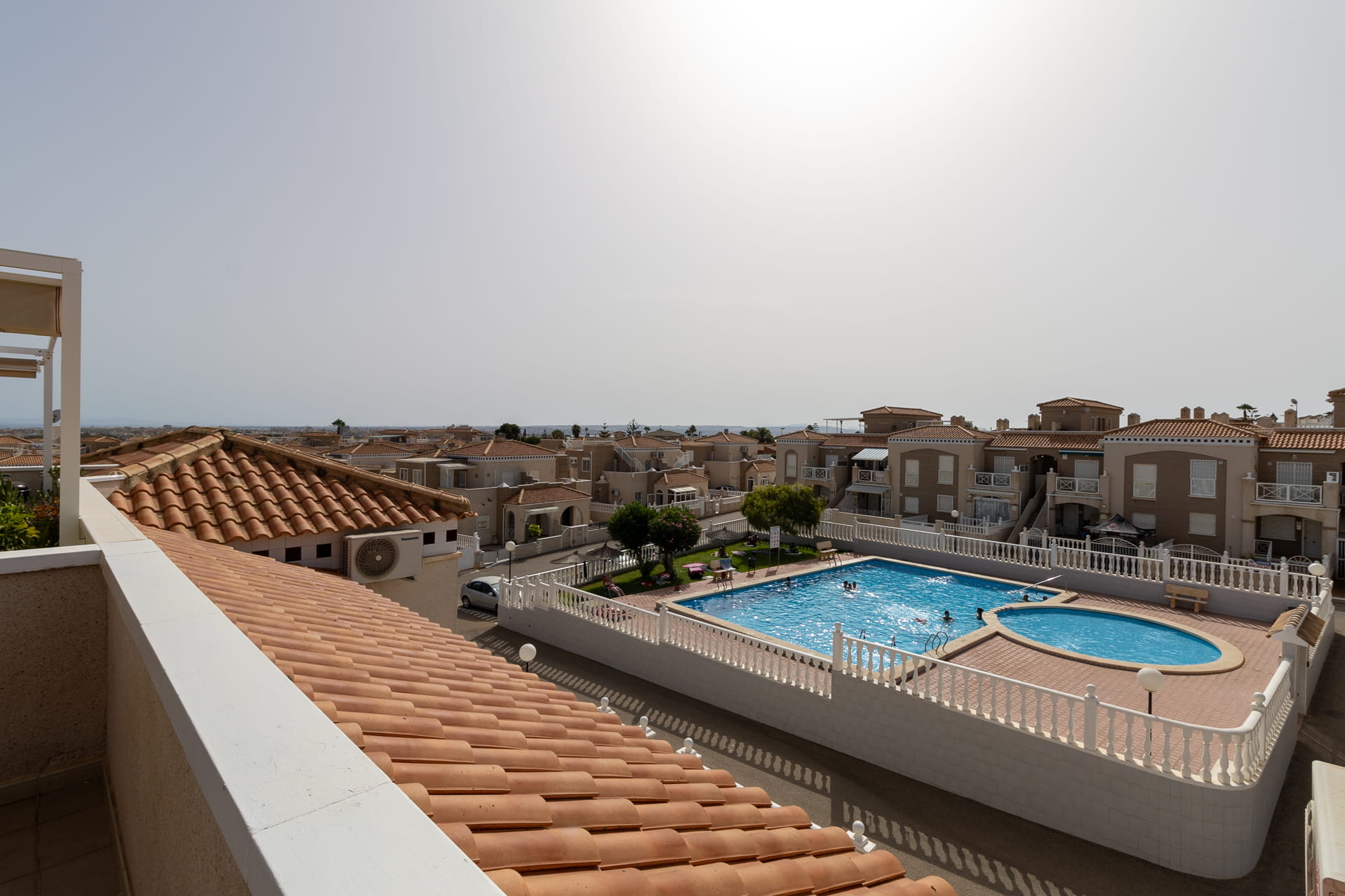 Denne fine toppleiligheten på 62 m2 har 2 soverom,1 bad, åpen kjøkken løsning og stue med utgang til en terrasse med utsikt over bassenget.