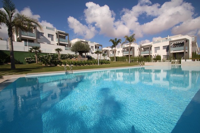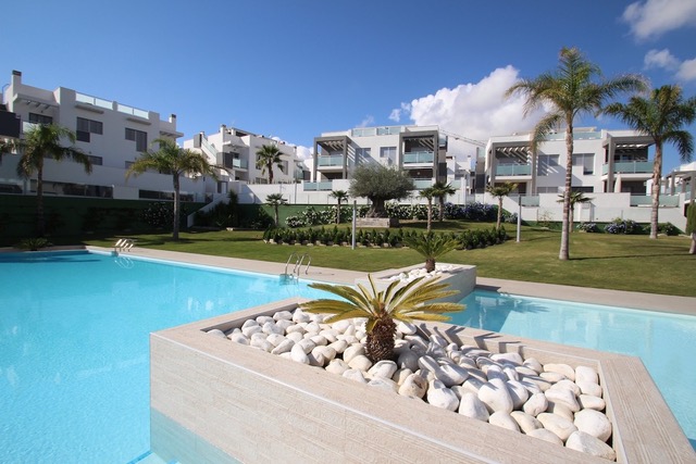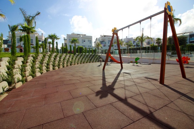 Et veldig fint og påkostet fellesområde på over 3.500 kvadratmeter som tilbyr to store bassengområder, hvorav den ene er oppvarmet, lekeplass og vakker baplantning.