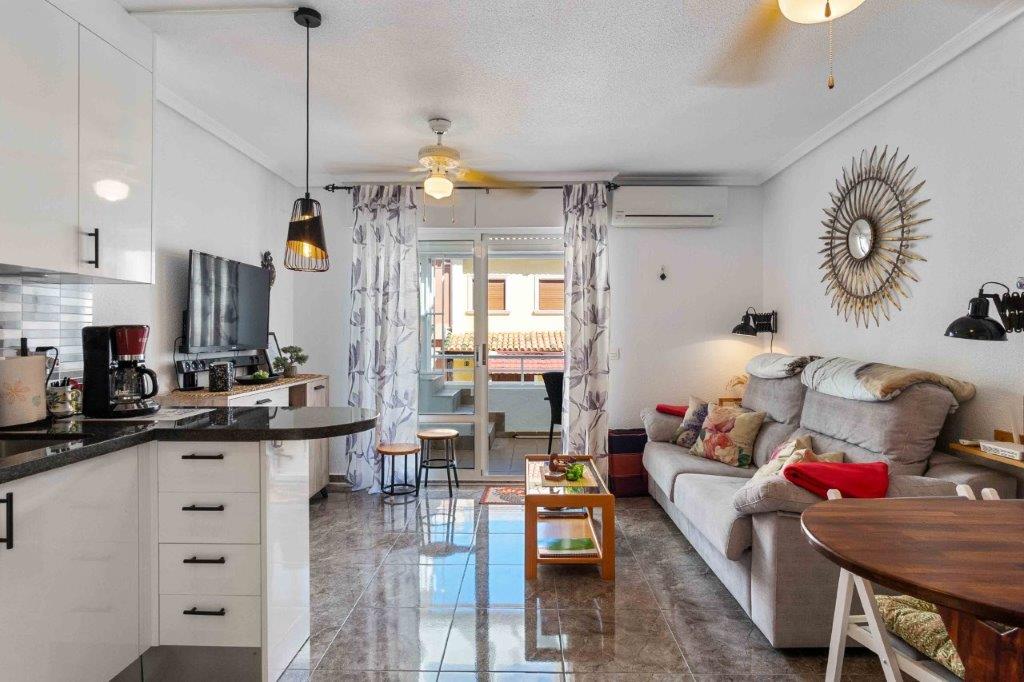 Det er 1 soverom, 1 bad og åpen løsning mellom det renoverte kjøkkenet og stuen. Utenfor stuen er det en overbygget terrasse og trapp opp til den fine takterrassen med havutsikt.