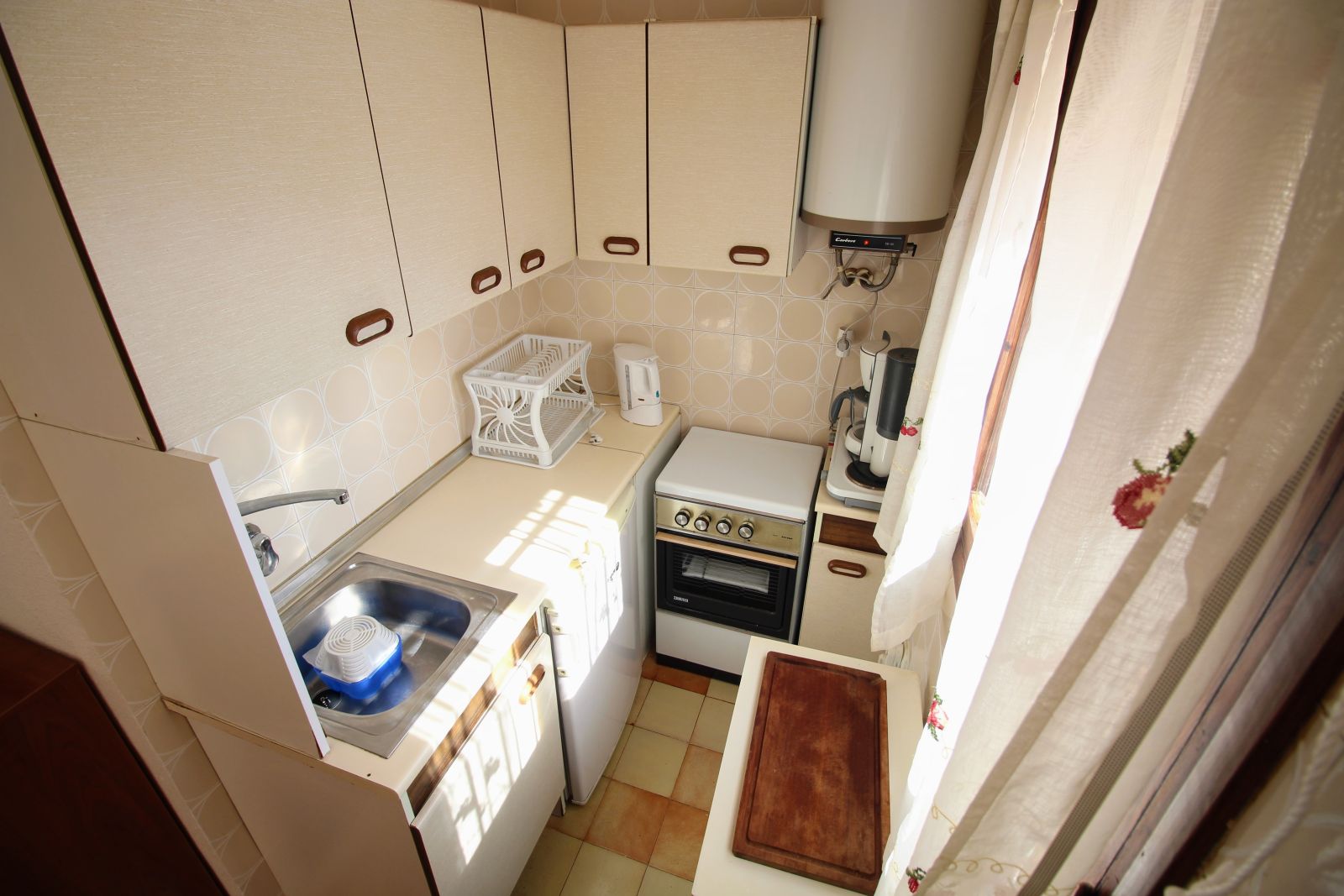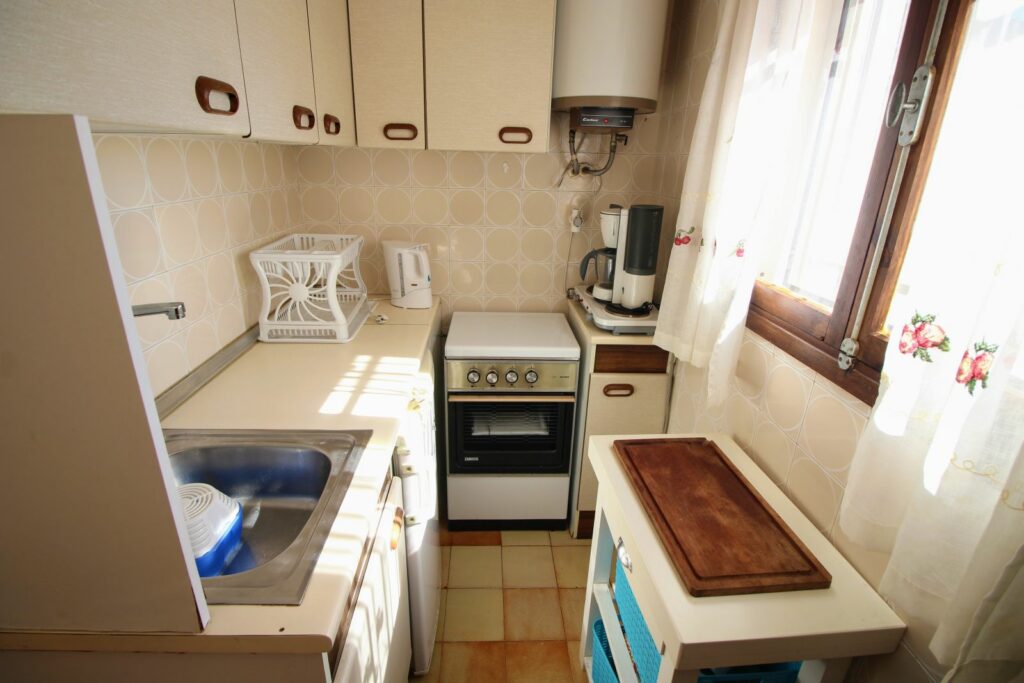 Fra balkongen foran kommer du inn i stue og spisestue. Ved siden av stuen er det et kompakt kjøkken.