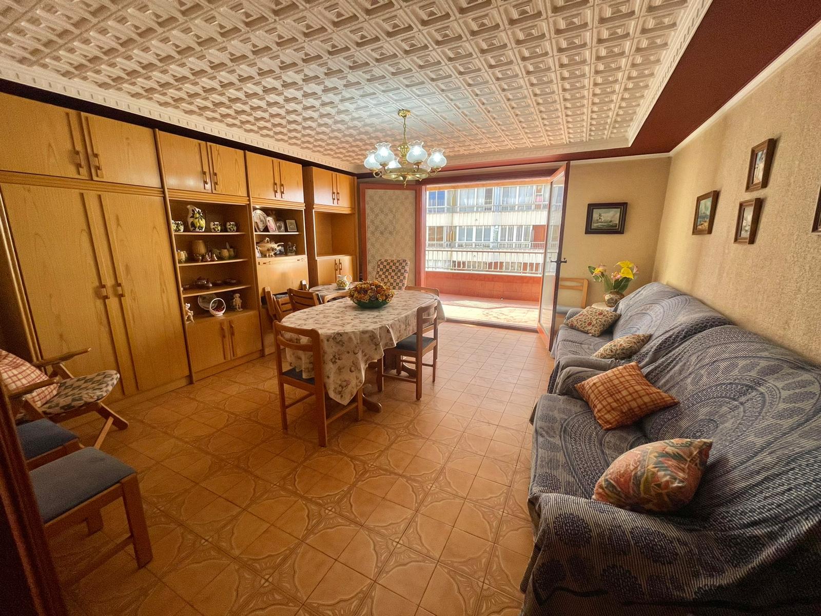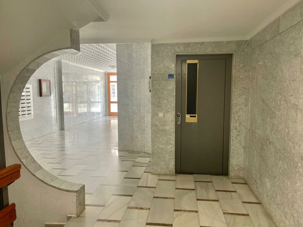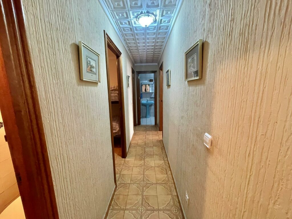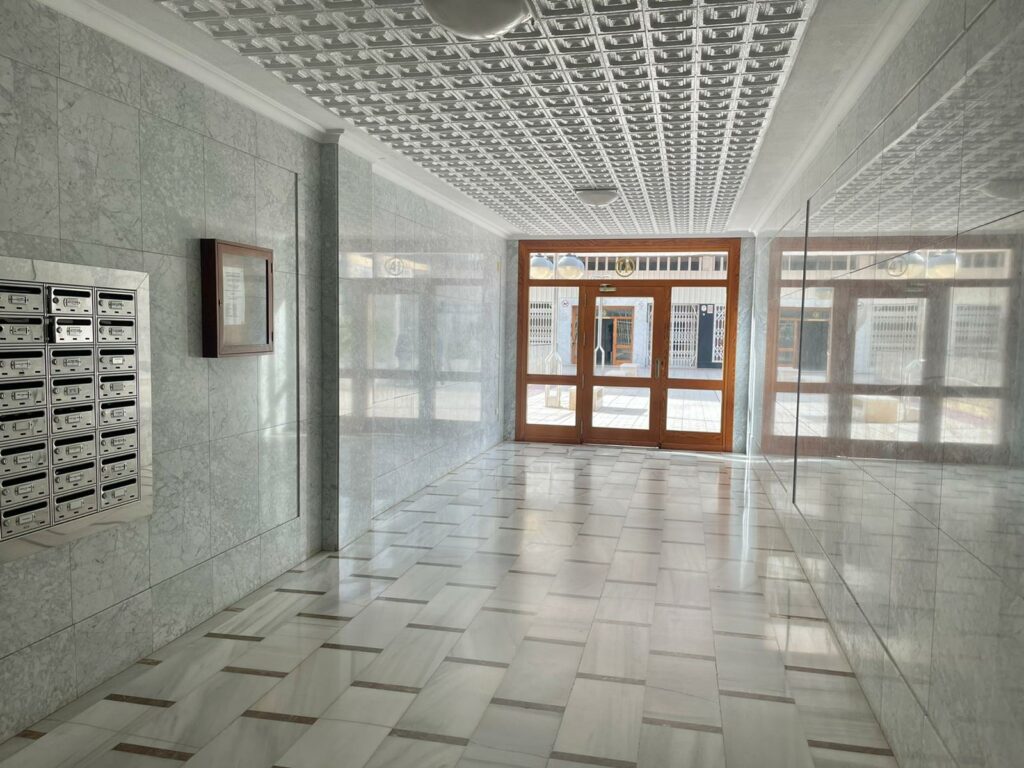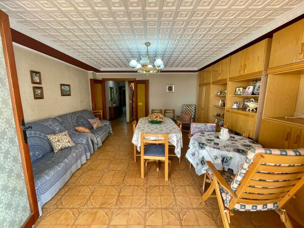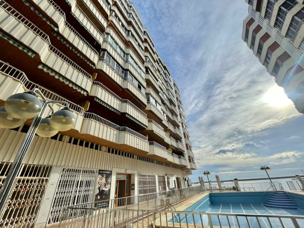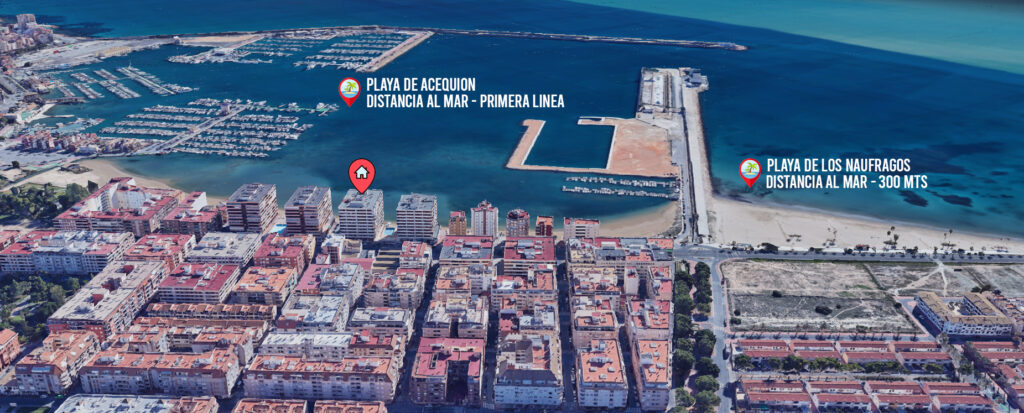 Leiligheten på 90 m2 ligger i blokkens i femte etasje. Bygningen heter Navamares III og ligger på første linje ved Playa del Acequion i Torrevieja.