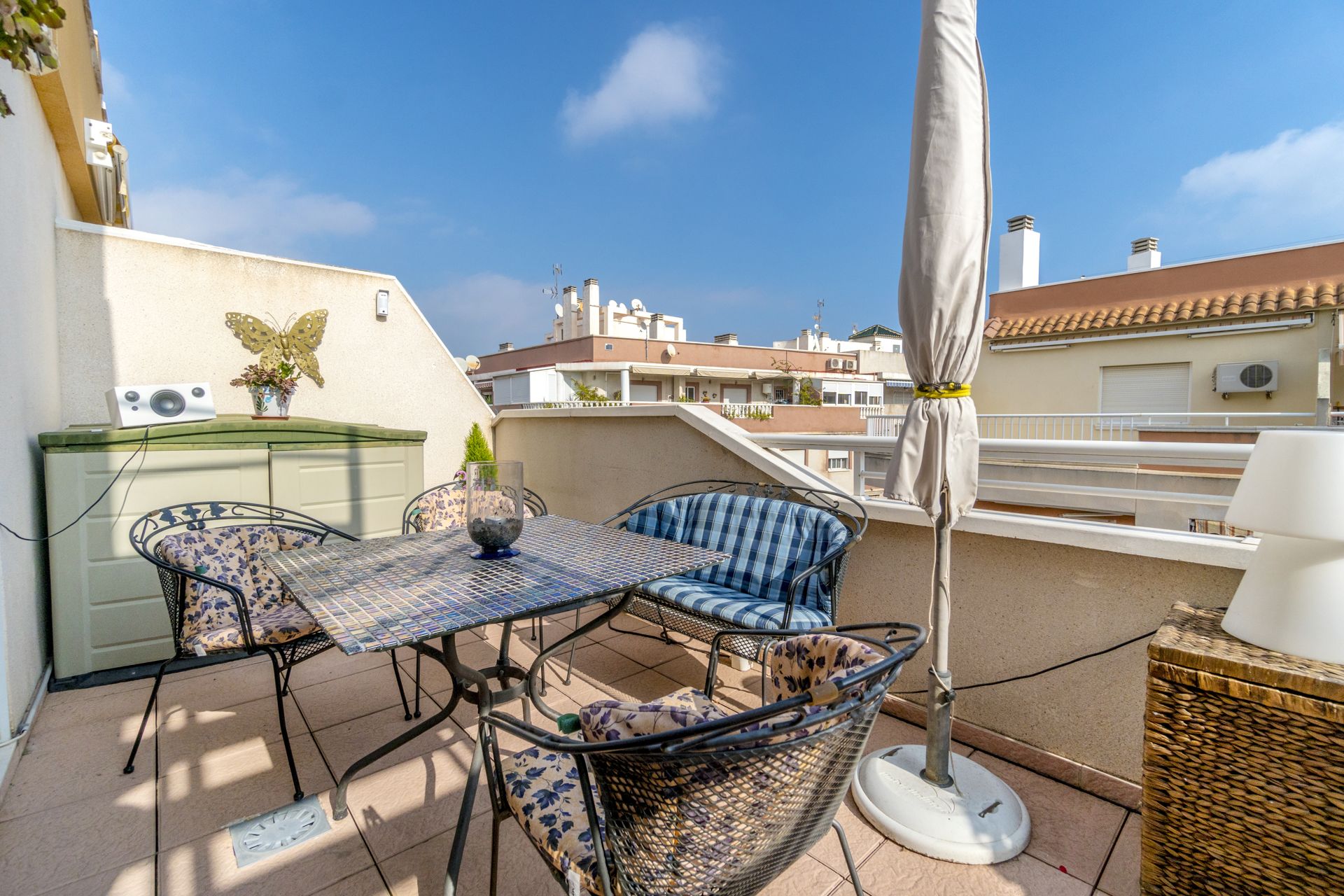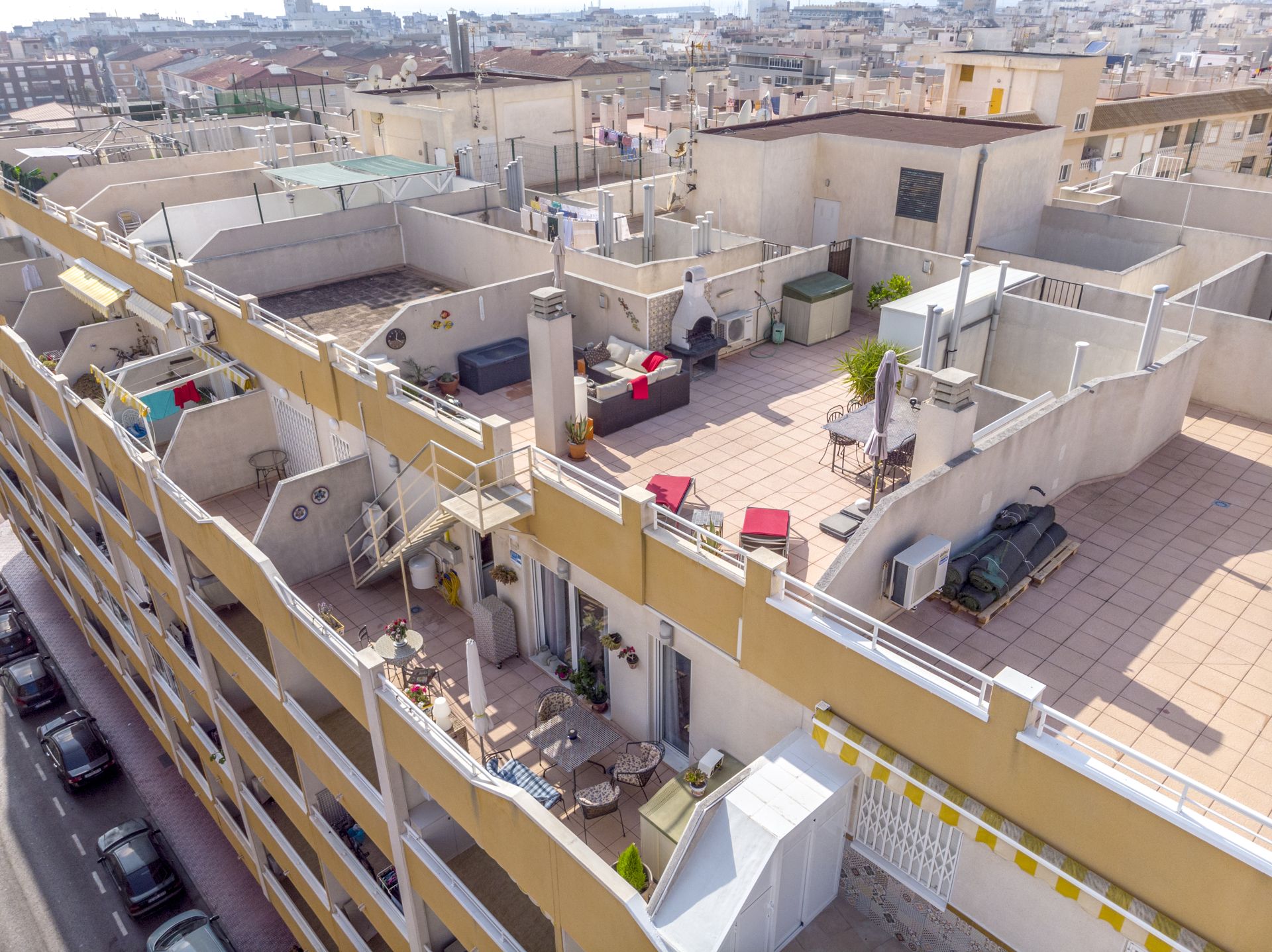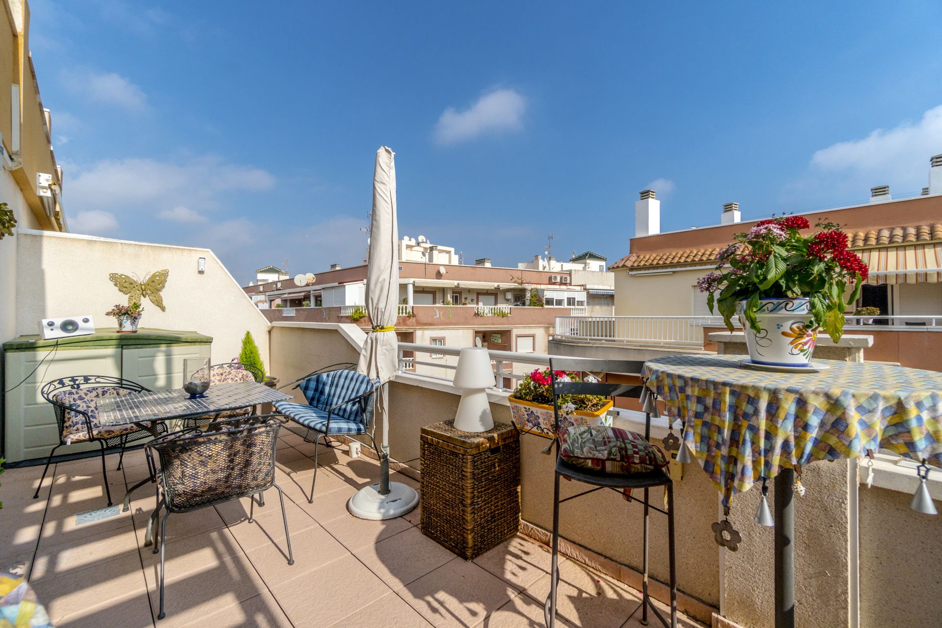 Meget sentral beliggenhet i Torrevieja kun 650 meter fra den flotte strandpromenaden og 700 meter fra Playa del Cura. Boligen ligger i byen, men likevel i et rolig strøk. Området er populært på grunn av nærheten til sentrum og til havet. Dette er et etablert område som lever hele året og det finnes alt du måtte trenge av fasiliteter i gangavstand fra boligen, som lokale hyggelige barer og restauranter, og ikke minst Middelhavet. Matbutikk ligger like ved.