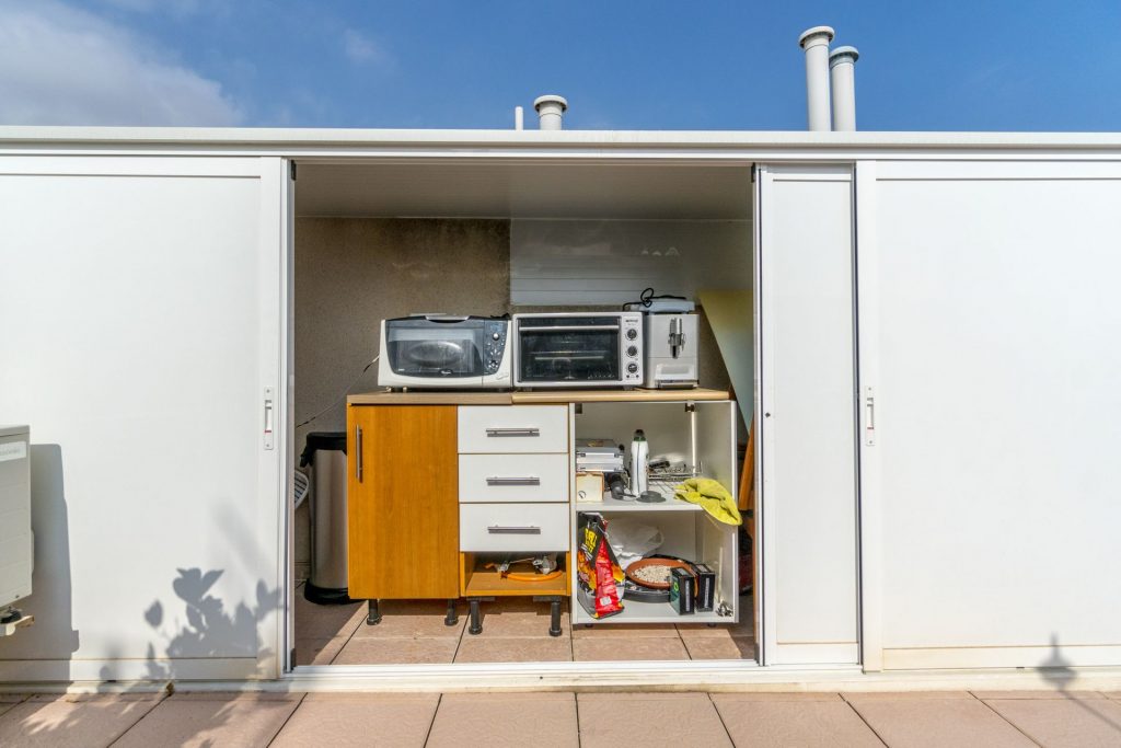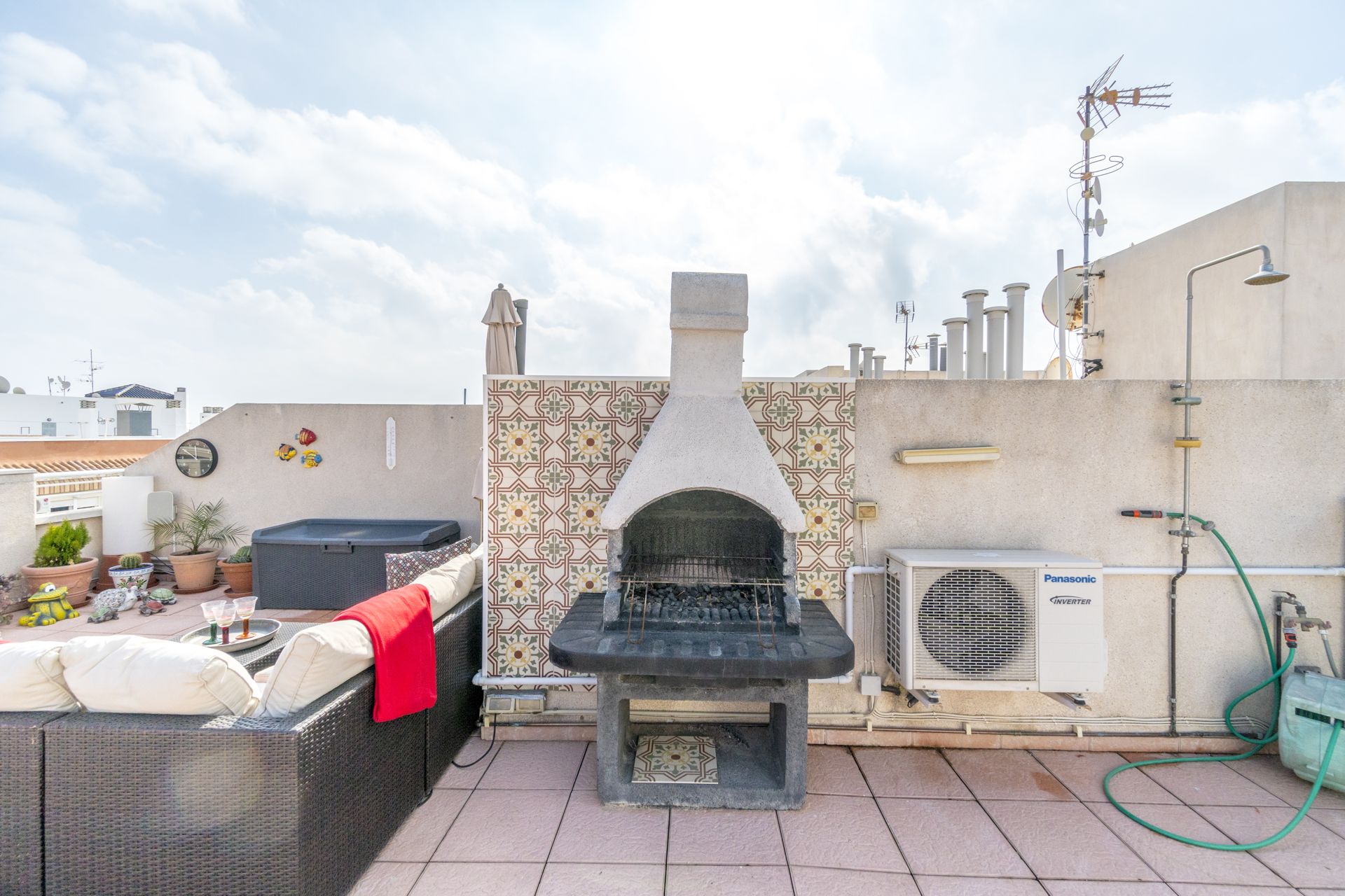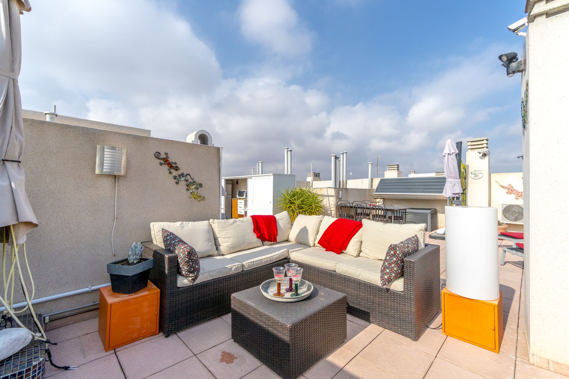 Rett utenfor stuen er det en stor terrasse, her har du sol fra morgen til på ettermiddagen, fantastisk lun og koselig terrasse, fra denne terrassen er det en trapp rett opp på et stor takterrasse på 75 m2 hvor det installert et utekjøkken med kjøleskap ovn, mikrobølgeovn og selvfølgelig en grill.