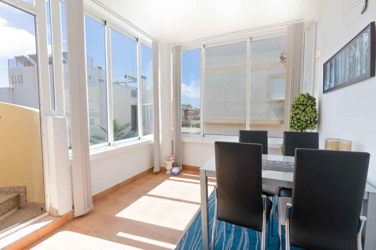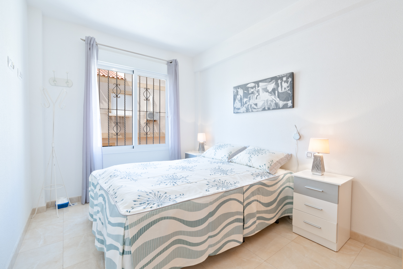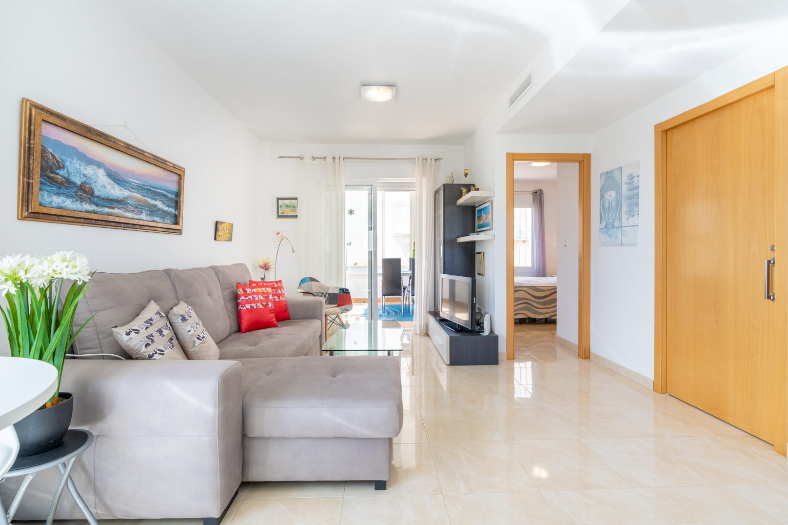 Denne fine leiligheten har 2 soverom med innebygde garderober, 1 bad og en åpen løsning mellom kjøkkenet og stue. Det er en fin innglasset terrasse hvor det går en trapp opp til den store takterrassen. Her har du nydelig utsikt over Middelhavet.