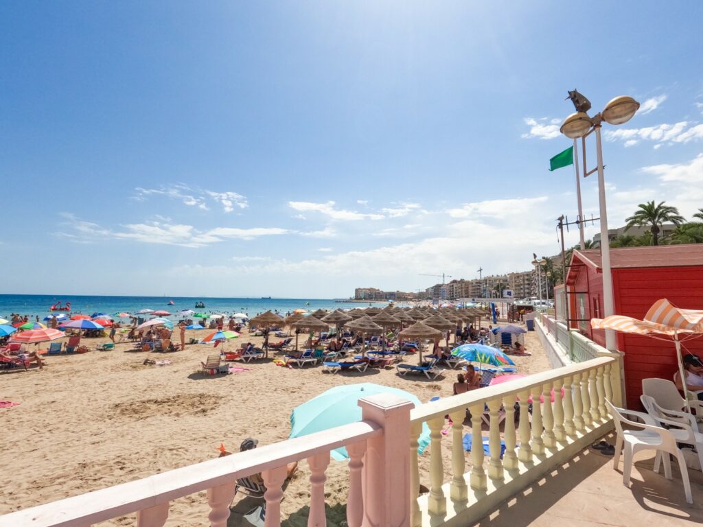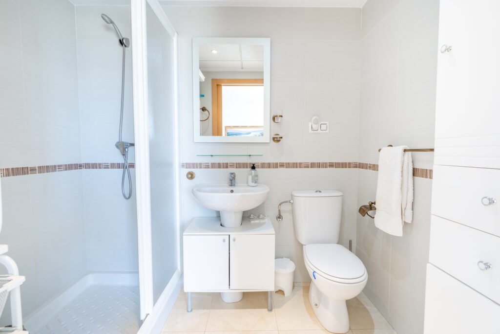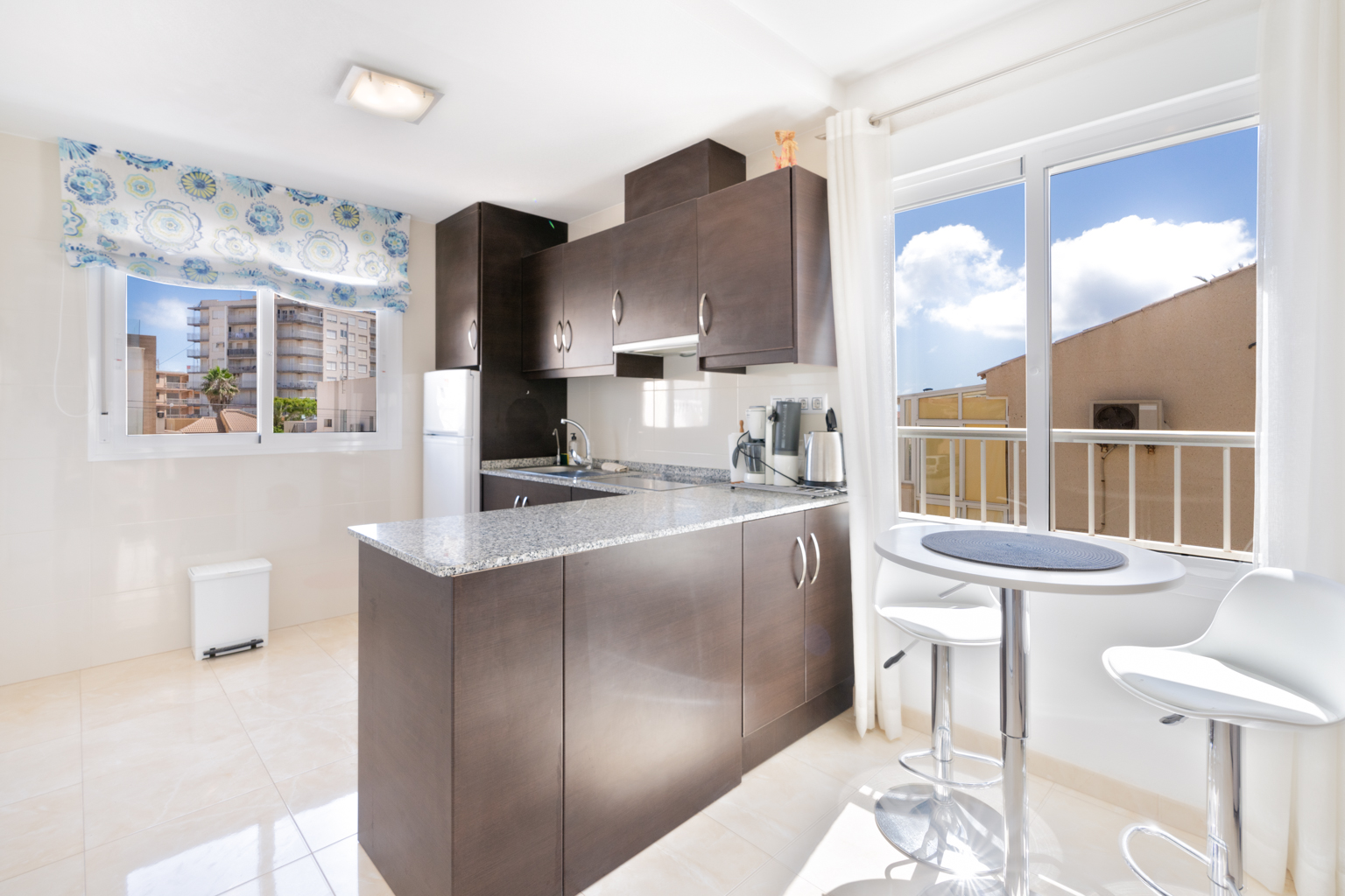 Denne fine leiligheten har 2 soverom med innebygde garderober, 1 bad og en åpen løsning mellom kjøkkenet og stue. Det er en fin innglasset terrasse hvor det går en trapp opp til den store takterrassen. Her har du nydelig utsikt over Middelhavet.