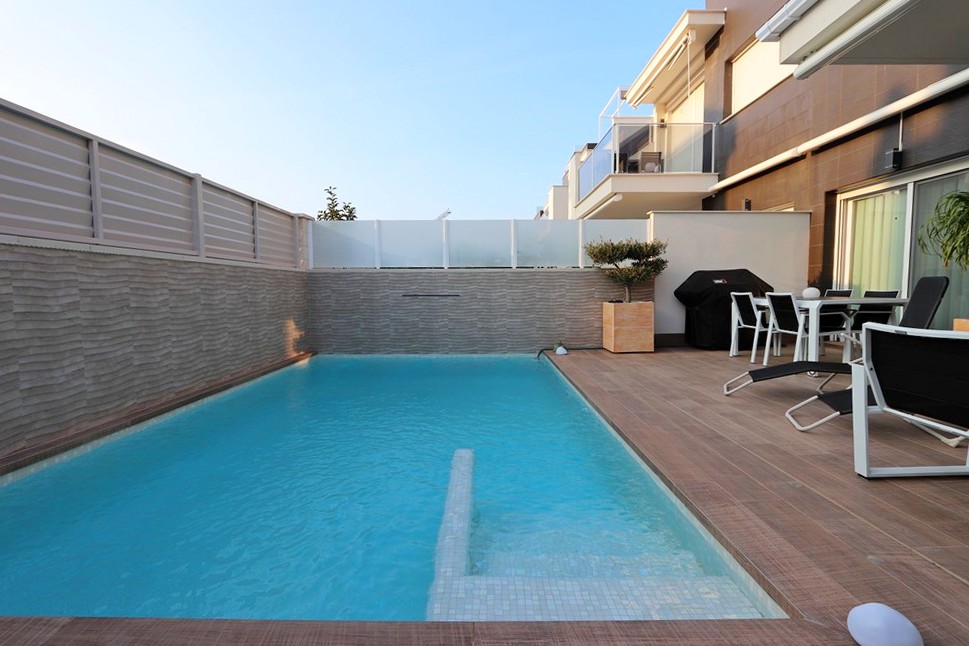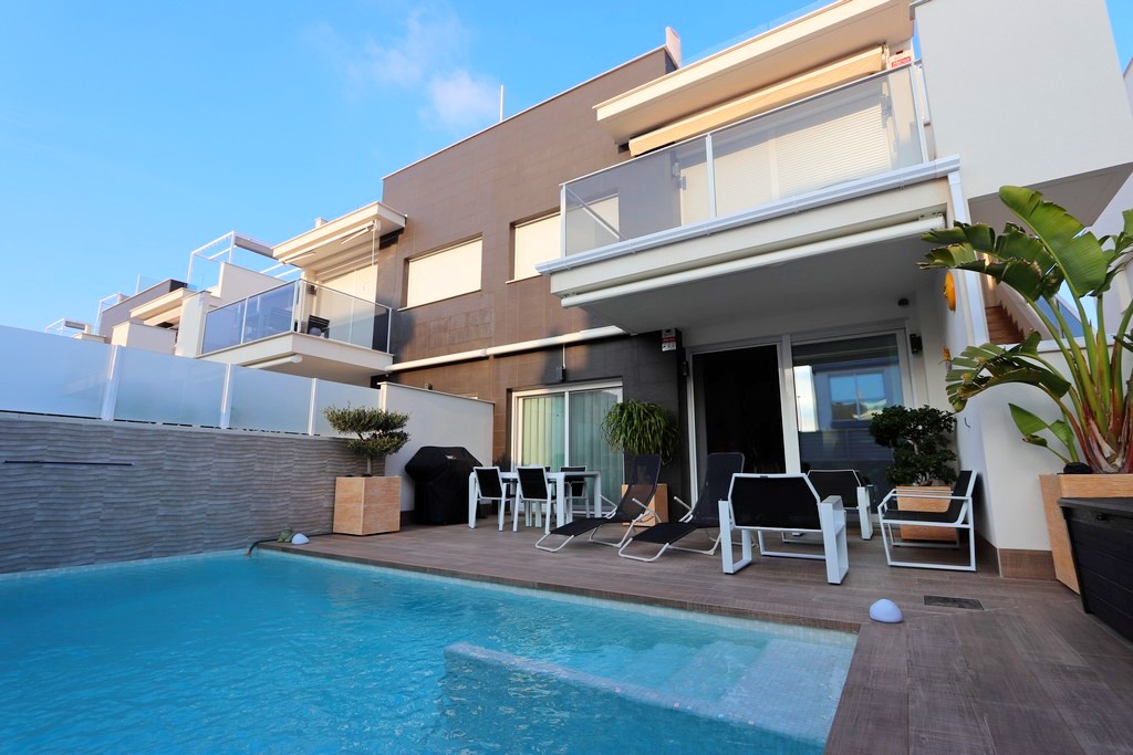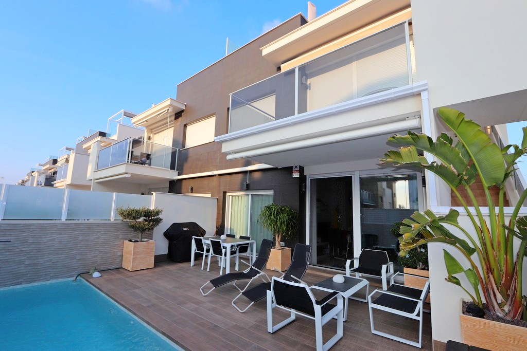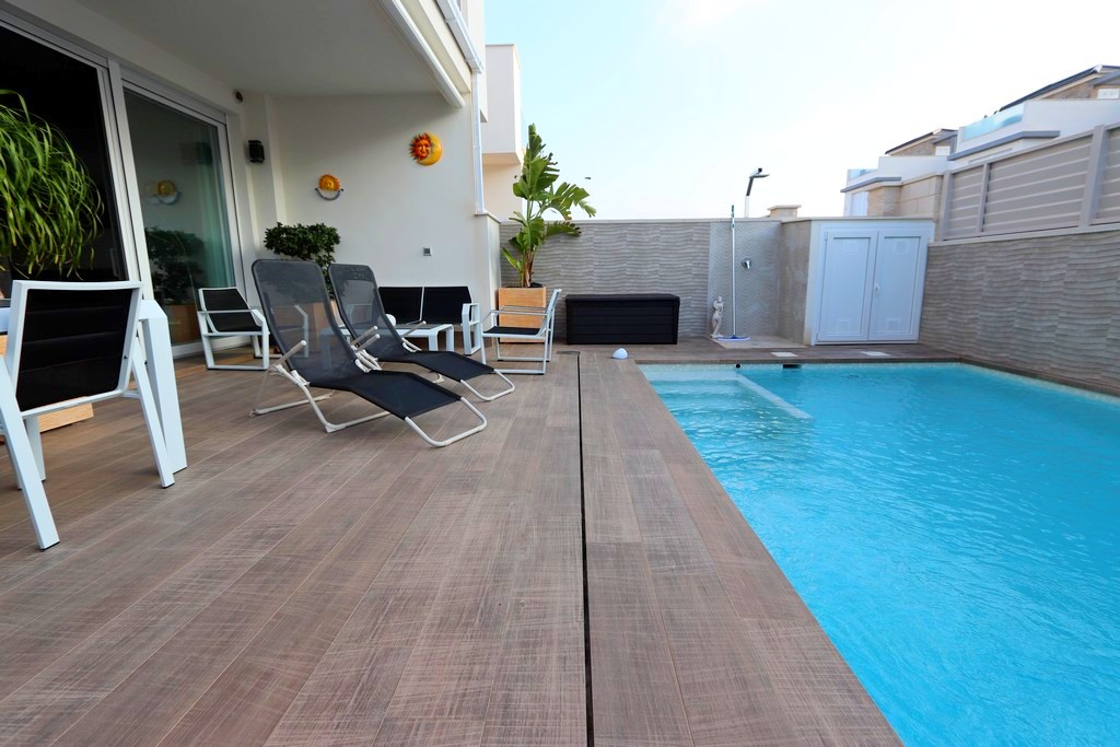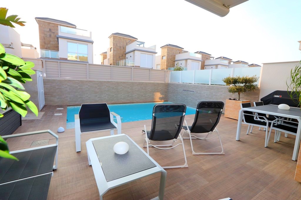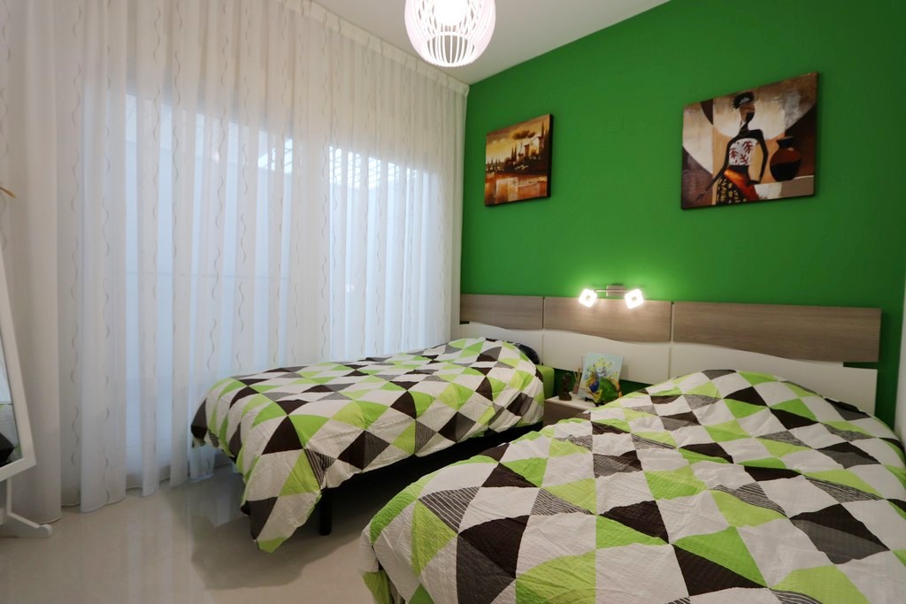 Meget romslig bungalow i 1. etasje av nyere konstruksjon i det populære boligområdet Torreta Florida. Den har 3 soverom, 2 bad, en stue med åpent kjøkken, patio og en stor terrasse med eget basseng. Det er en veldig hyggelig uteplass ved bassenget med plass til både solstoler og sittegrupper. Det følger også med parkeringsplass i garasjeanlegg.