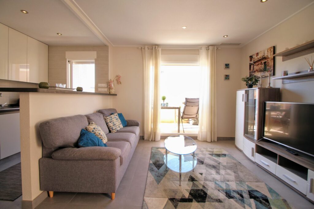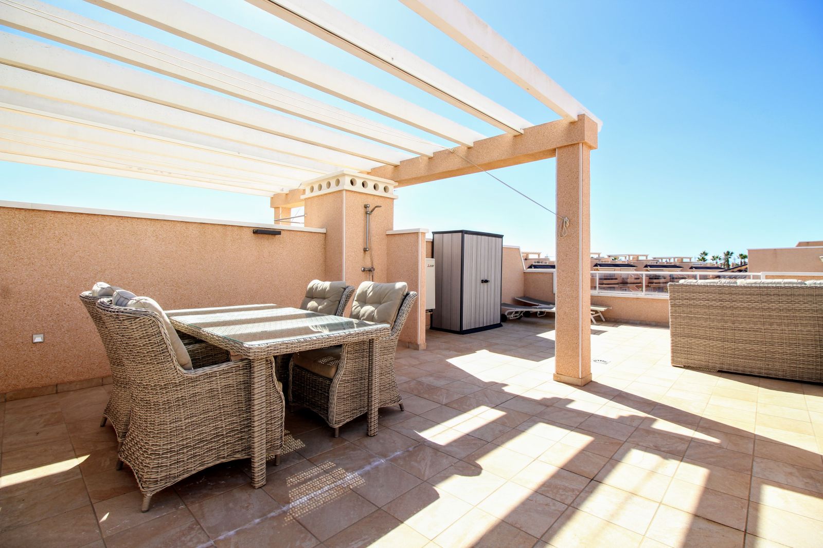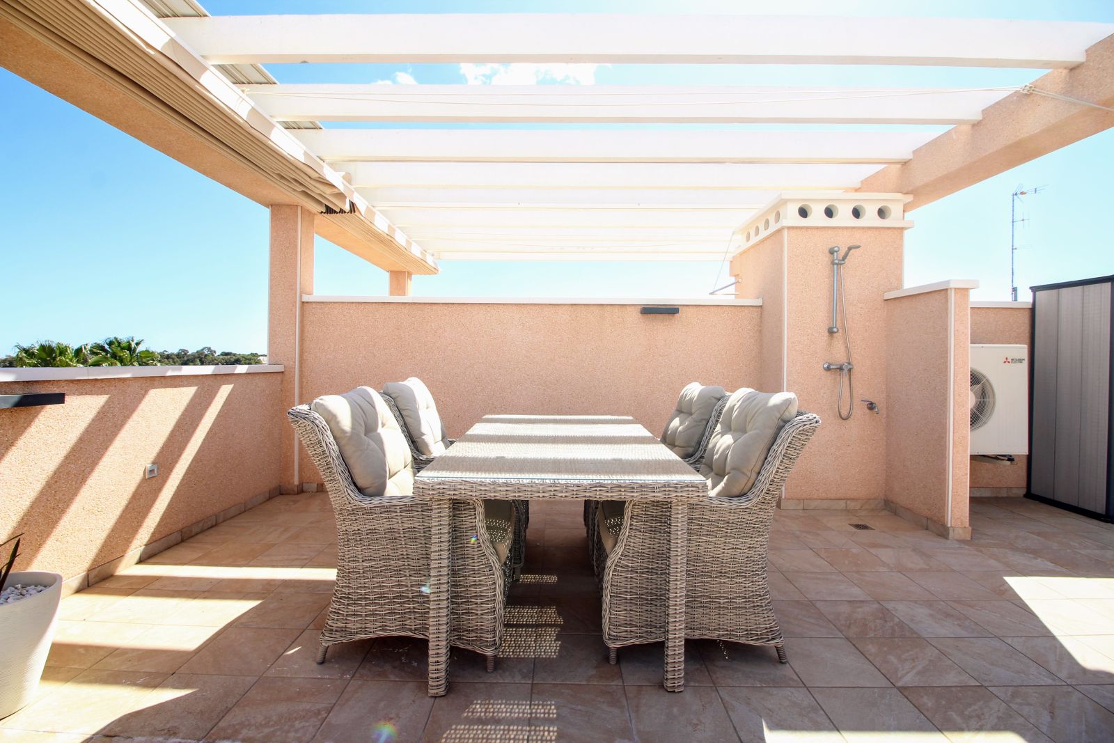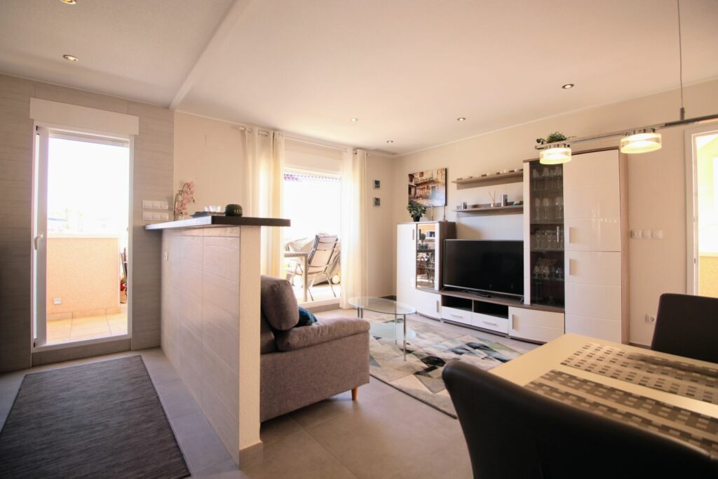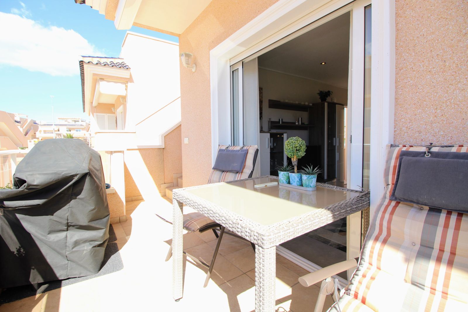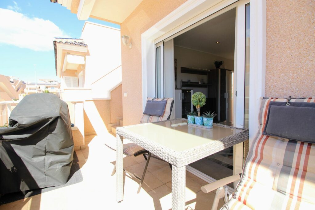 Vakker og funksjonell leilighet på Punta Prima, nær fasiliteter og strender. Eiendommen har en liten forgård med trapp opp til leiligheten, og noe lagringsplass under trapp. Stuen har store glassdører til sørvendt balkong som slipper inn mye naturlig lys. Kjøkkenet er velutstyrt. Hovedsoverommet har eget bad, det andre badet ligger ved siden av det andre soverommet. Fra balkongen er det trapp til takterrassen hvor du har et spisebord, en utendørs sofa og en markise som beskytter deg mot solen. Balkongen og takterrassen har utsikt til fellesområdet og spa-området.