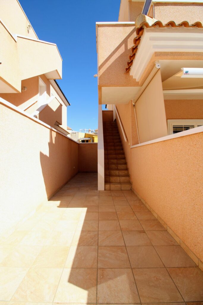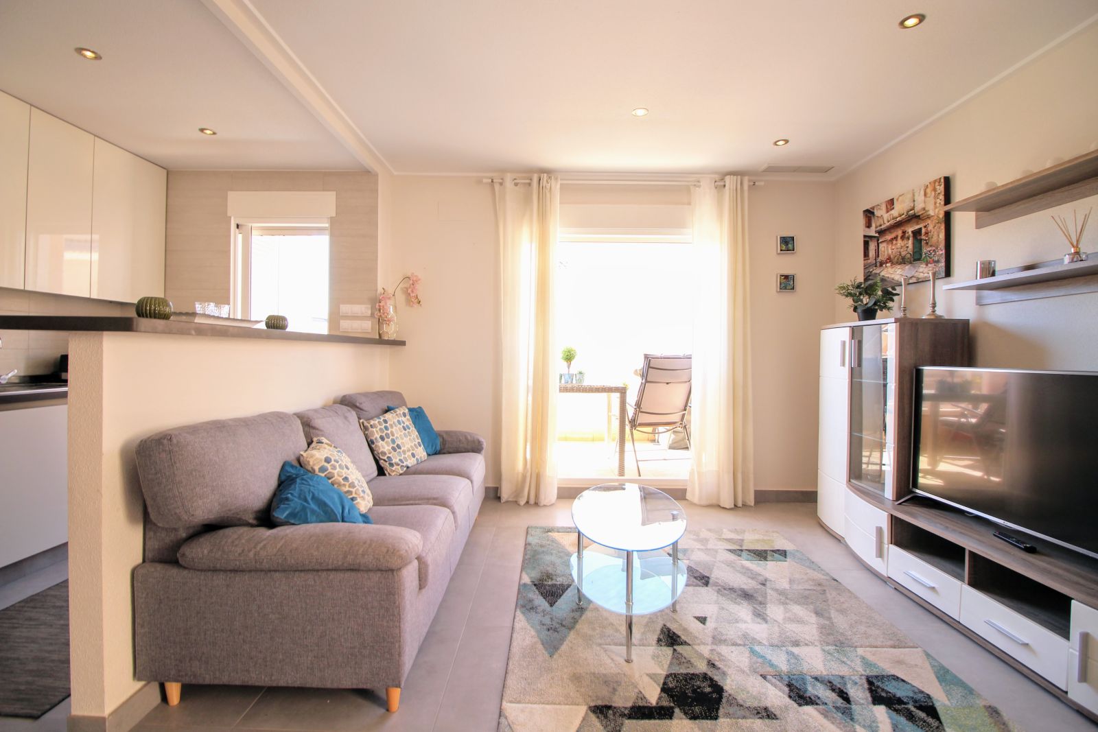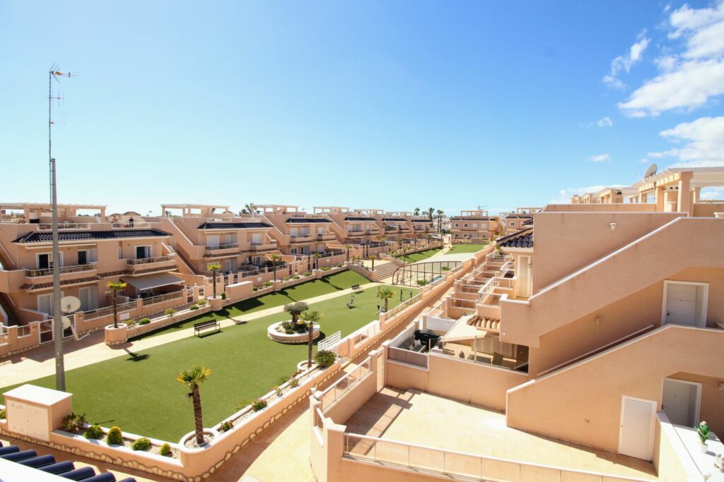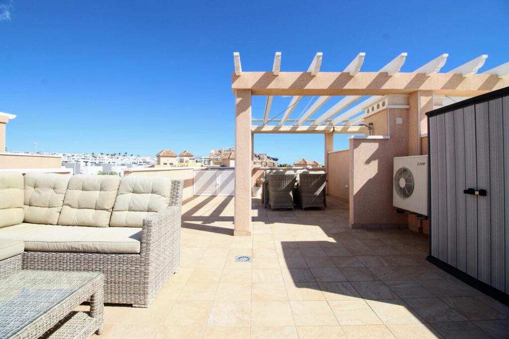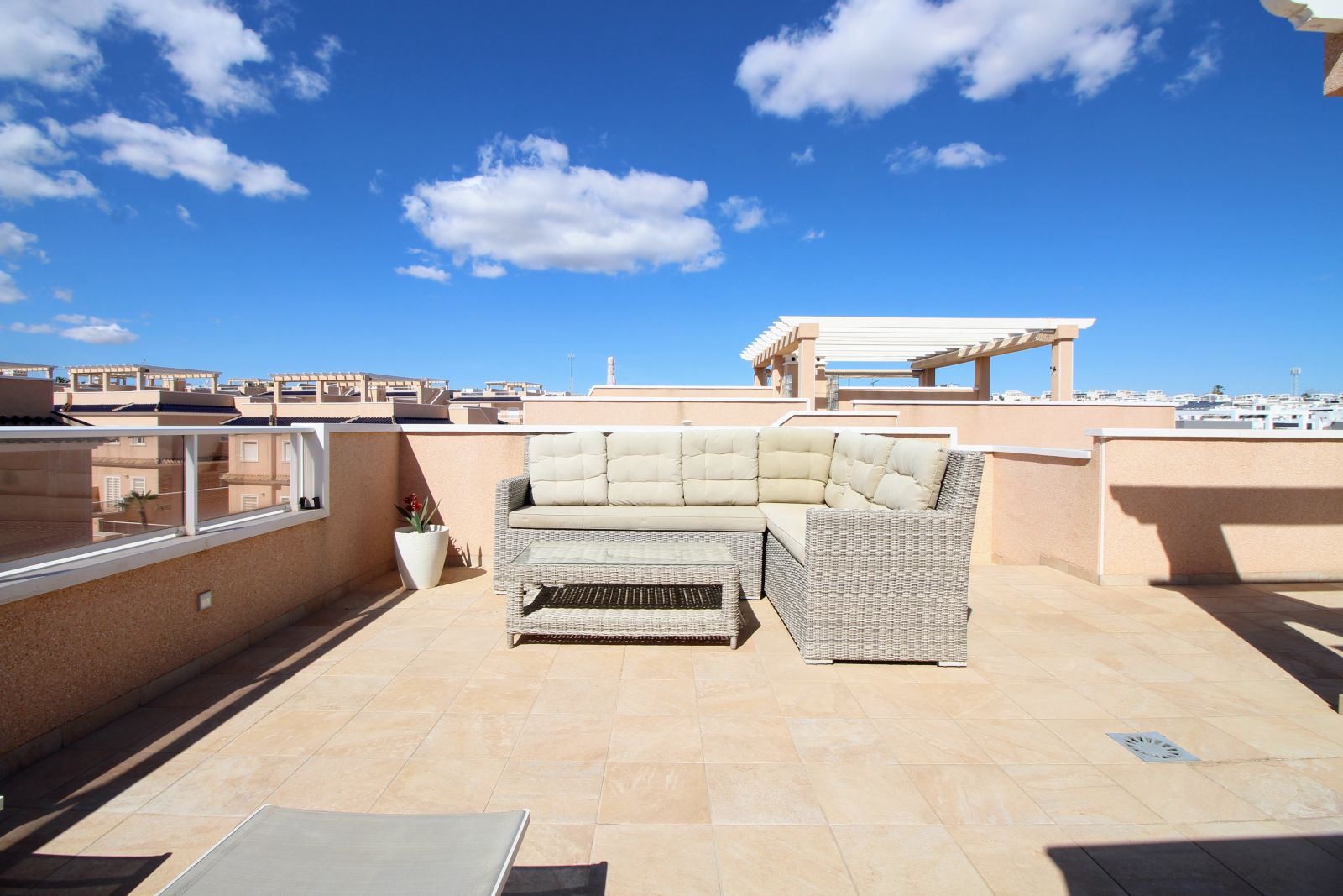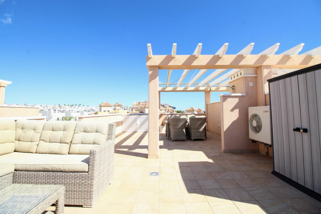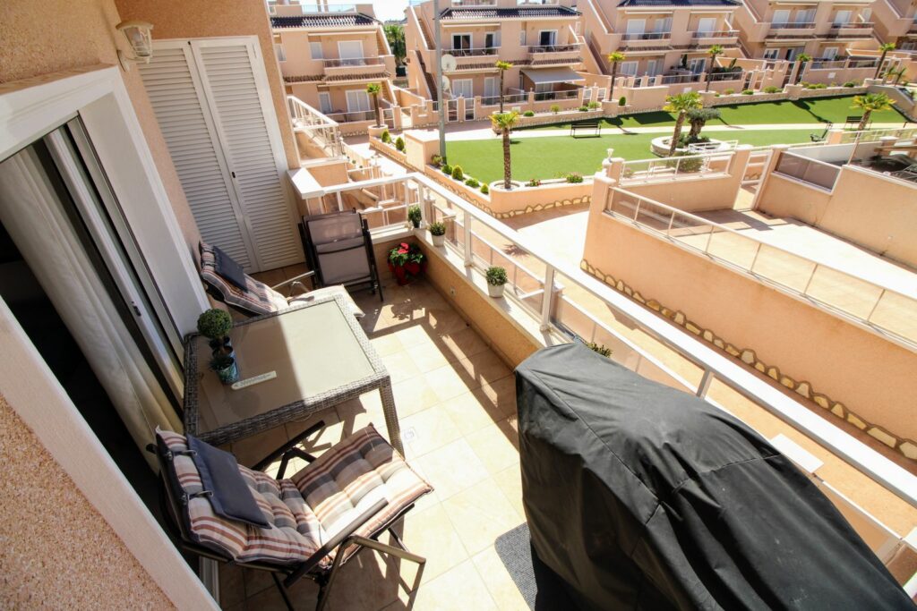 Vakker og funksjonell leilighet på Punta Prima, nær fasiliteter og strender. Eiendommen har en liten forgård med trapp opp til leiligheten, og noe lagringsplass under trapp. Stuen har store glassdører til sørvendt balkong som slipper inn mye naturlig lys. Kjøkkenet er velutstyrt. Hovedsoverommet har eget bad, det andre badet ligger ved siden av det andre soverommet. Fra balkongen er det trapp til takterrassen hvor du har et spisebord, en utendørs sofa og en markise som beskytter deg mot solen. Balkongen og takterrassen har utsikt til fellesområdet og spa-området.
