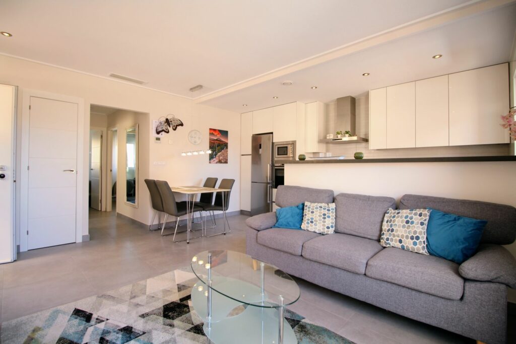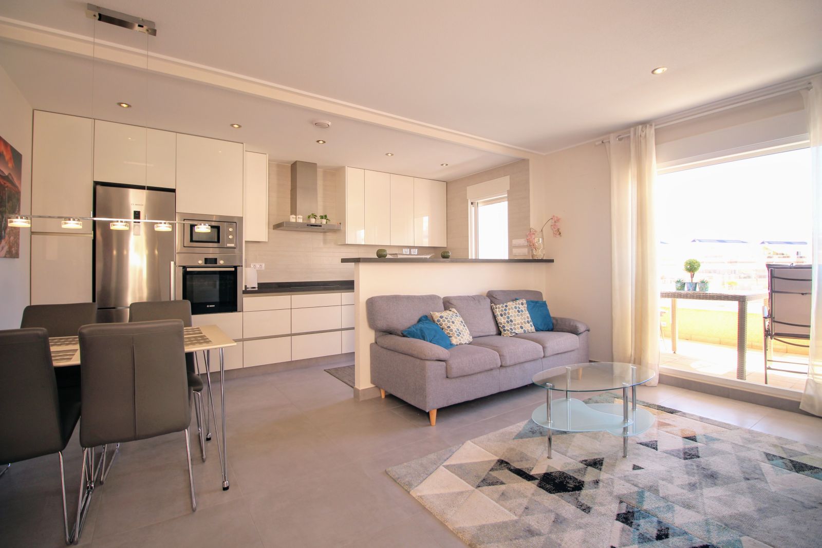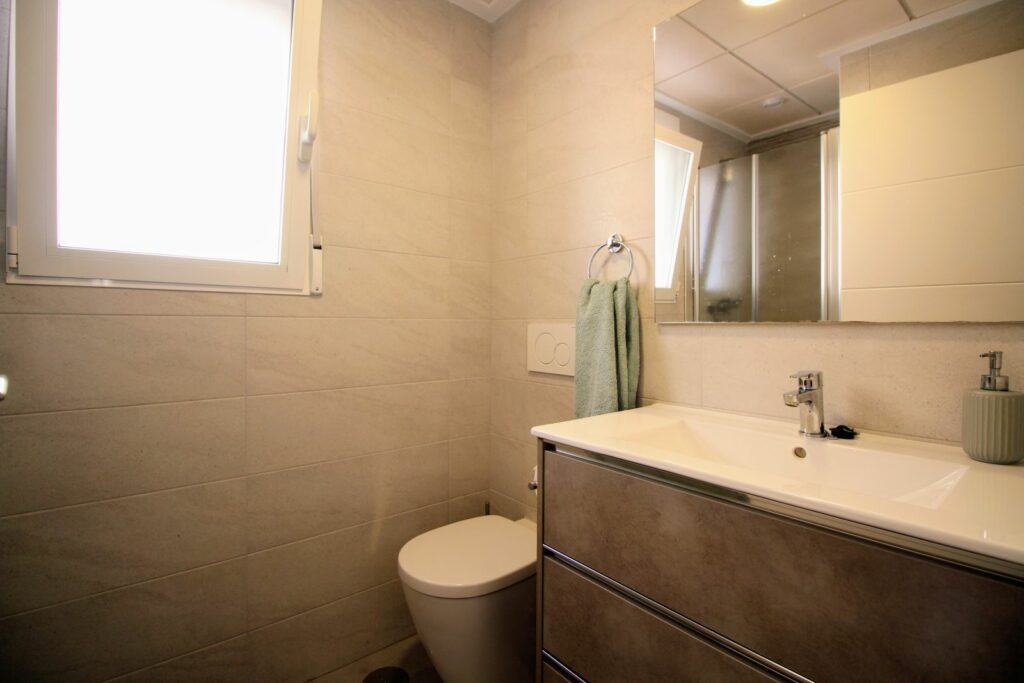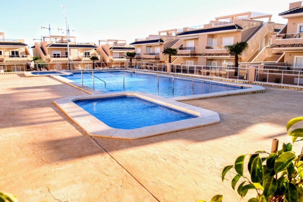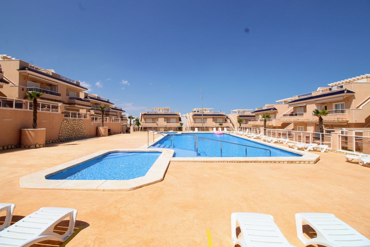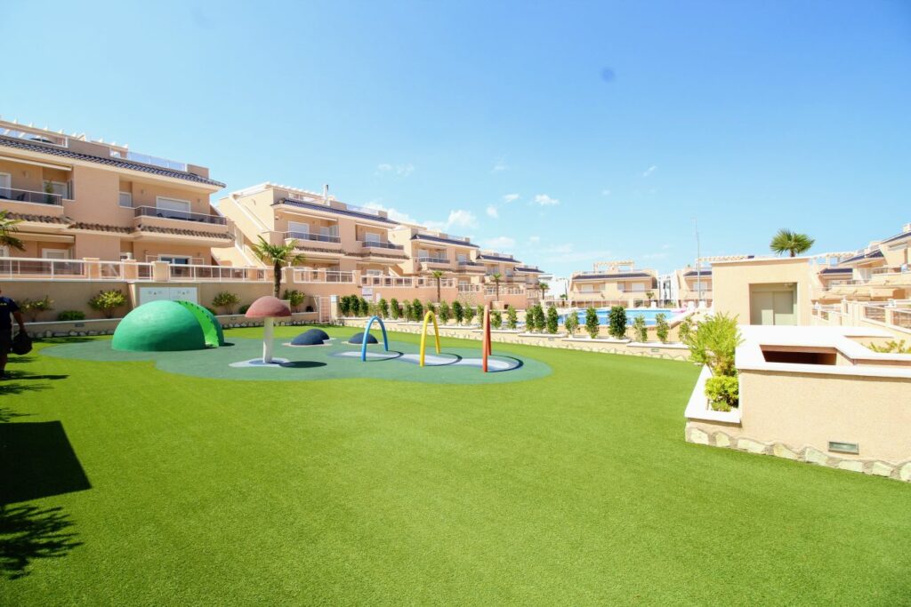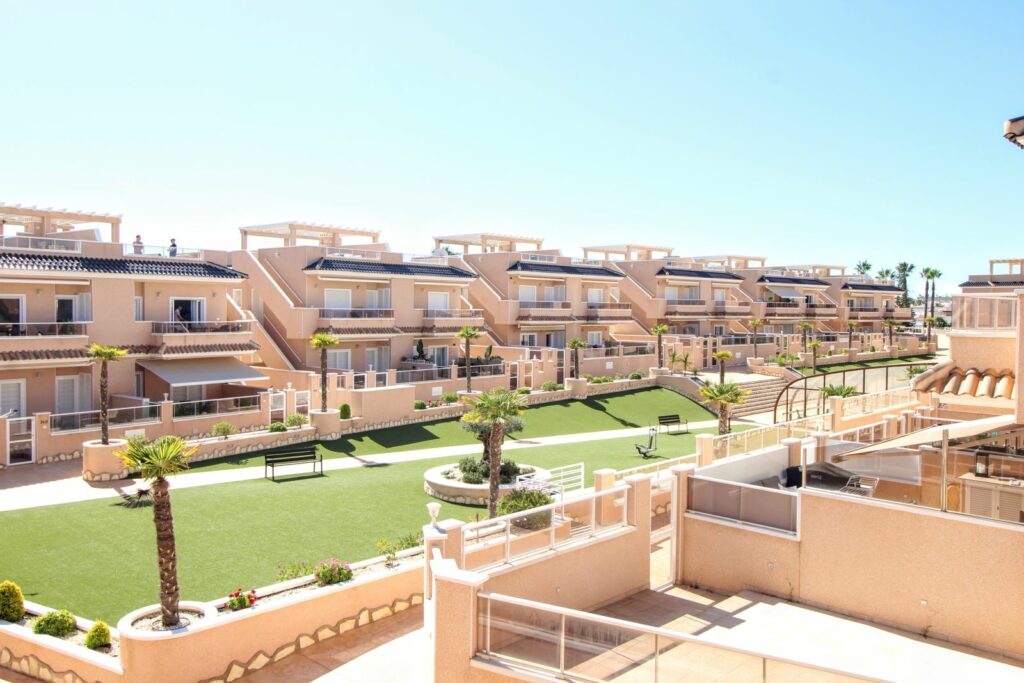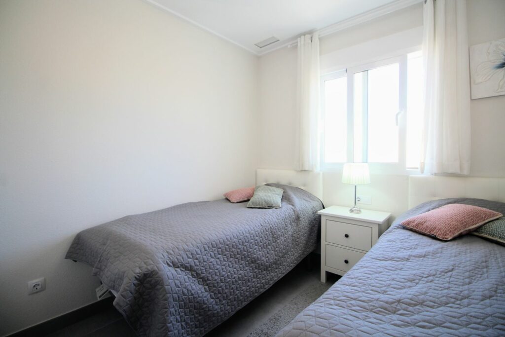 Vakker og funksjonell leilighet på Punta Prima, nær fasiliteter og strender. Eiendommen har en liten forgård med trapp opp til leiligheten, og noe lagringsplass under trapp. Stuen har store glassdører til sørvendt balkong som slipper inn mye naturlig lys. Kjøkkenet er velutstyrt. Hovedsoverommet har eget bad, det andre badet ligger ved siden av det andre soverommet. Fra balkongen er det trapp til takterrassen hvor du har et spisebord, en utendørs sofa og en markise som beskytter deg mot solen. Balkongen og takterrassen har utsikt til fellesområdet og spa-området.