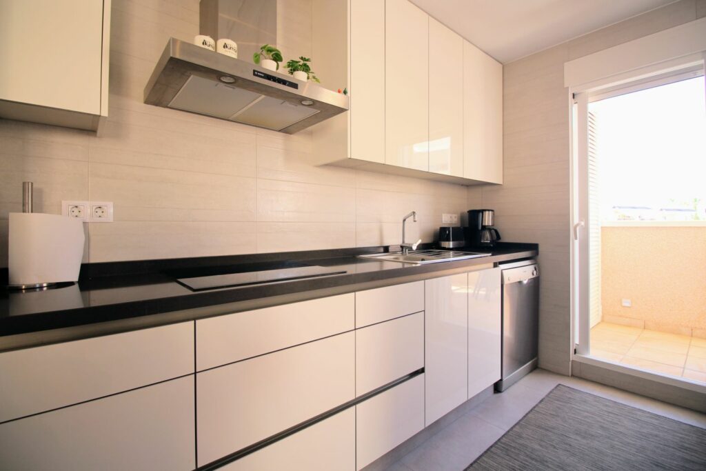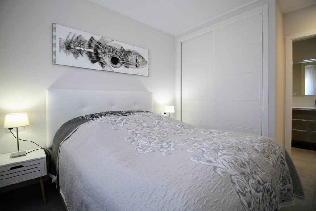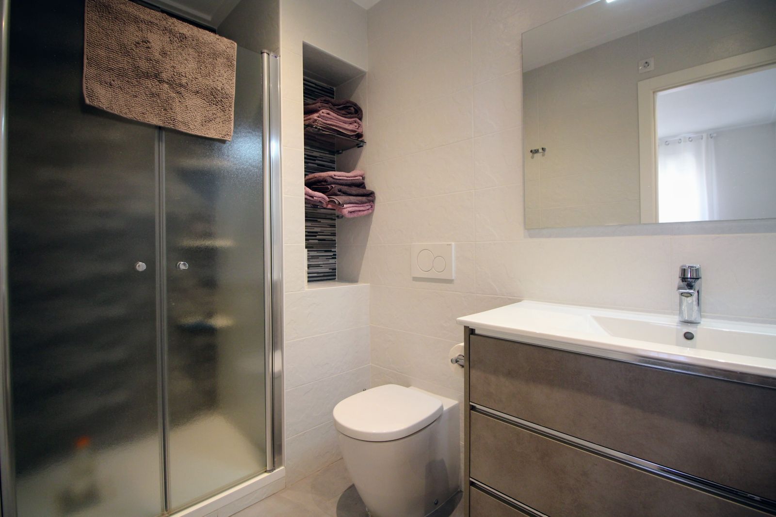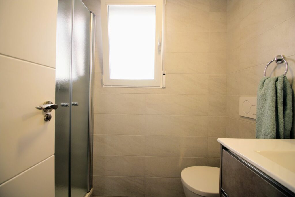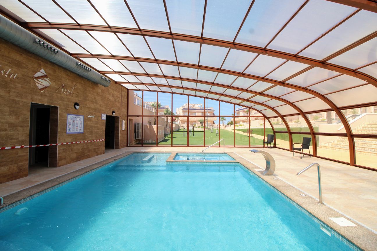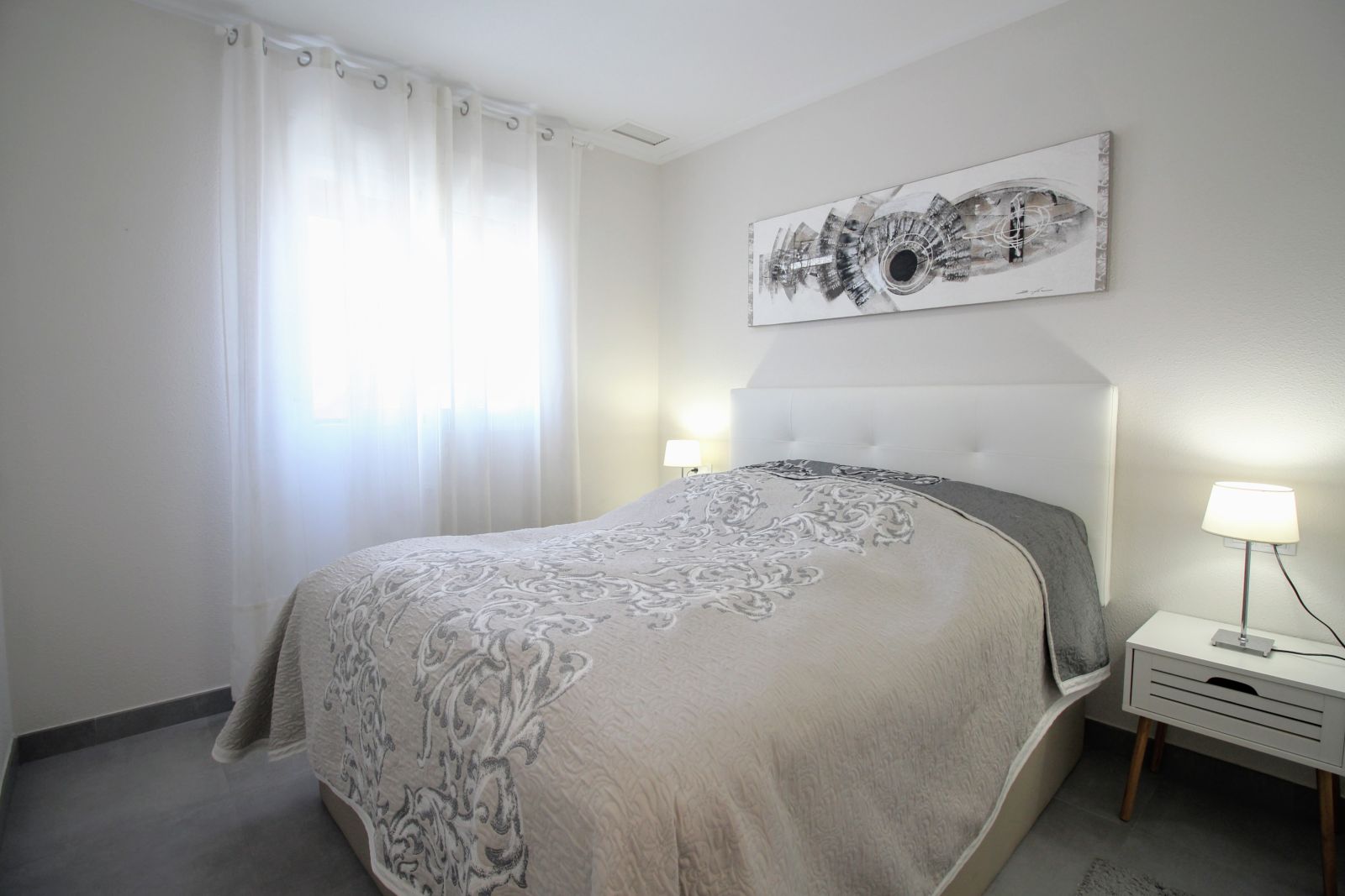 Vakker og funksjonell leilighet på Punta Prima, nær fasiliteter og strender. Eiendommen har en liten forgård med trapp opp til leiligheten, og noe lagringsplass under trapp. Stuen har store glassdører til sørvendt balkong som slipper inn mye naturlig lys. Kjøkkenet er velutstyrt. Hovedsoverommet har eget bad, det andre badet ligger ved siden av det andre soverommet. Fra balkongen er det trapp til takterrassen hvor du har et spisebord, en utendørs sofa og en markise som beskytter deg mot solen. Balkongen og takterrassen har utsikt til fellesområdet og spa-området.