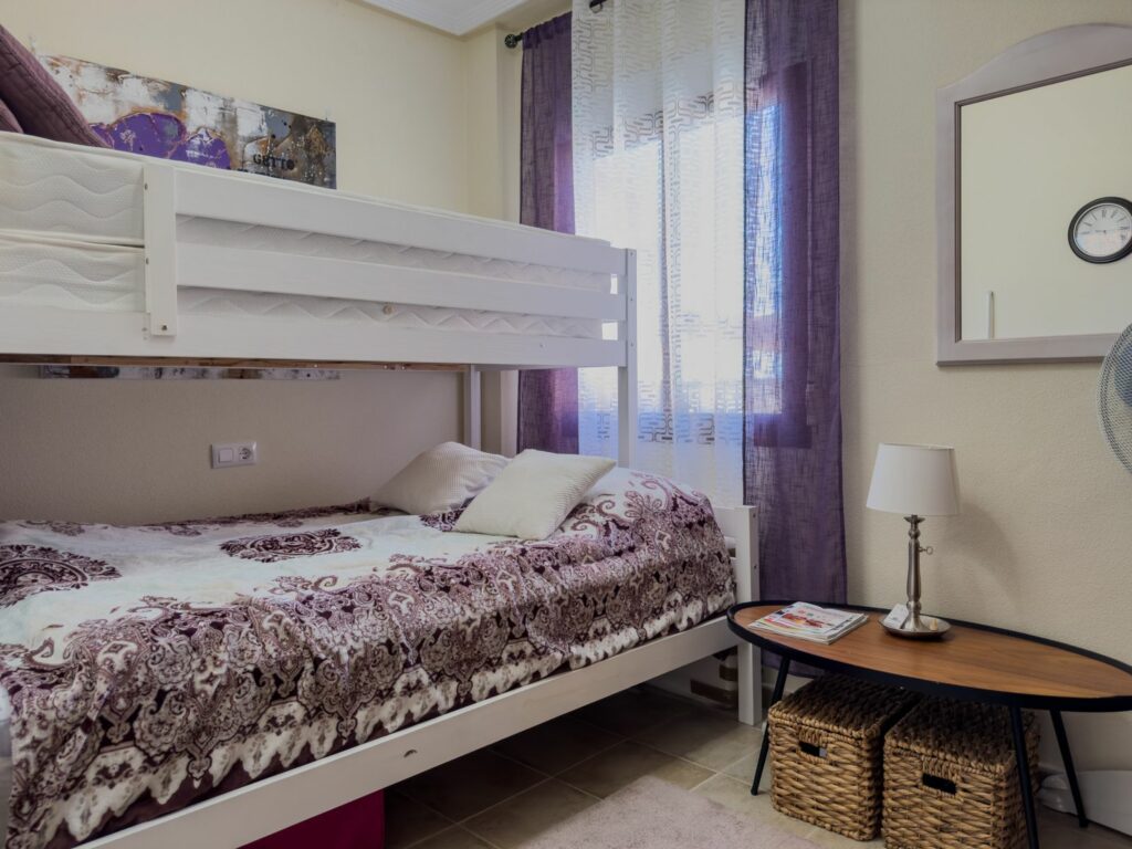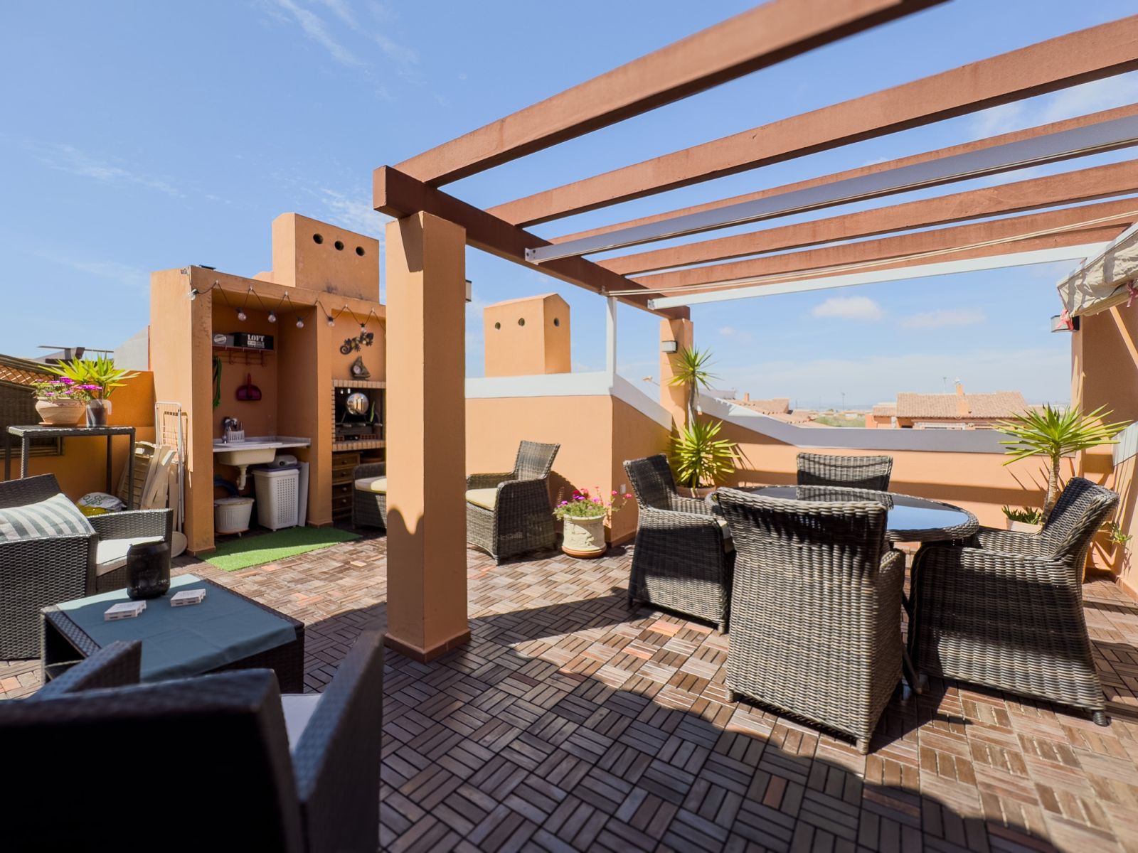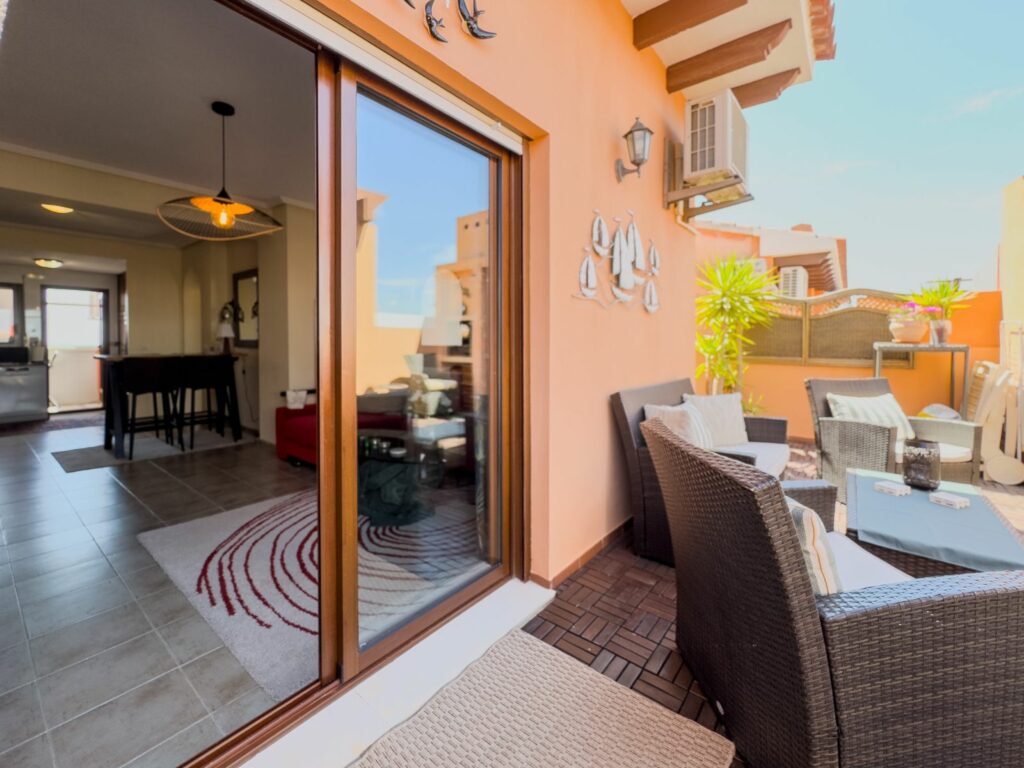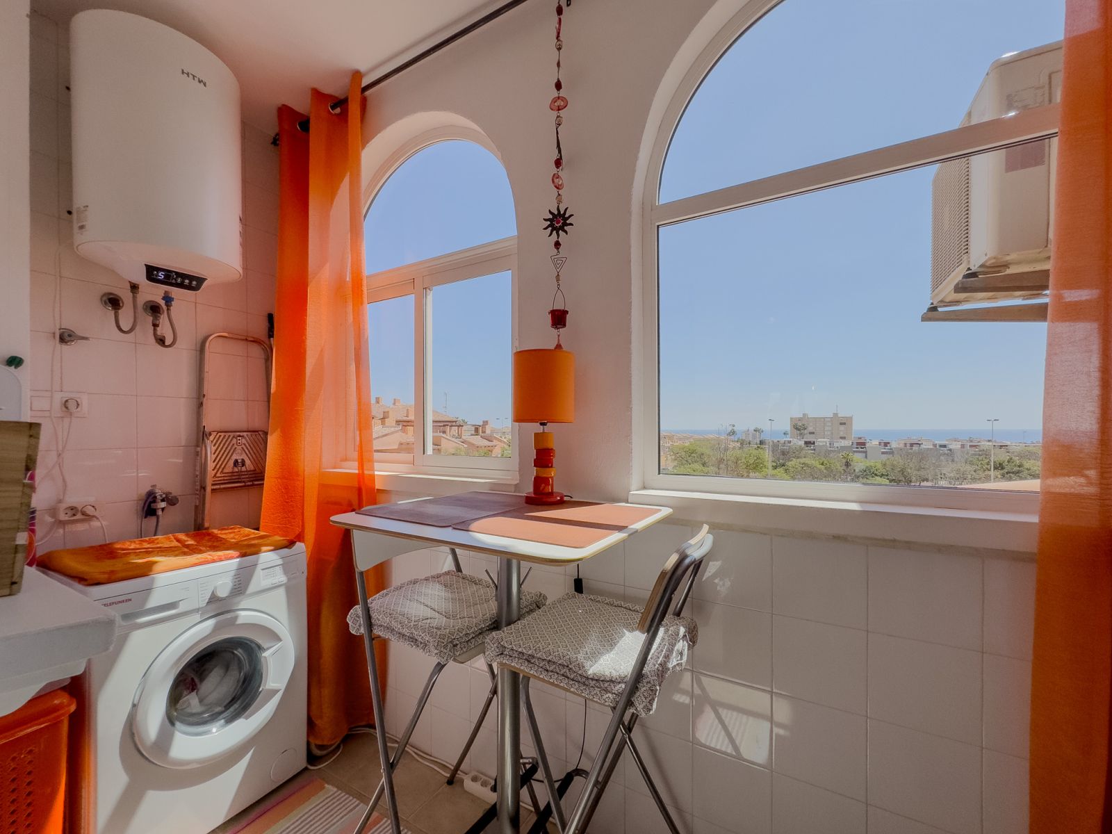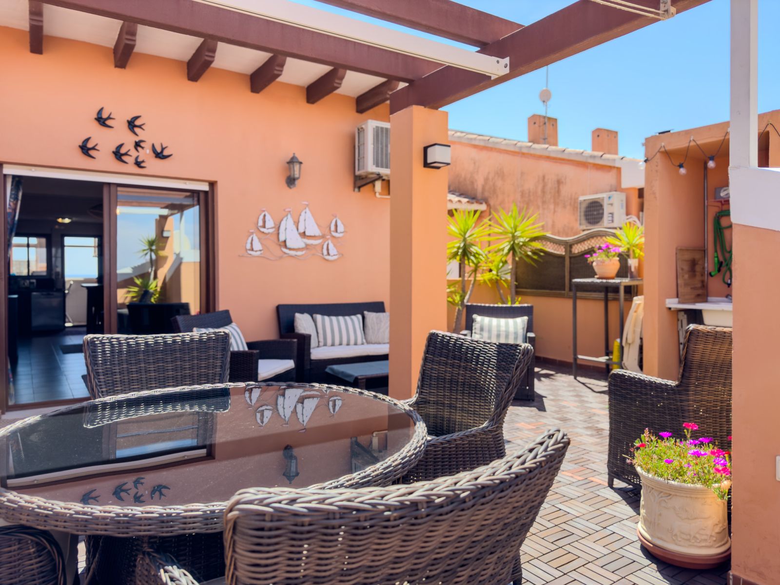 Fra stuen er det store glassdører til terrassen hvor du kan nyte solen og grille. Det er også en pergola som beskytter deg mot solen på de varmeste dagene. Hovedsoverommet har en dobbeltseng og aircondition, det andre soverommet har køyesenger. Det er også aircondition i stuen. Bak kjøkkenet er det vaskerom med frokostbord og havutsikt.