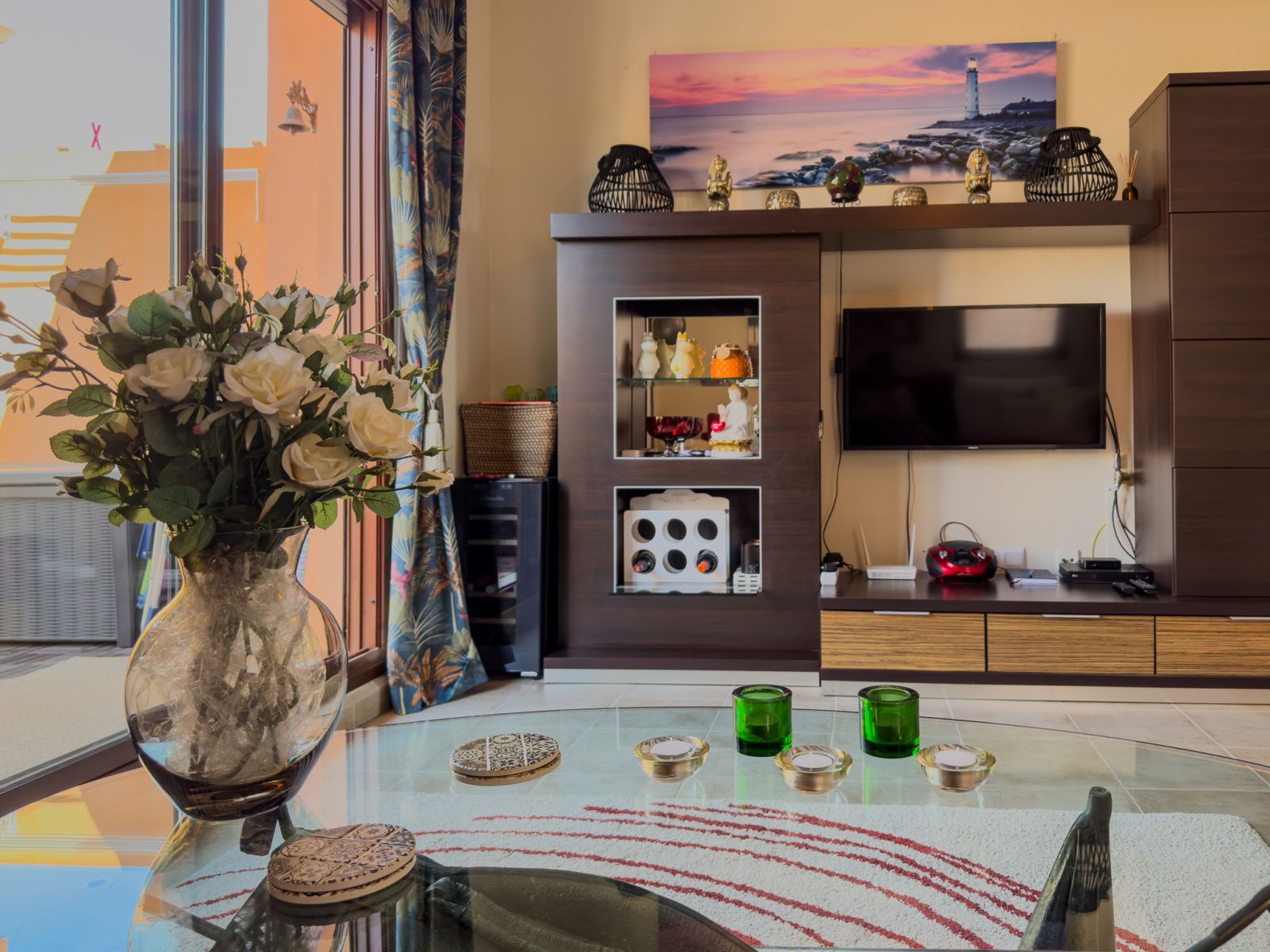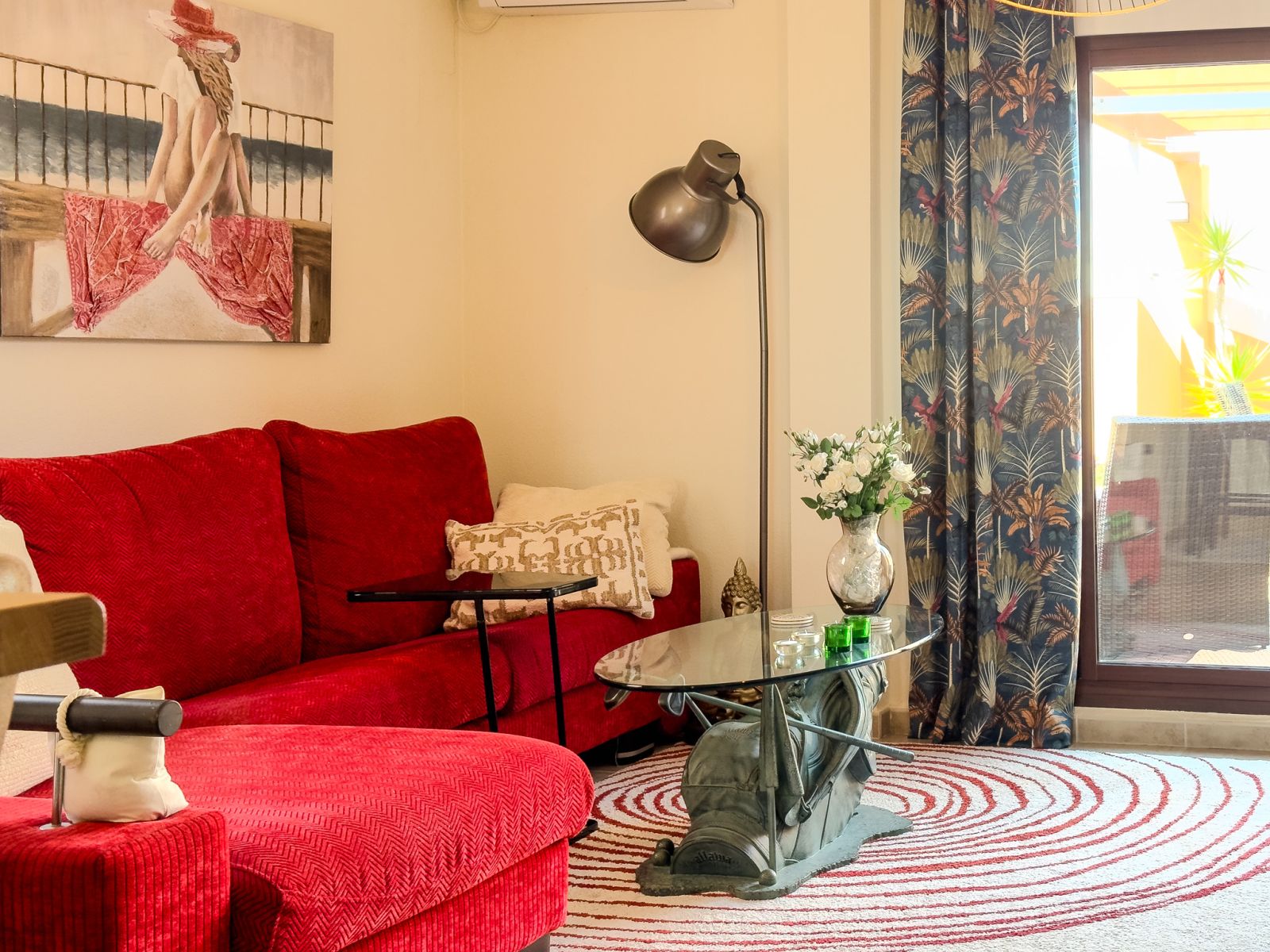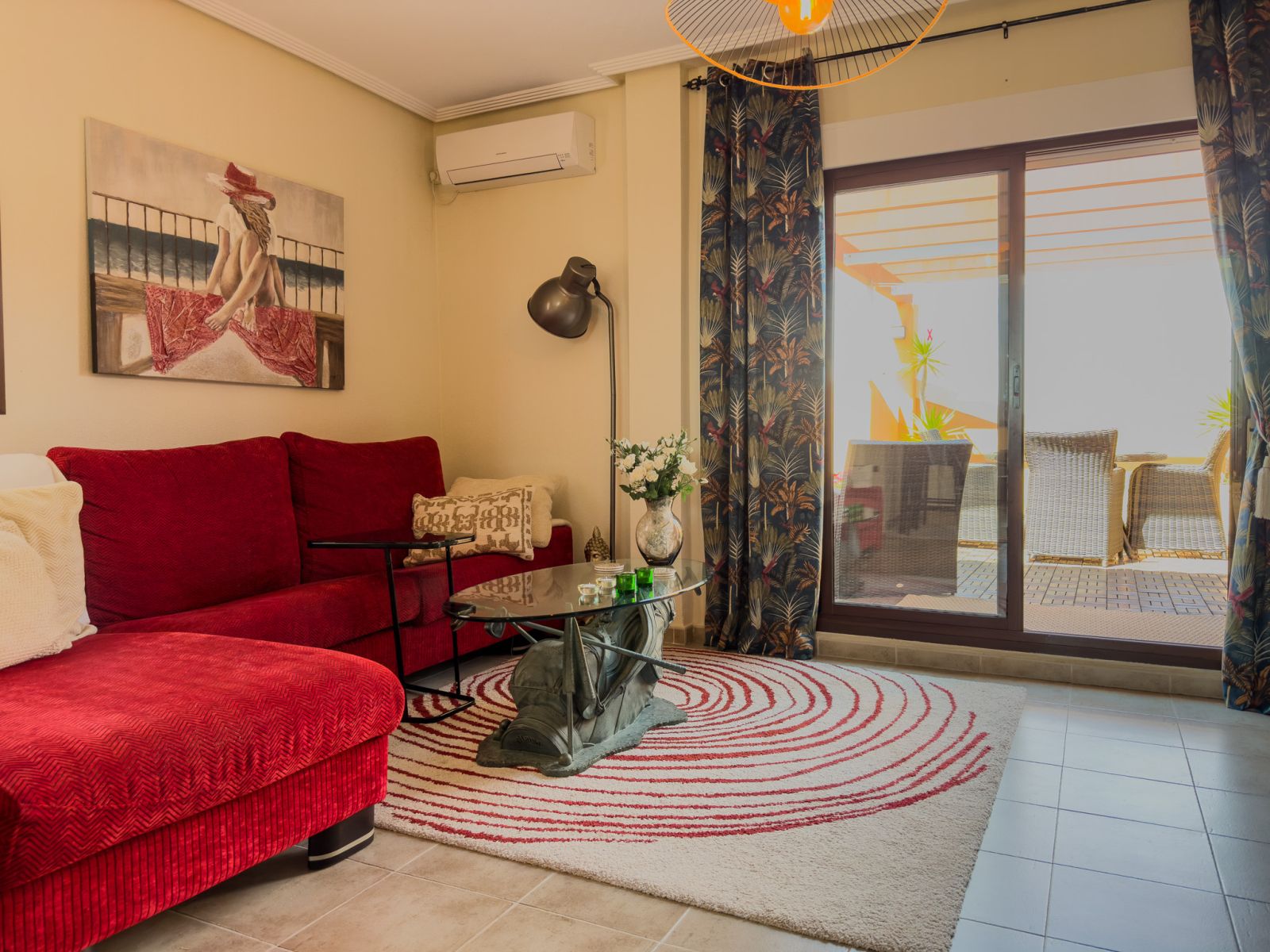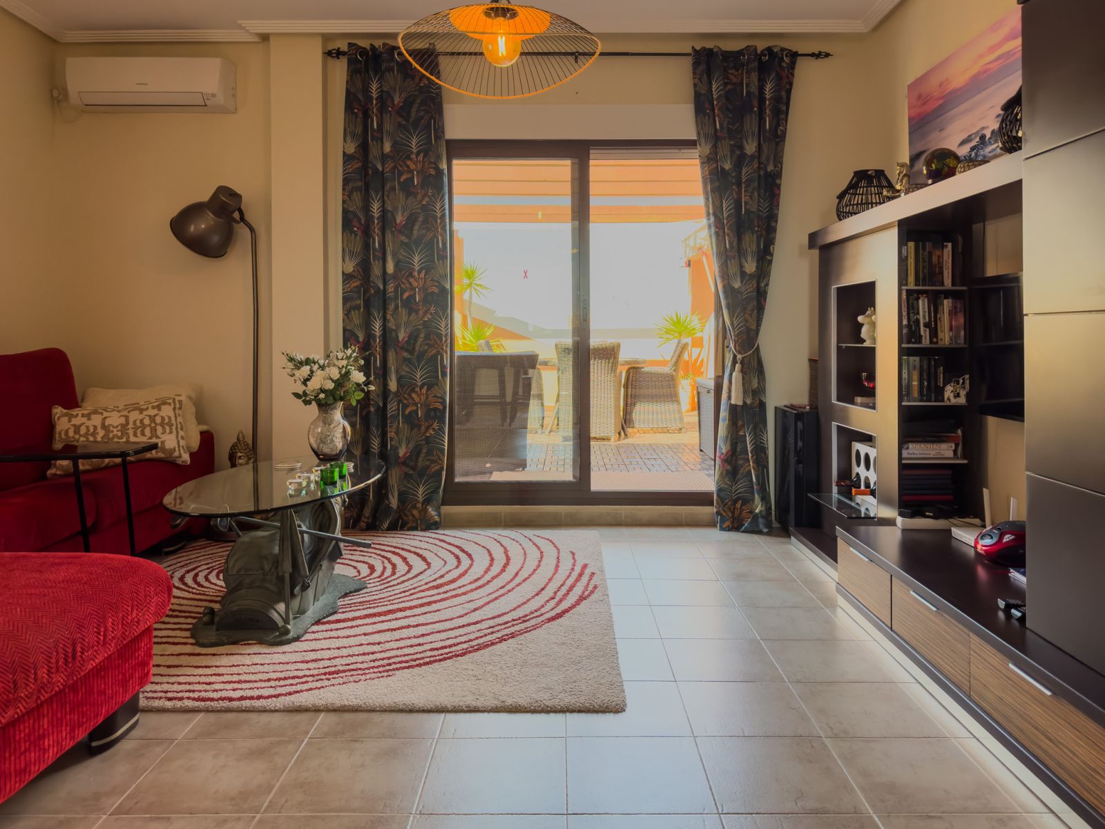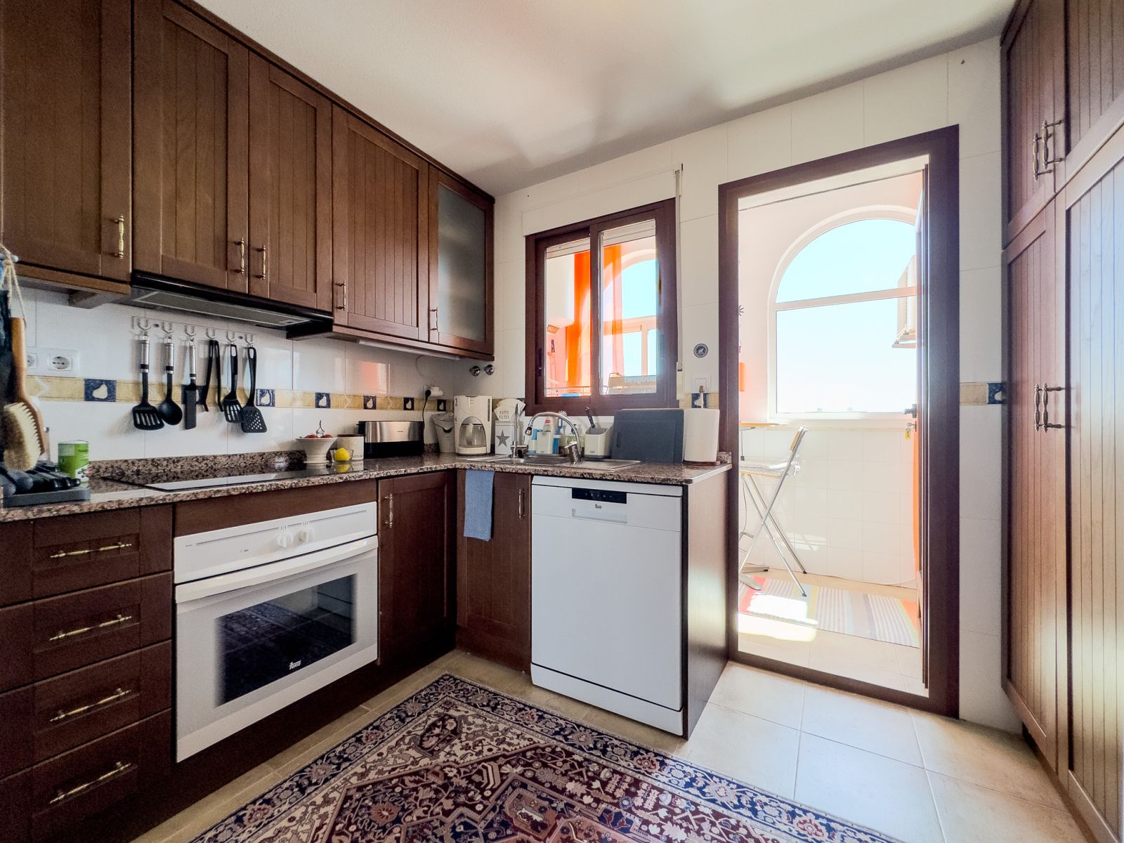 Fra stuen er det store glassdører til terrassen hvor du kan nyte solen og grille. Det er også en pergola som beskytter deg mot solen på de varmeste dagene. Hovedsoverommet har en dobbeltseng og aircondition, det andre soverommet har køyesenger. Det er også aircondition i stuen. Bak kjøkkenet er det vaskerom med frokostbord og havutsikt.