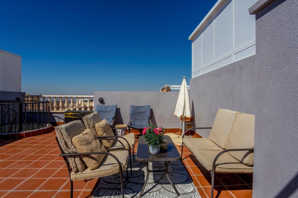 Ved inngangspartiet er det en liten hyggelig terrasse og fra kjøkkenet er det utgang til en patio hvor du finner trappen opp til den fantastiske takterrassen på 52 m2. Herfra er det nydelig utsikt over byen, havet og saltsjøen.
