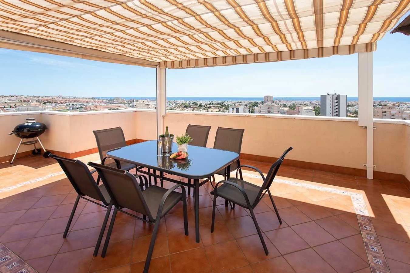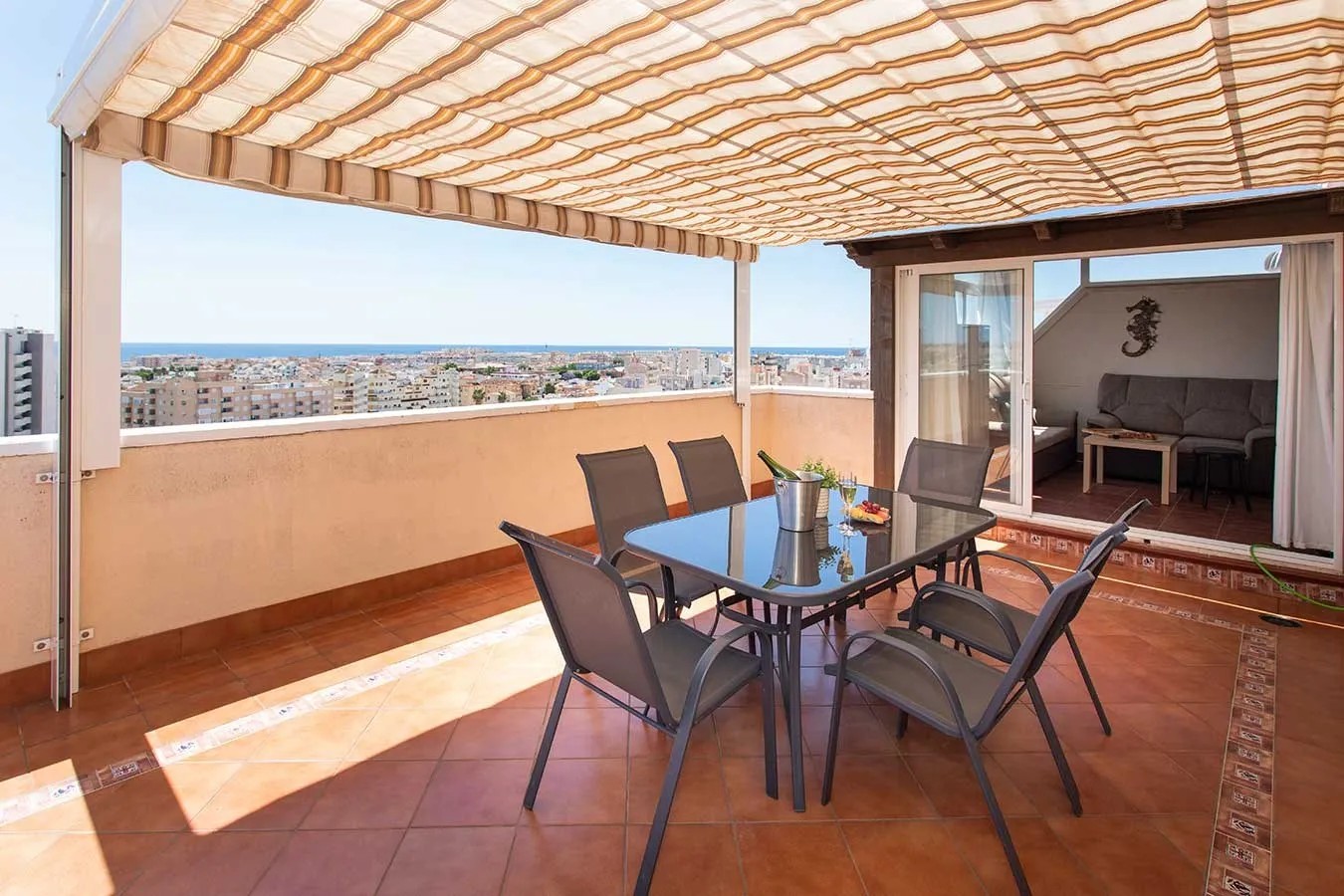 Fra stuen er det utgang til en stor solrik terrasse på 50 m2 med flott utsikt over byen, havet, saltsjøene og fjell i horisonten.