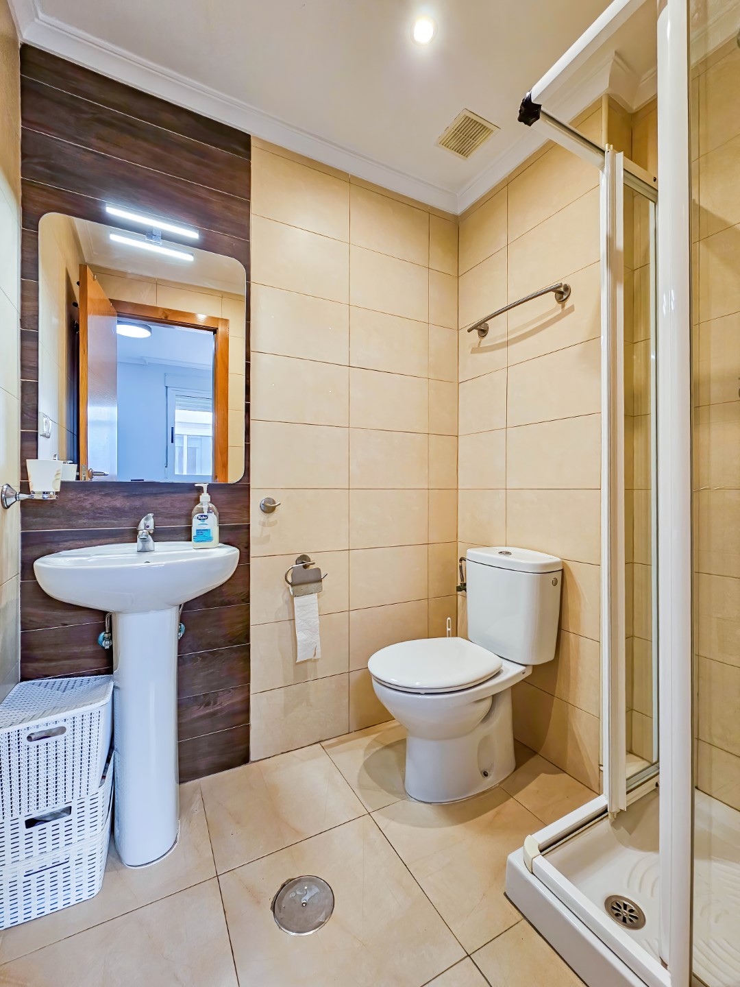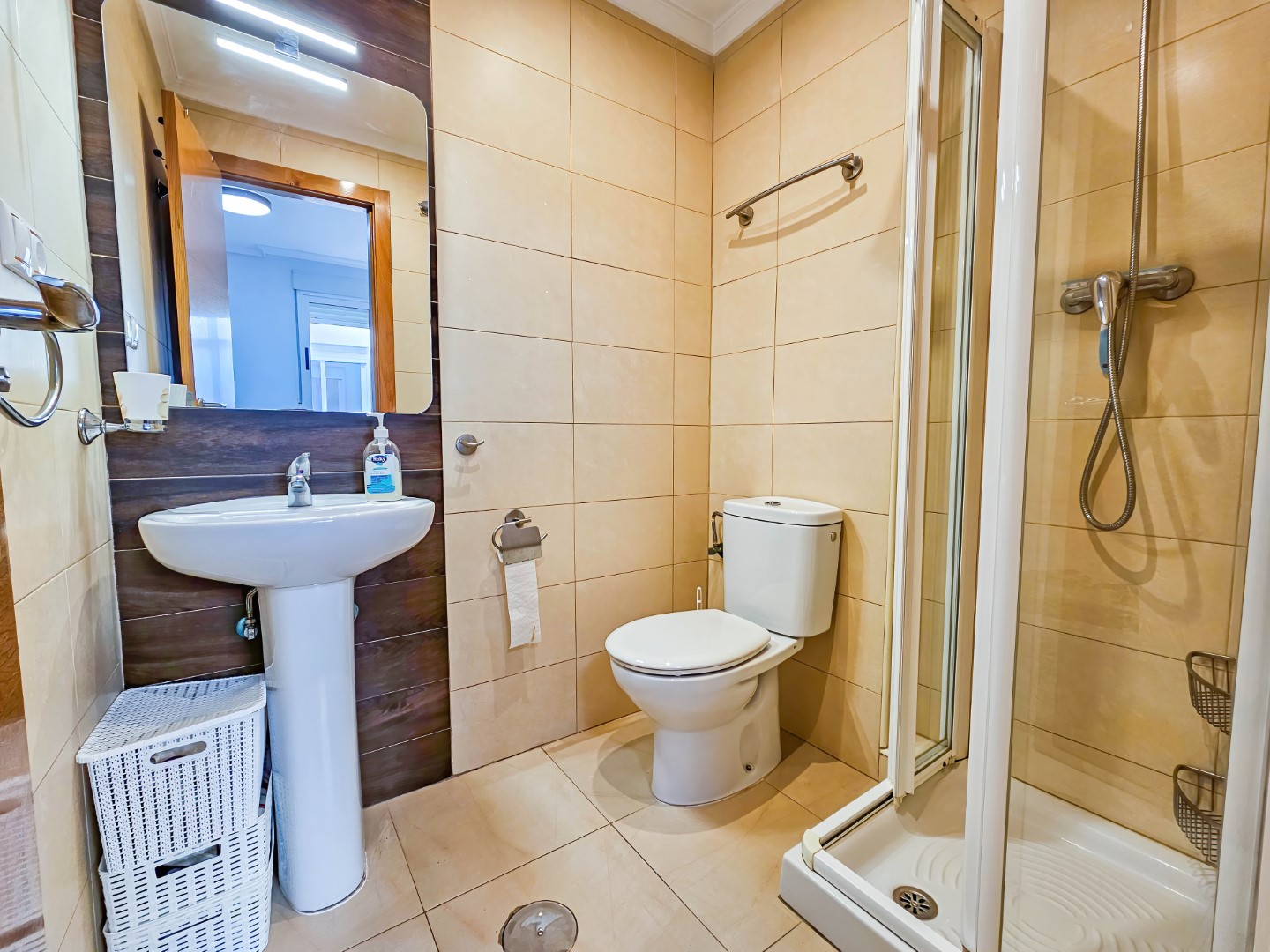 Leiligheten har 3 soverom med garderobeskap. Hoved soverommet har eget bad og i tillegg er det et annet komplett bad. Det er en fin stue/spisestue med åpen løsning mot kjøkkenet.