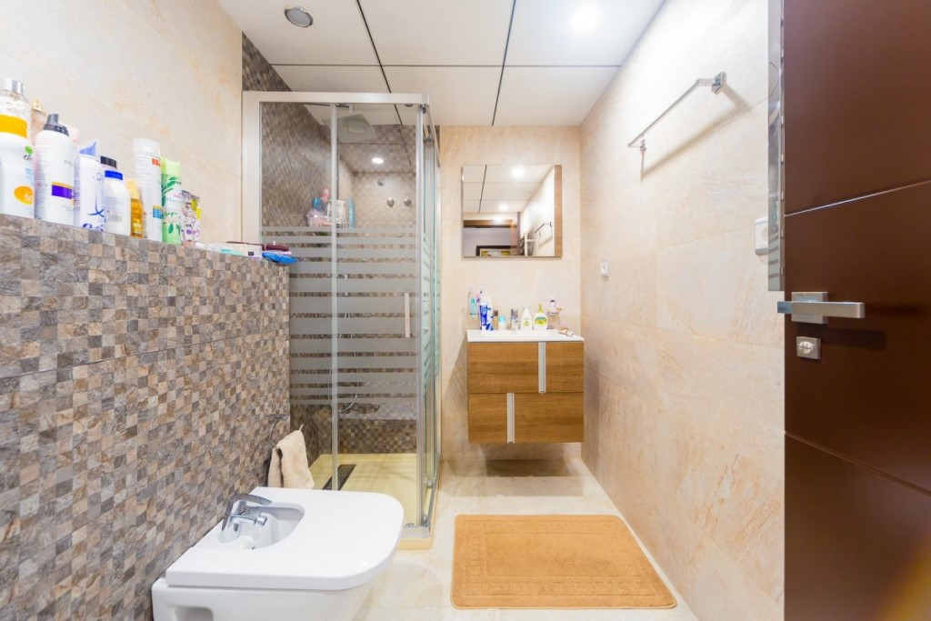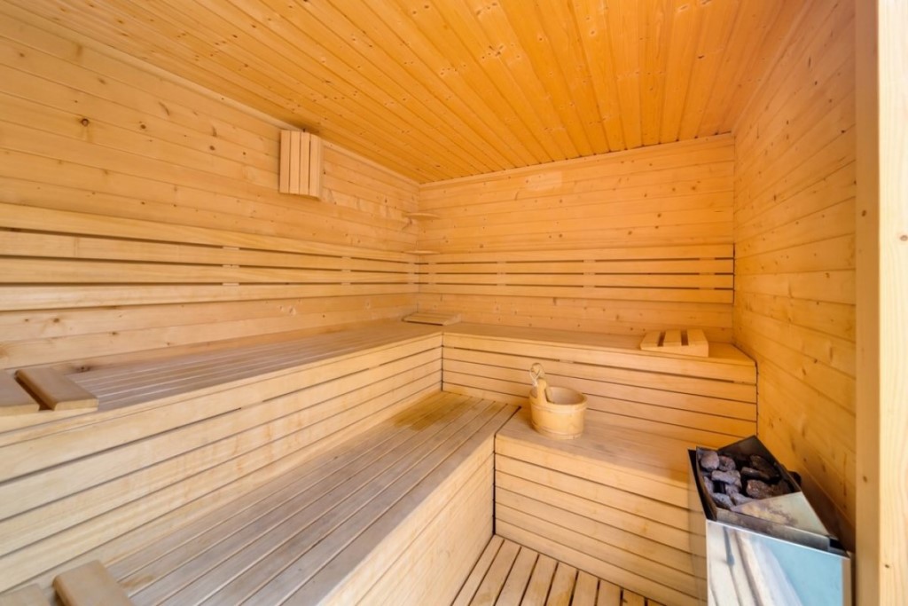 Det er et flott felles område med basseng, treningsapparater, lekeplass og badstue.