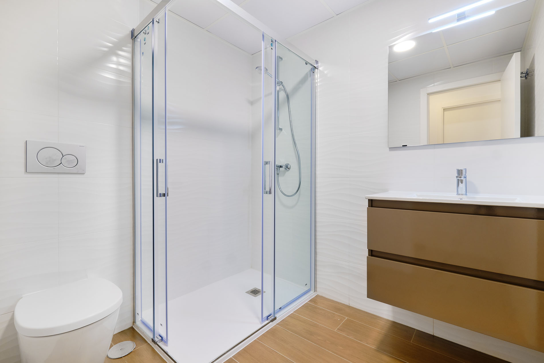 Boligene består av 2 eller 3 soverom, 2 bad, åpen kjøkkenløsning mot stuen og romslige terrasser. Det er moderne arkitektur og store vindusflater.