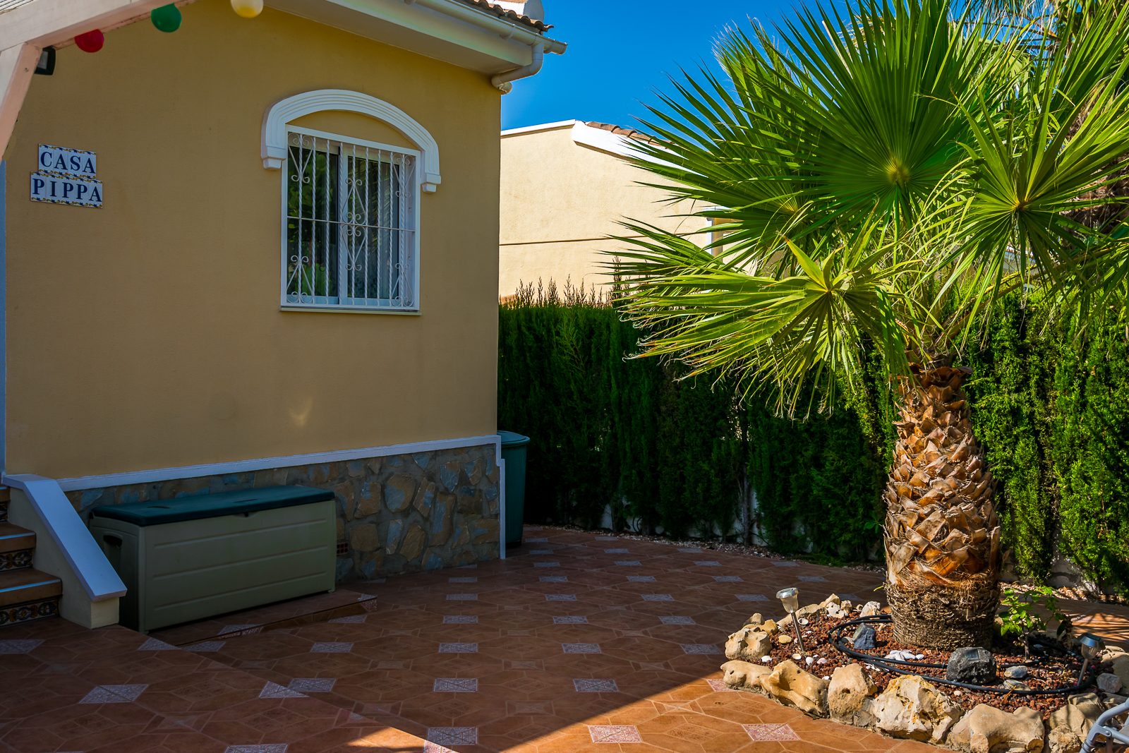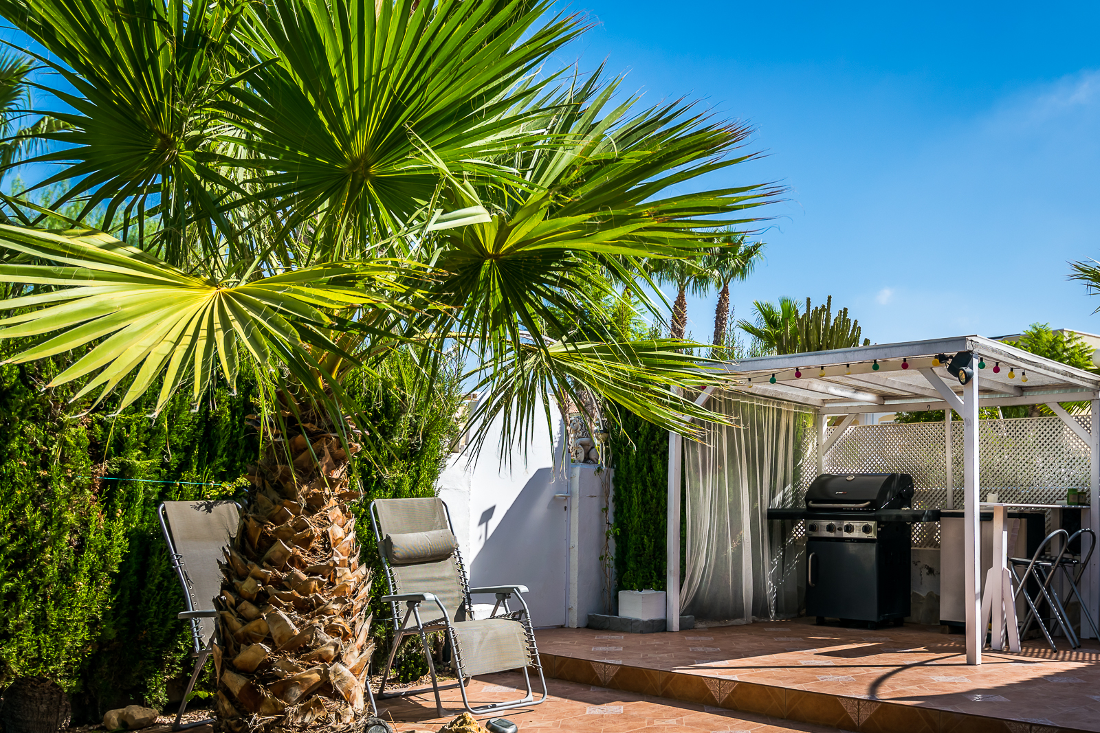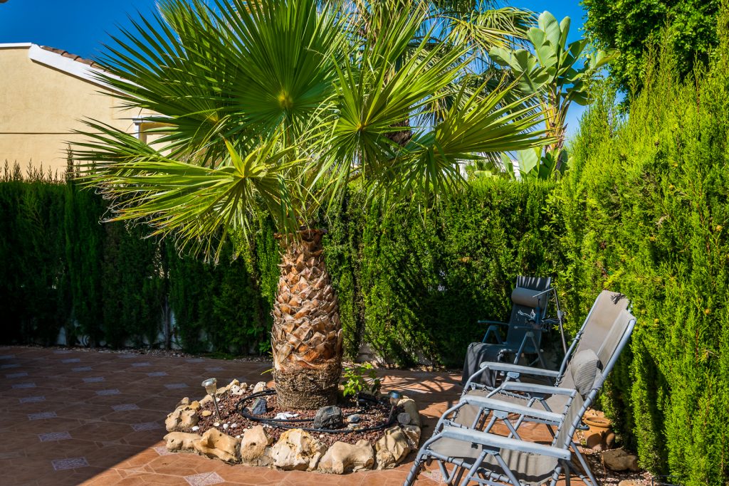 Hagen er stor og går rundt huset, hvilket gir maksimale solforhold under hele dagen. Her er det godt med plass for sittegrupper, solstoler m.m.