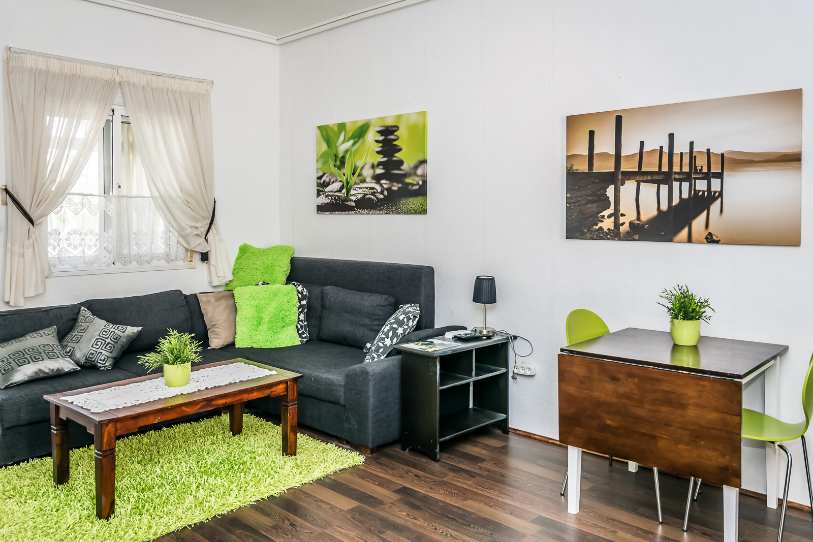 Stuen har plass for både sofa og spisestue.